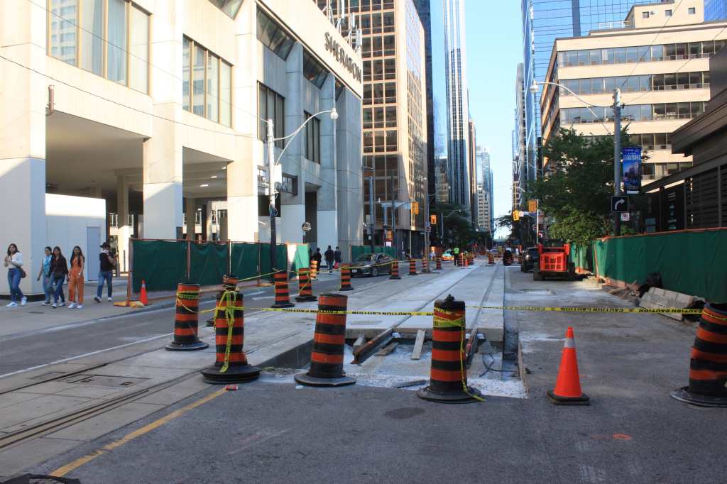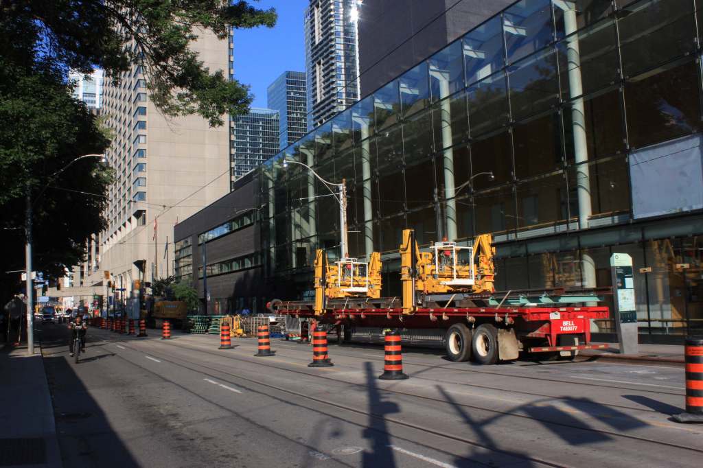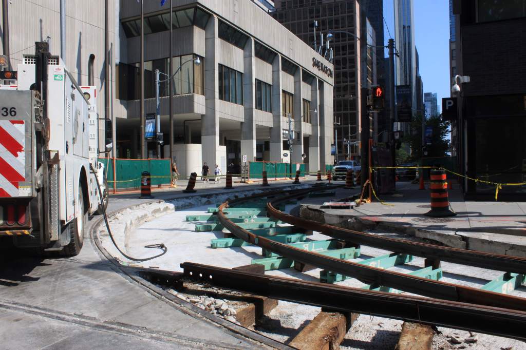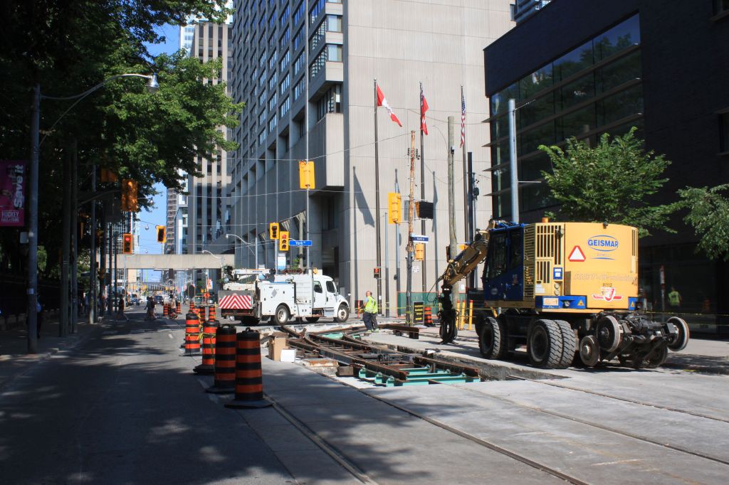 The work on Spadina between King and Queens Quay, and later between College and Bloor, involves rebuilding the streetcar overhead to be fully pantograph compliant, as opposed to a hybrid pole/panto system. Some streetcar track repairs are likely during the streetcar replacement. This work should not take six months, the planned Spadina closure. This was originally announced as running only to October, but now to December. At Spadina Station the first stage of streetcar platform extension will occur taking advantage of excavation for a nearby condo project.