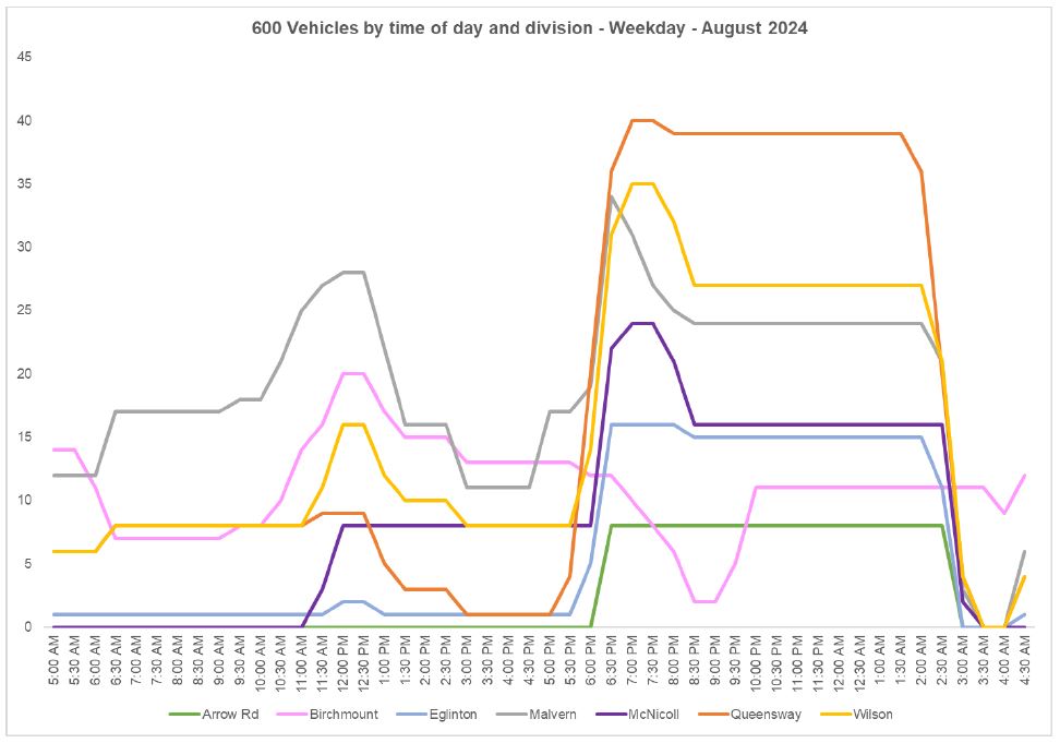 The allocations of Route 600 Run As Directed buses is quite high in the evening period suggesting that there are a lot of operators spare to crew this service. Come September when substantial service improvements have been strongly hinted at by the CEO and others, it will be interesting to see how this chart changes.