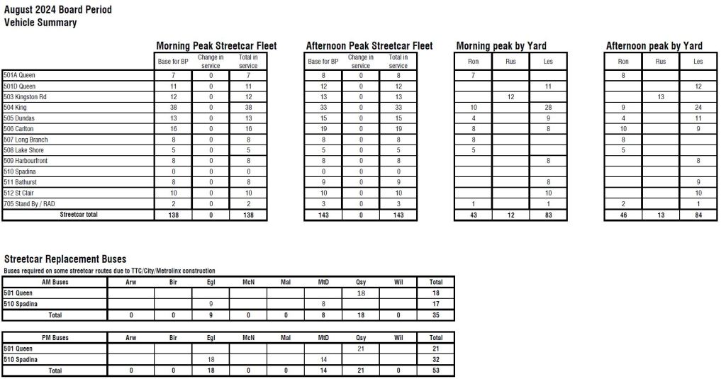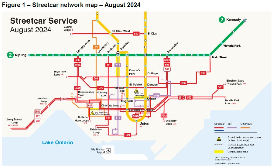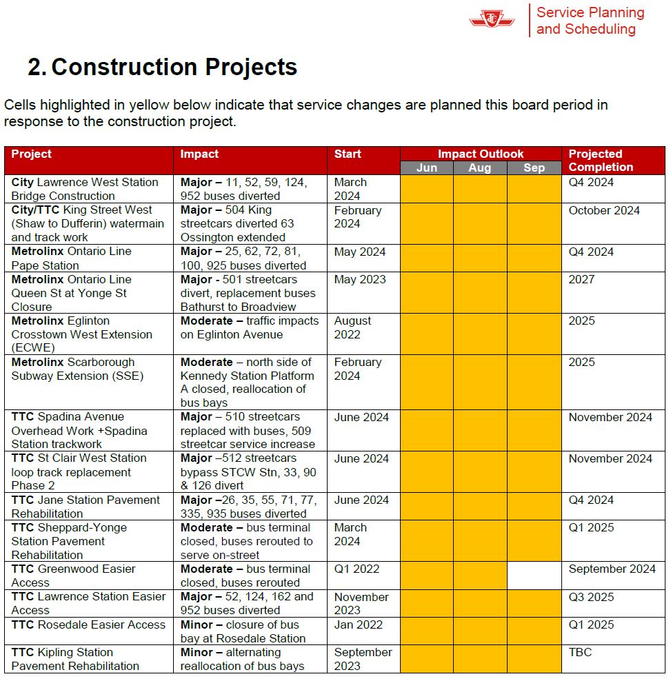The construction project outlook in the table below suggests that a rare sight may occur late in 2024 with all of the streetcar routes actually operating with streetcars. Whether the TTC finds some way to avoid this remains to be seen.
