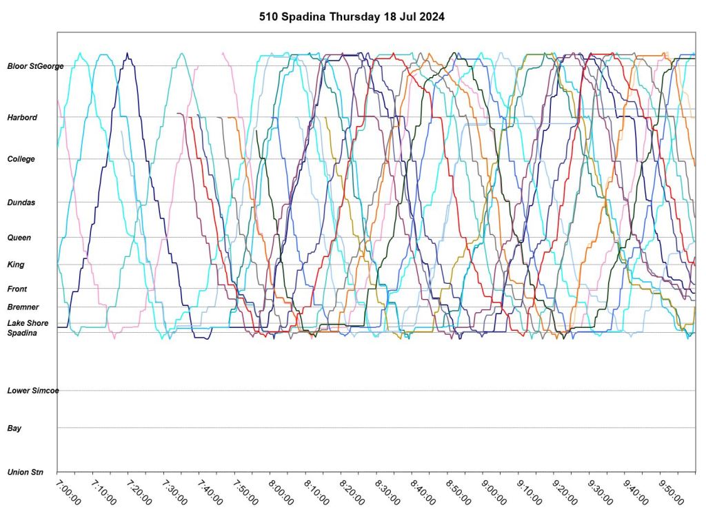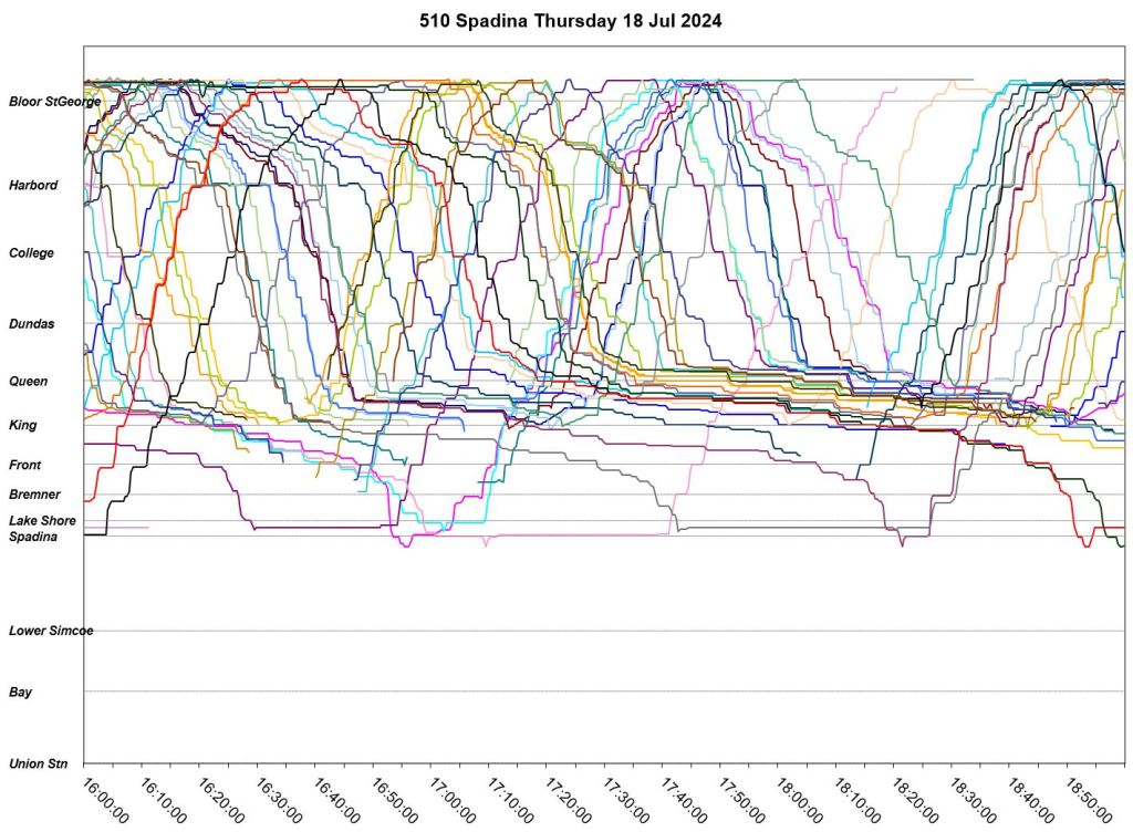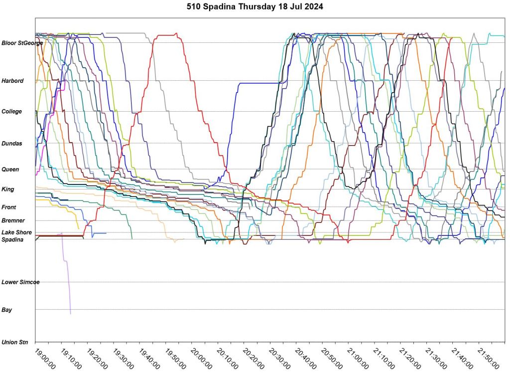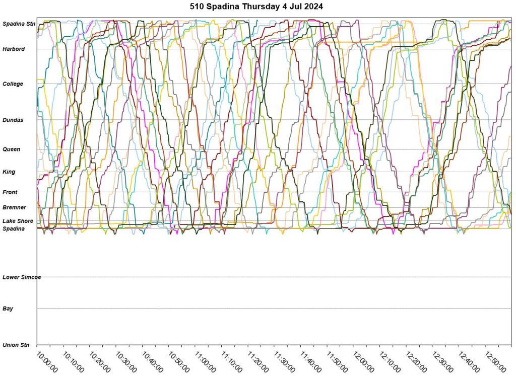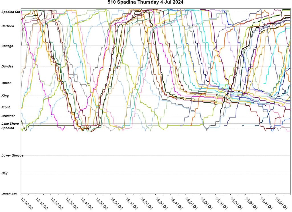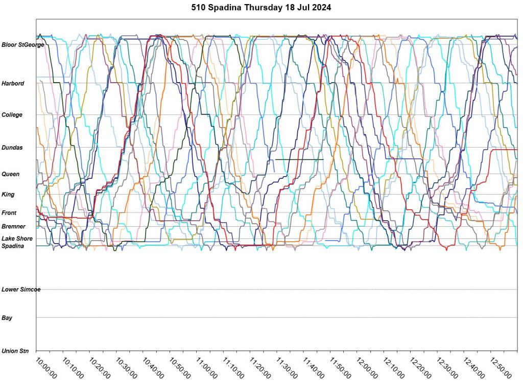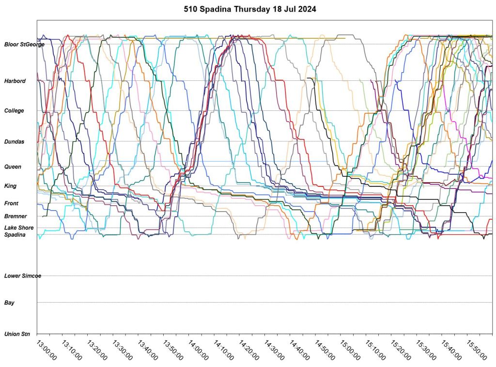 The charts for Thursday July 18 is astounding and indicate management simply gave up on service that day, even though as you said note they could have abandoned much of the line south of Queen and at least focus on providing proper service from there north to Bloor, or even created a long but still faster detour, like west on Queen to Bathurst, south on Bathurst to Front, and north at Front on Spadina, which would still be faster than letting buses sit on the bridge over the railway corridor moving only a few inches per minute. This was a situation where there was a crisis of service which should go right up the chain to get executive approval to “just do it” but they are paralyzed to respond to immediate problems. Even with union rules or whatever, they still have flexibility, but they won’t even use that without hours or even days of indecision.