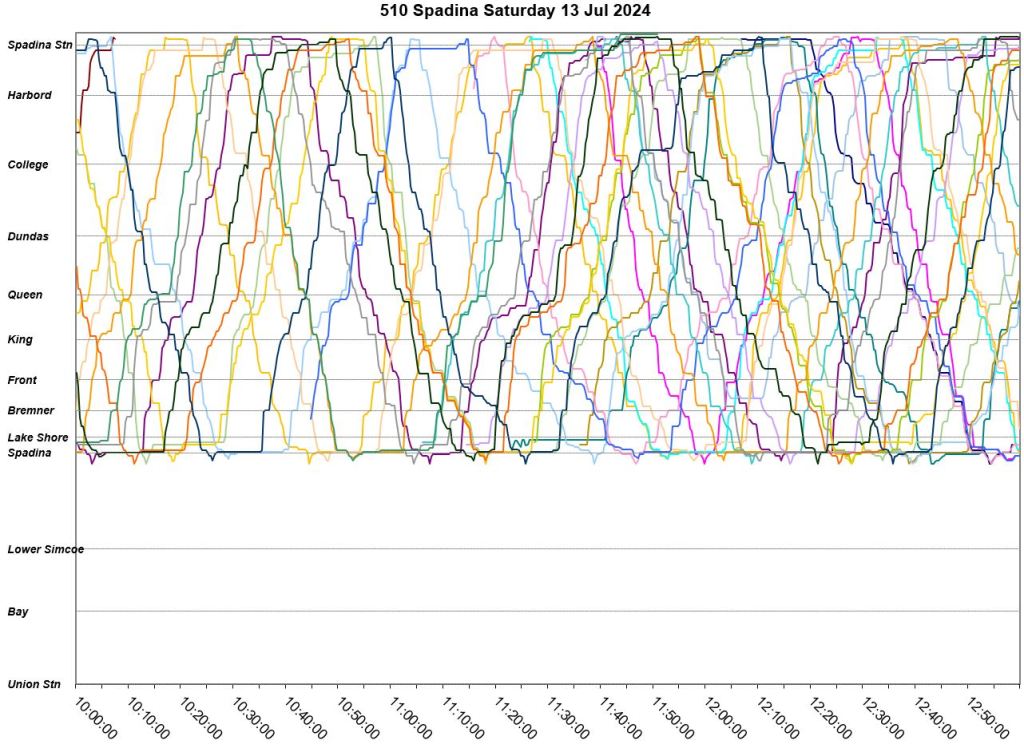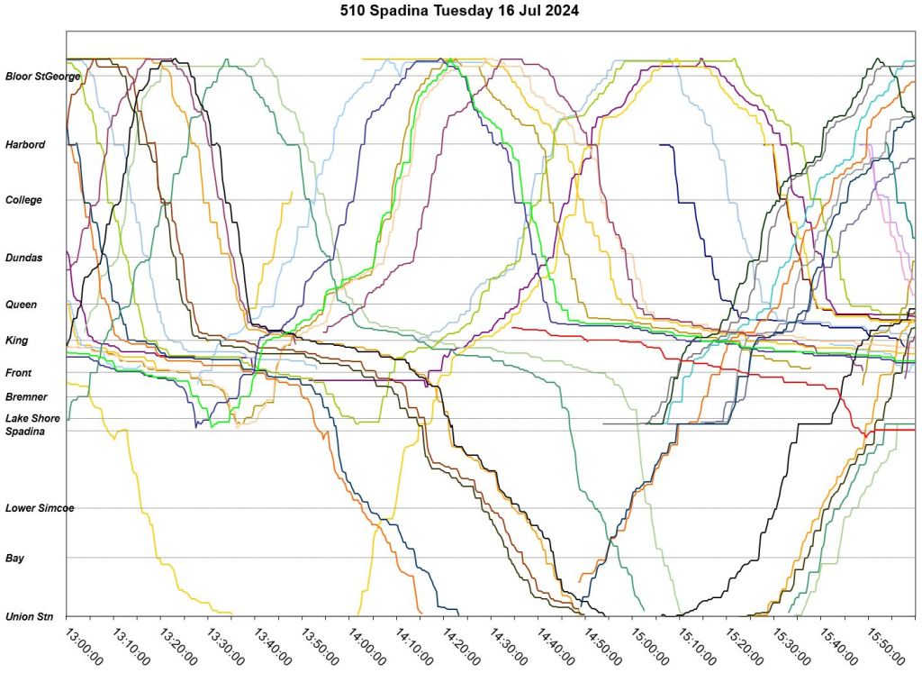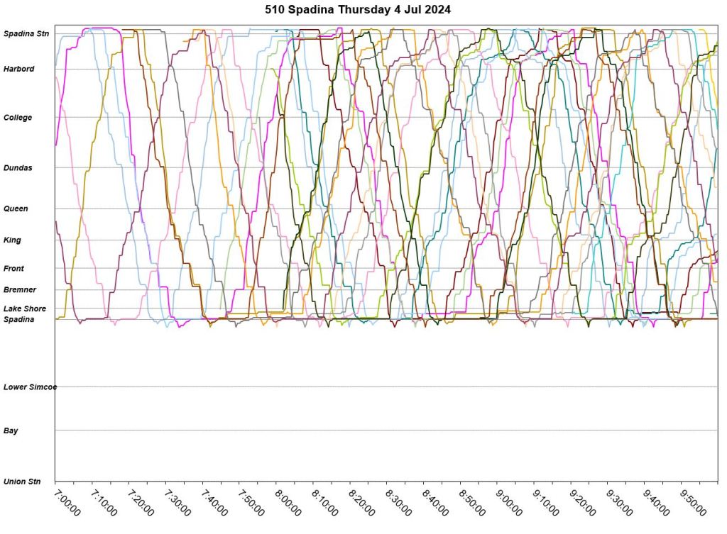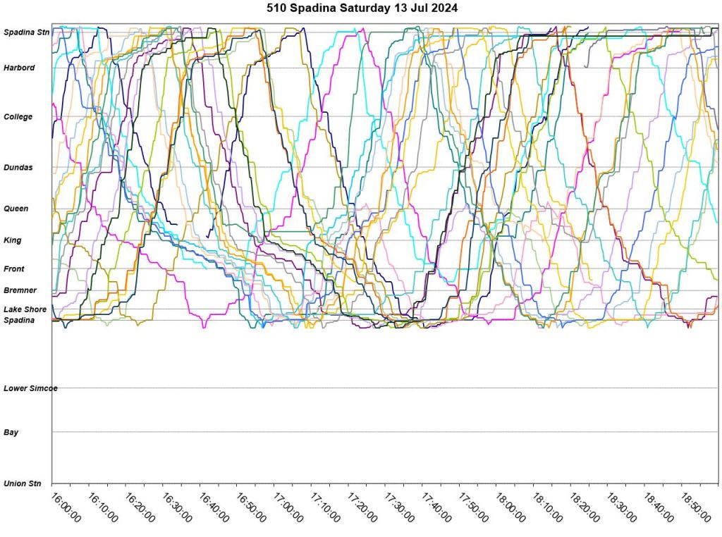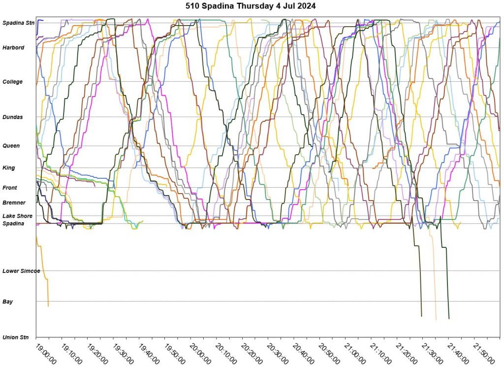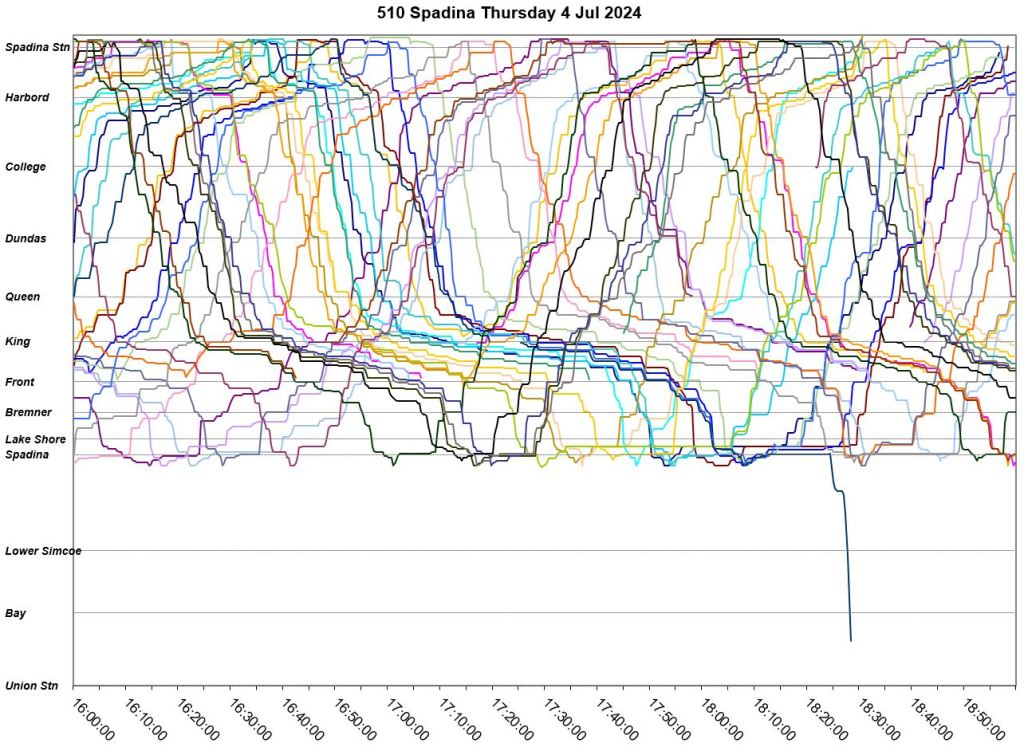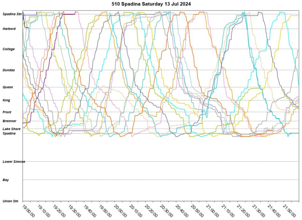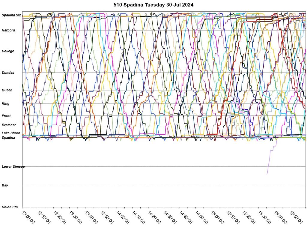 The charts for Thursday July 18 is astounding and indicate management simply gave up on service that day, even though as you said note they could have abandoned much of the line south of Queen and at least focus on providing proper service from there north to Bloor, or even created a long but still faster detour, like west on Queen to Bathurst, south on Bathurst to Front, and north at Front on Spadina, which would still be faster than letting buses sit on the bridge over the railway corridor moving only a few inches per minute. This was a situation where there was a crisis of service which should go right up the chain to get executive approval to “just do it” but they are paralyzed to respond to immediate problems. Even with union rules or whatever, they still have flexibility, but they won’t even use that without hours or even days of indecision.