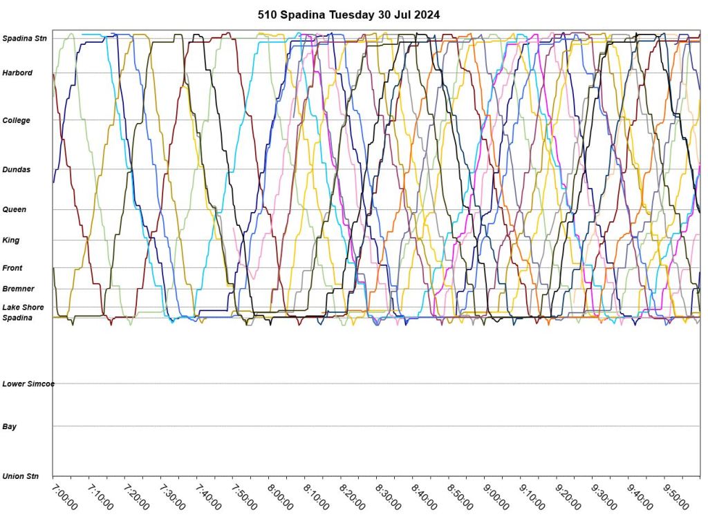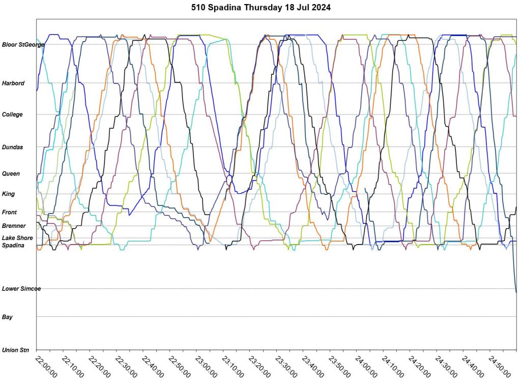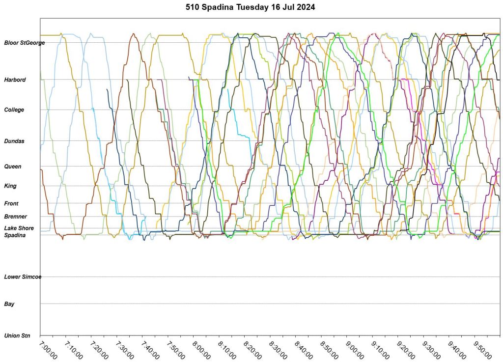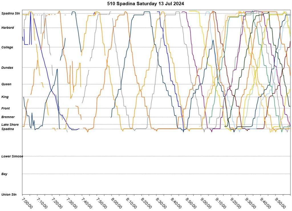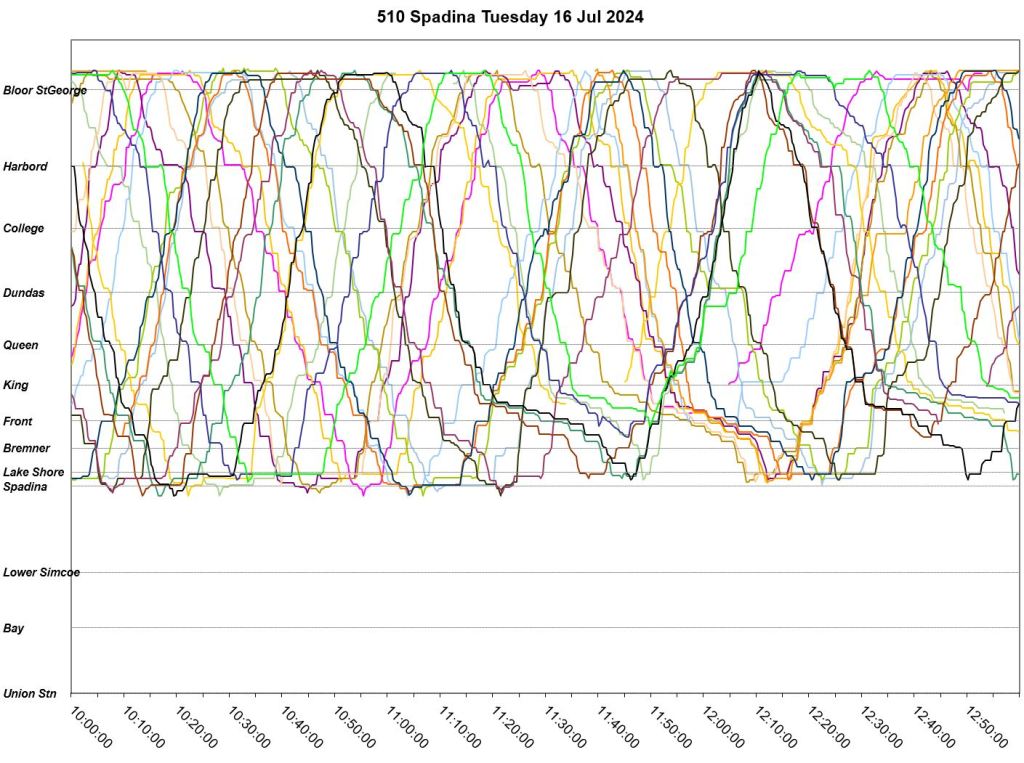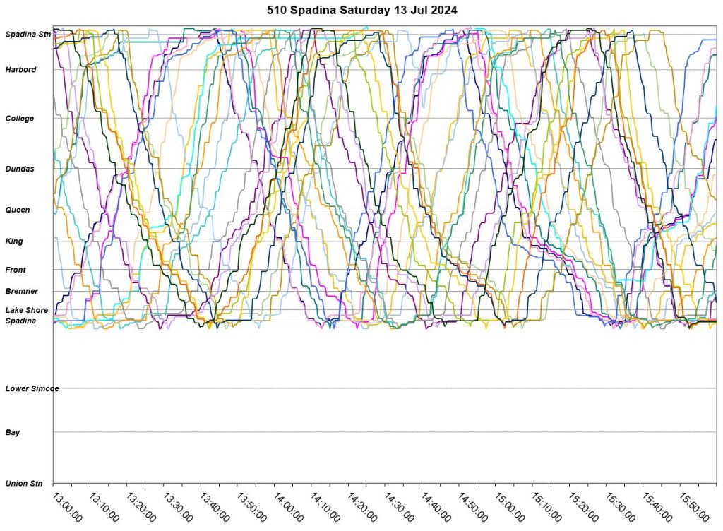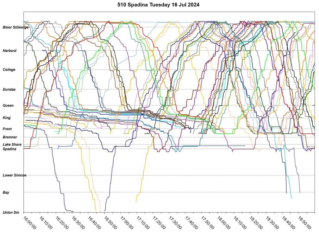 The charts for Thursday July 18 is astounding and indicate management simply gave up on service that day, even though as you said note they could have abandoned much of the line south of Queen and at least focus on providing proper service from there north to Bloor, or even created a long but still faster detour, like west on Queen to Bathurst, south on Bathurst to Front, and north at Front on Spadina, which would still be faster than letting buses sit on the bridge over the railway corridor moving only a few inches per minute. This was a situation where there was a crisis of service which should go right up the chain to get executive approval to “just do it” but they are paralyzed to respond to immediate problems. Even with union rules or whatever, they still have flexibility, but they won’t even use that without hours or even days of indecision.