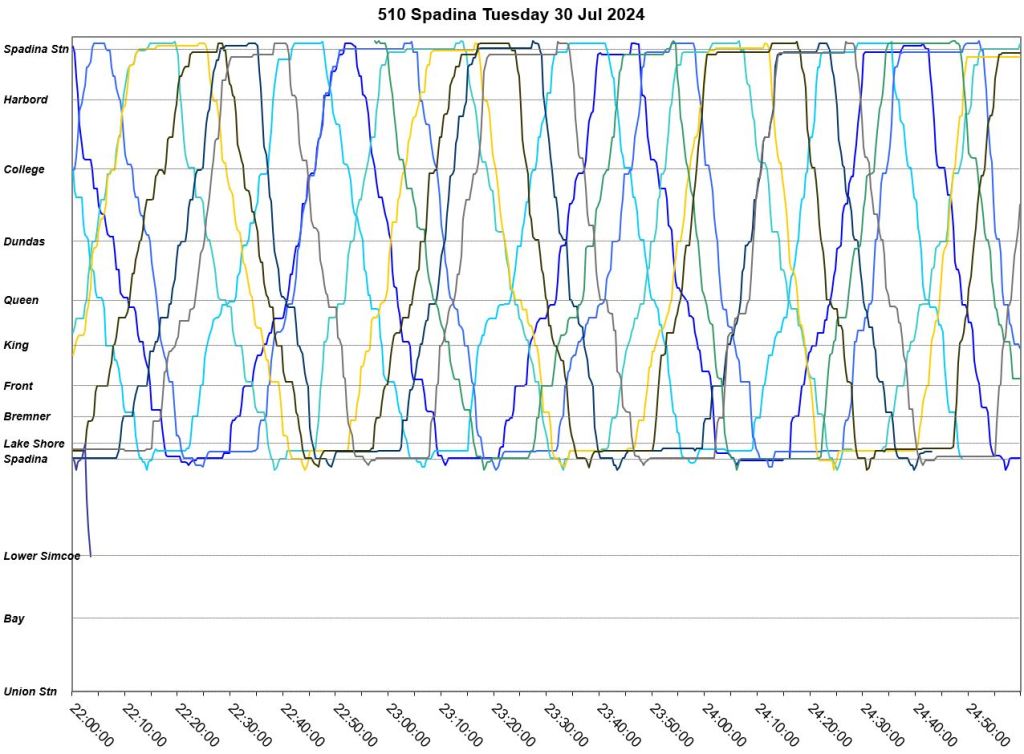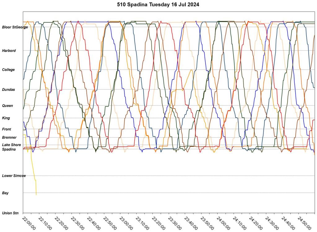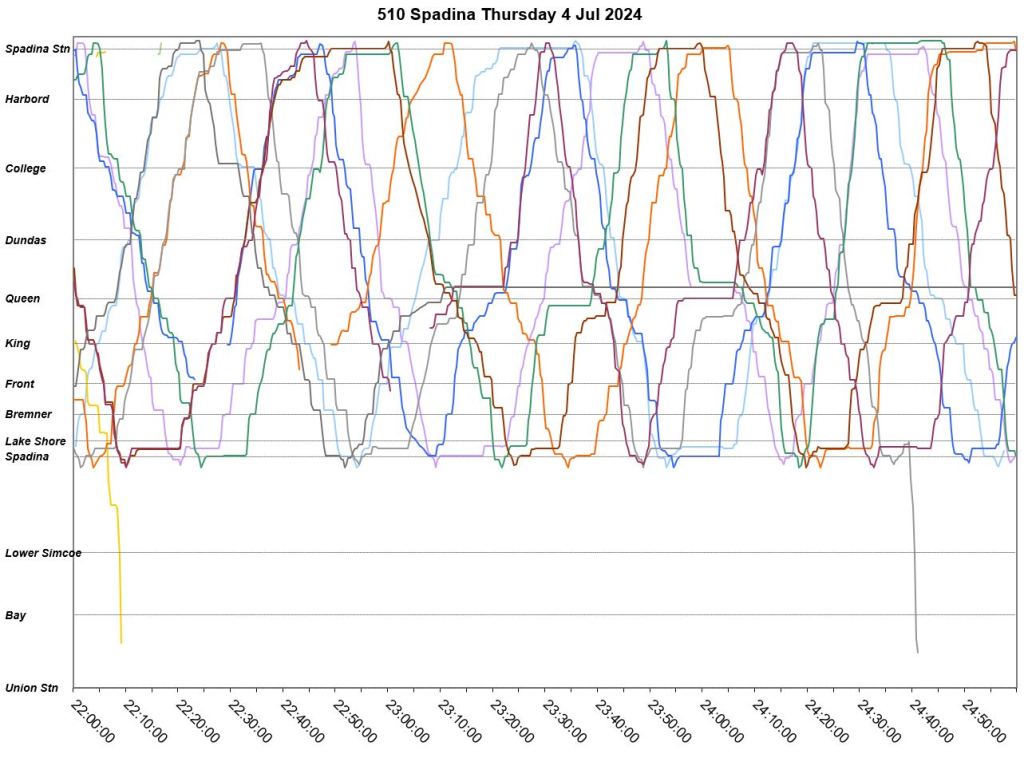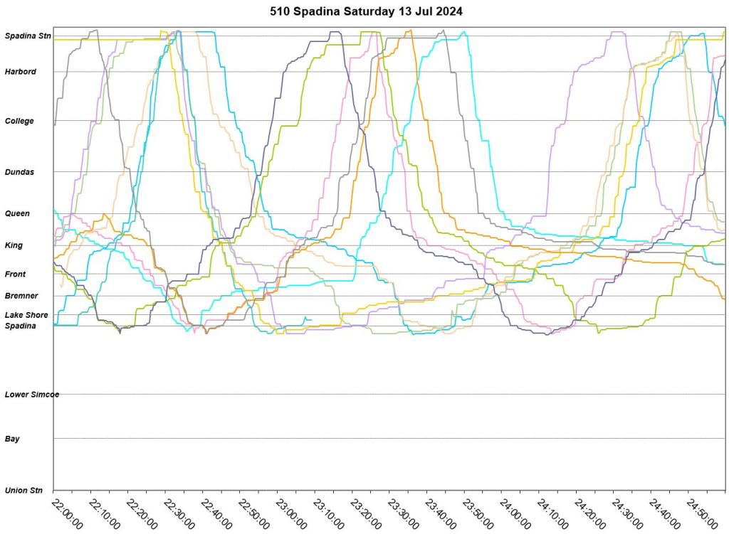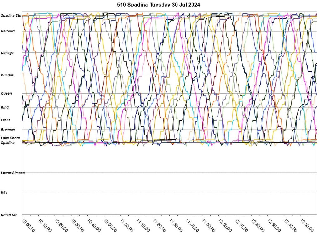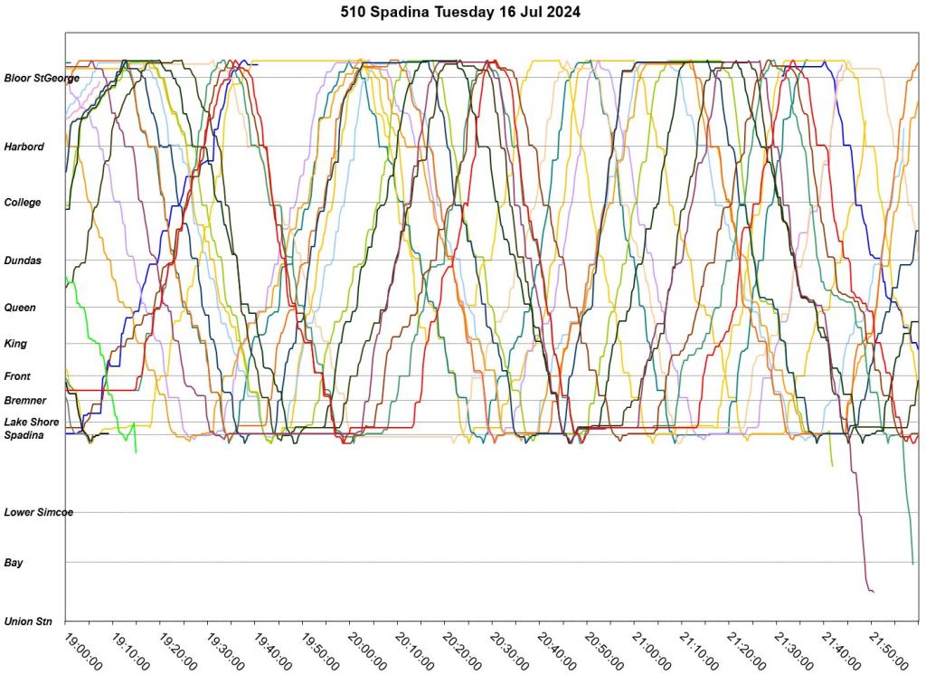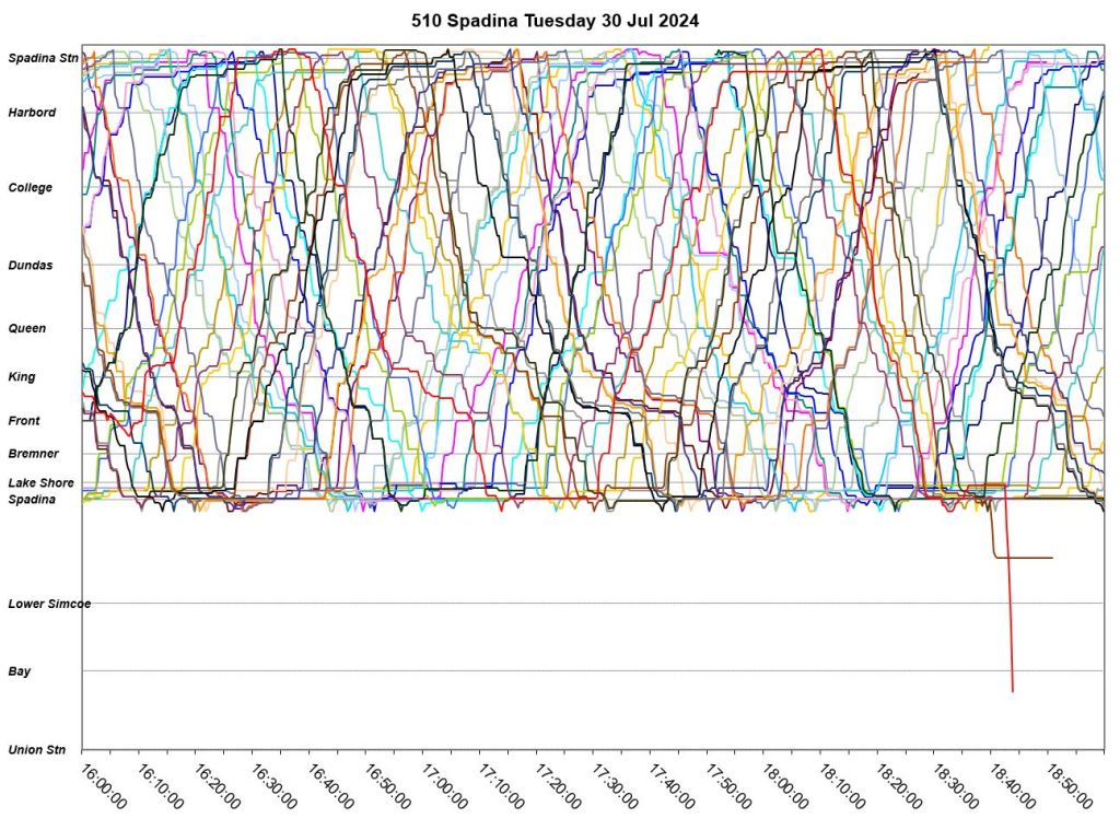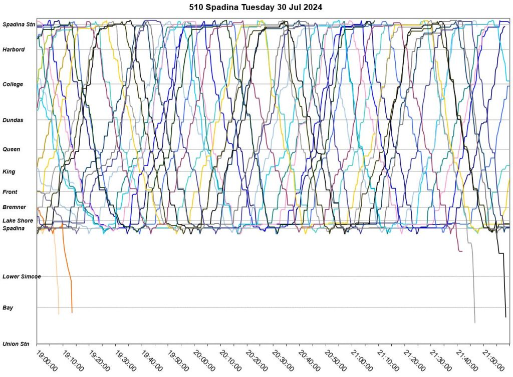The charts for Thursday July 18 is astounding and indicate management simply gave up on service that day, even though as you said note they could have abandoned much of the line south of Queen and at least focus on providing proper service from there north to Bloor, or even created a long but still faster detour, like west on Queen to Bathurst, south on Bathurst to Front, and north at Front on Spadina, which would still be faster than letting buses sit on the bridge over the railway corridor moving only a few inches per minute. This was a situation where there was a crisis of service which should go right up the chain to get executive approval to “just do it” but they are paralyzed to respond to immediate problems. Even with union rules or whatever, they still have flexibility, but they won’t even use that without hours or even days of indecision.