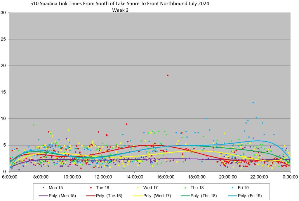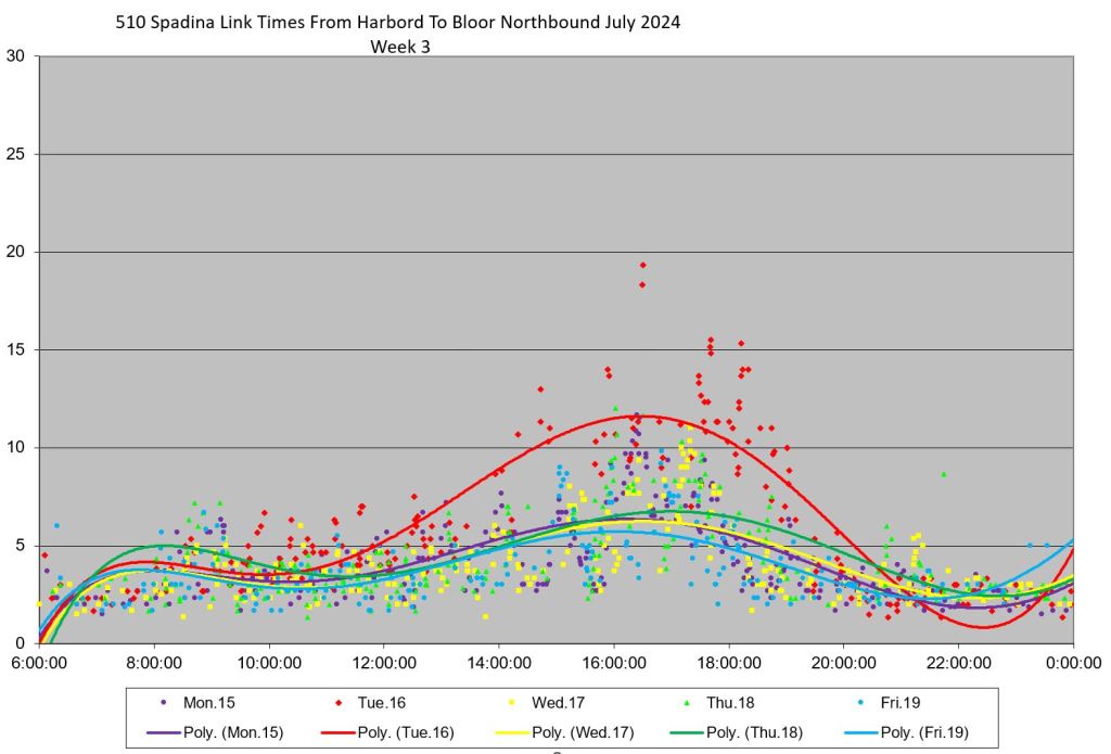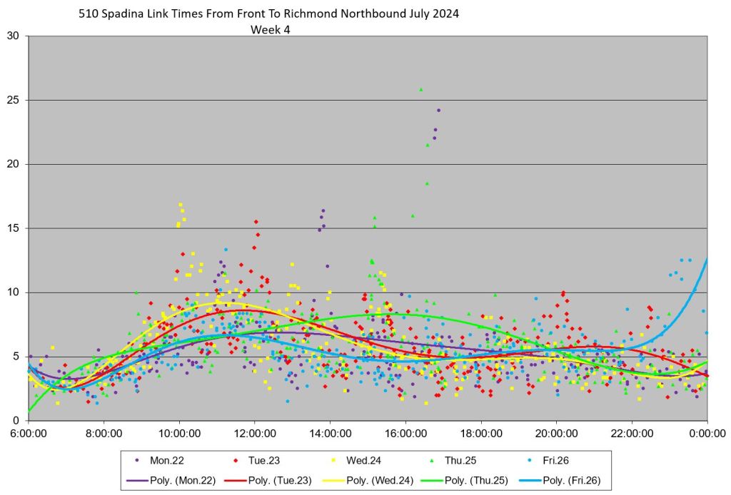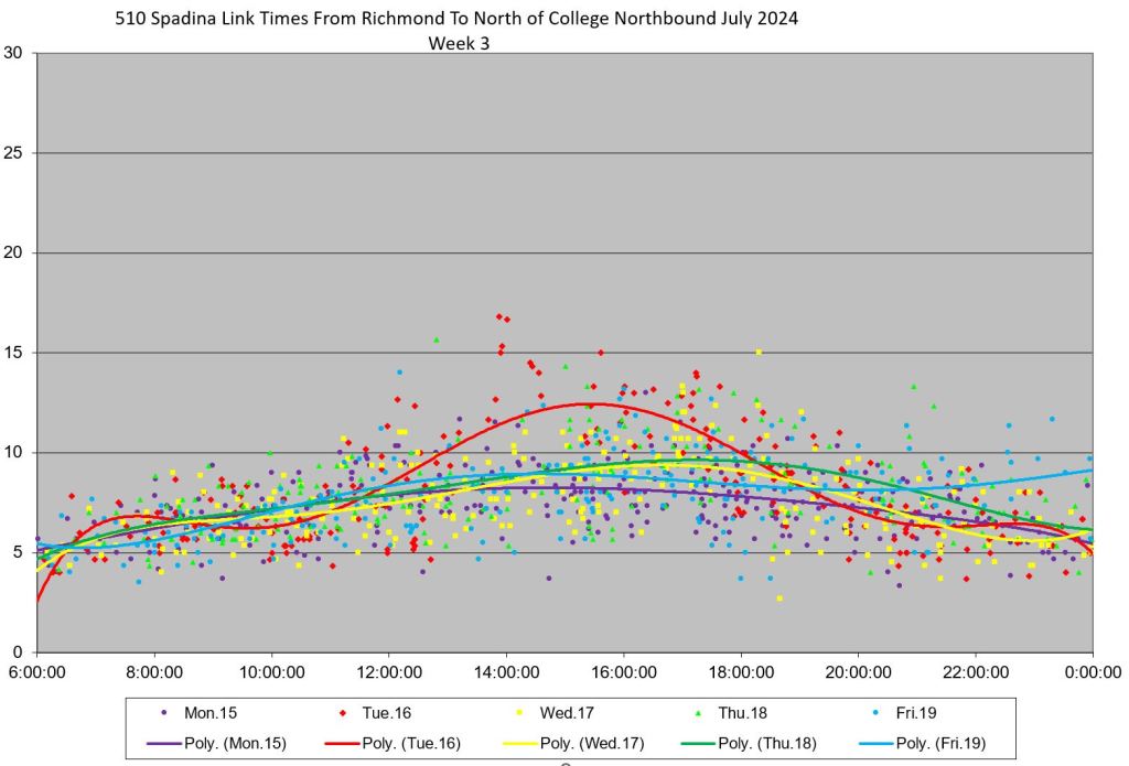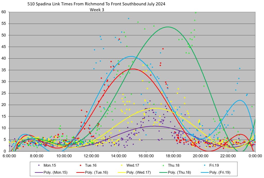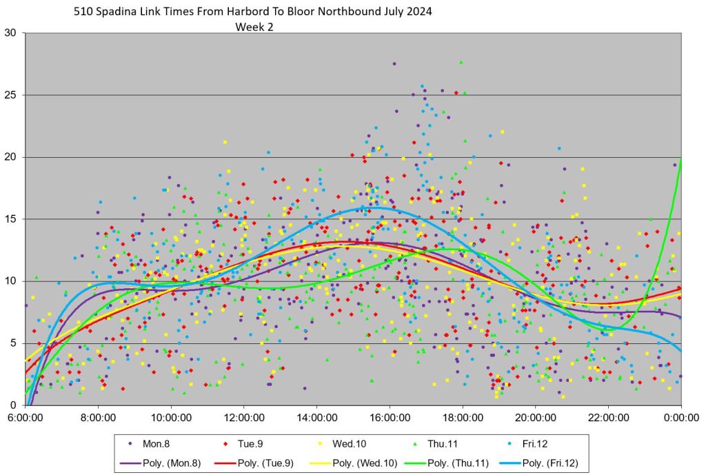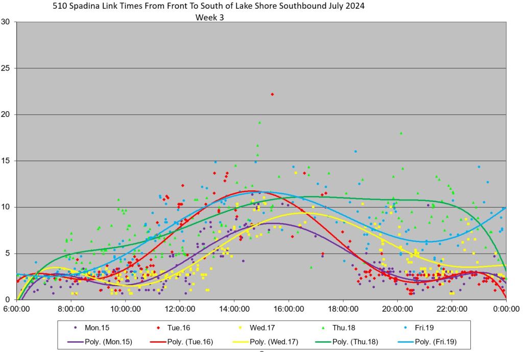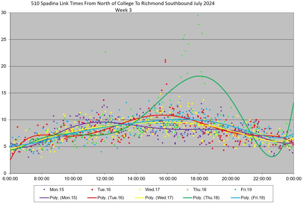 The charts for Thursday July 18 is astounding and indicate management simply gave up on service that day, even though as you said note they could have abandoned much of the line south of Queen and at least focus on providing proper service from there north to Bloor, or even created a long but still faster detour, like west on Queen to Bathurst, south on Bathurst to Front, and north at Front on Spadina, which would still be faster than letting buses sit on the bridge over the railway corridor moving only a few inches per minute. This was a situation where there was a crisis of service which should go right up the chain to get executive approval to “just do it” but they are paralyzed to respond to immediate problems. Even with union rules or whatever, they still have flexibility, but they won’t even use that without hours or even days of indecision.