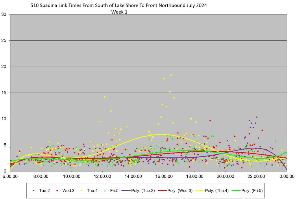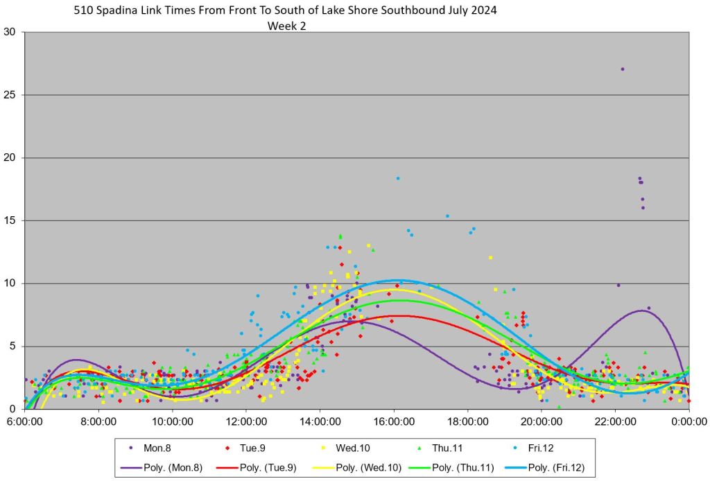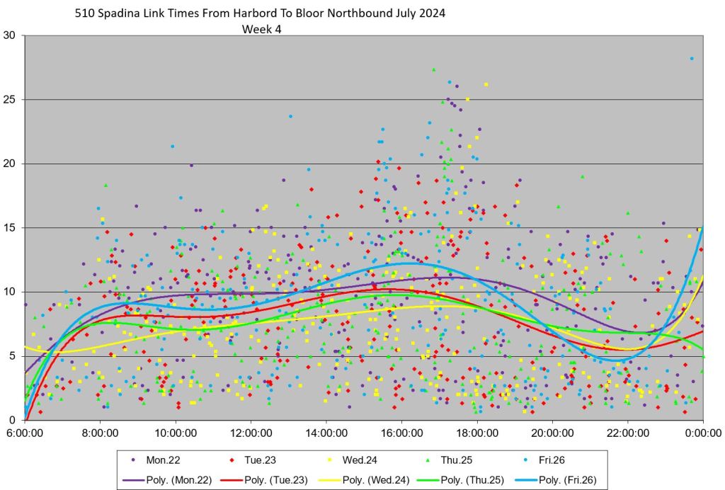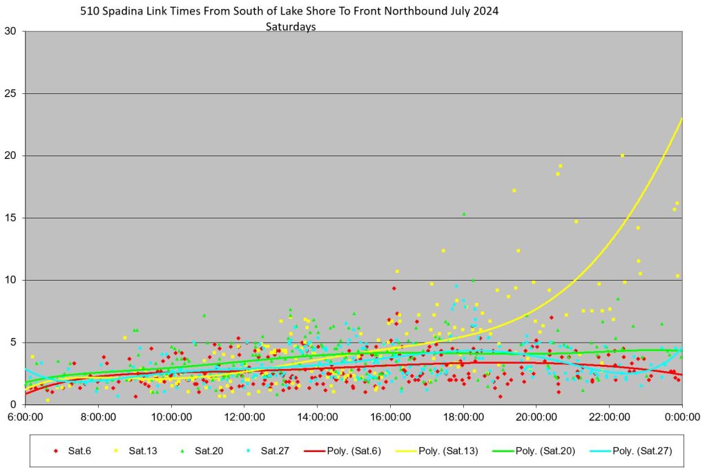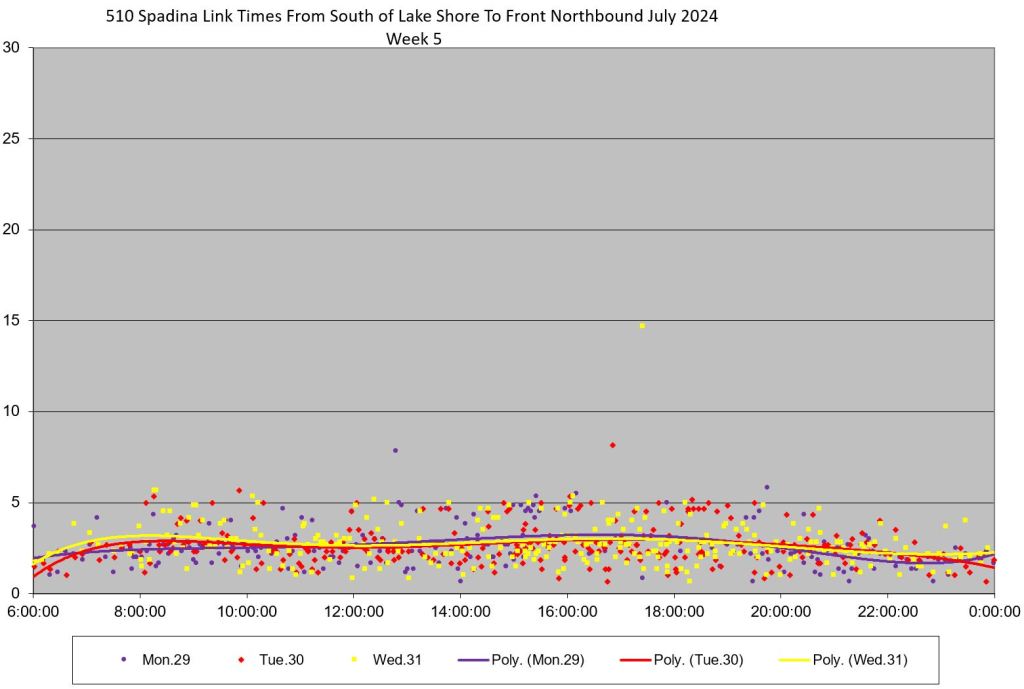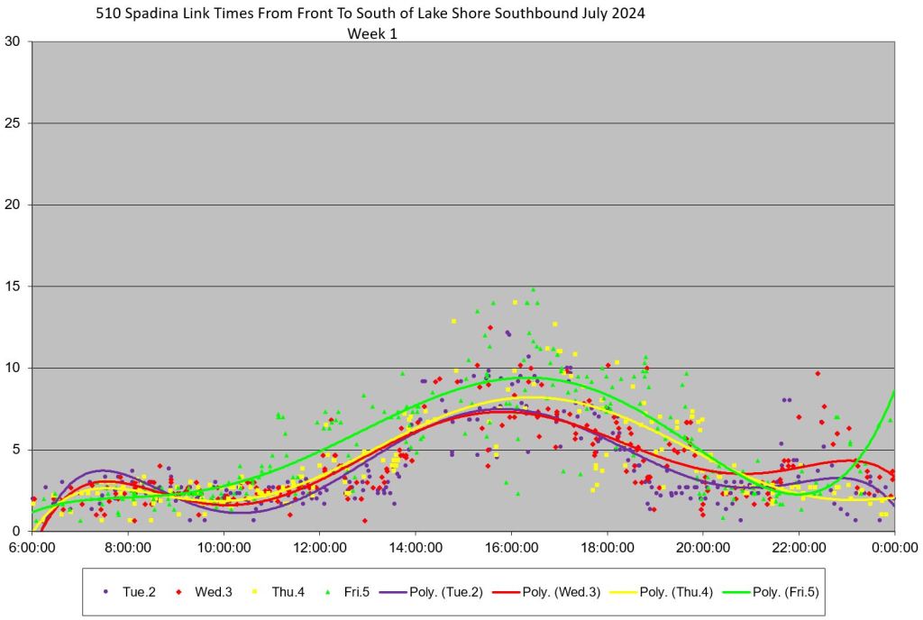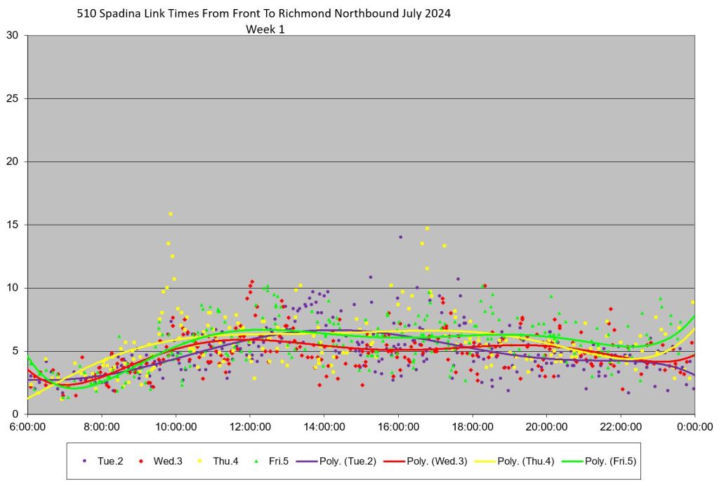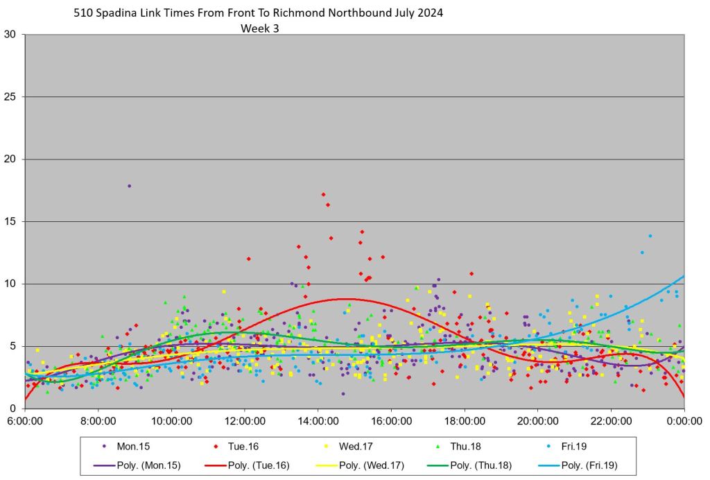 The charts for Thursday July 18 is astounding and indicate management simply gave up on service that day, even though as you said note they could have abandoned much of the line south of Queen and at least focus on providing proper service from there north to Bloor, or even created a long but still faster detour, like west on Queen to Bathurst, south on Bathurst to Front, and north at Front on Spadina, which would still be faster than letting buses sit on the bridge over the railway corridor moving only a few inches per minute. This was a situation where there was a crisis of service which should go right up the chain to get executive approval to “just do it” but they are paralyzed to respond to immediate problems. Even with union rules or whatever, they still have flexibility, but they won’t even use that without hours or even days of indecision.