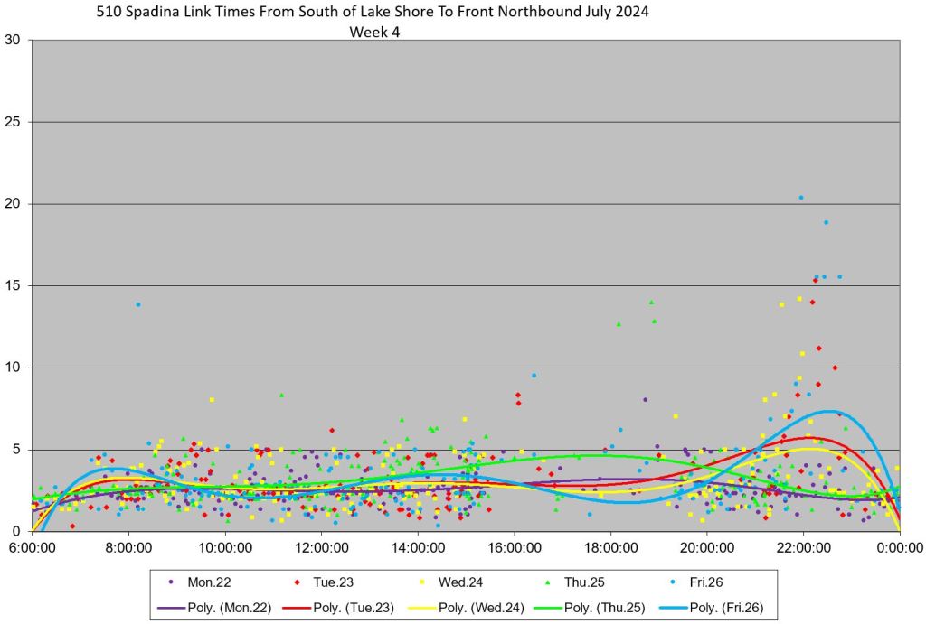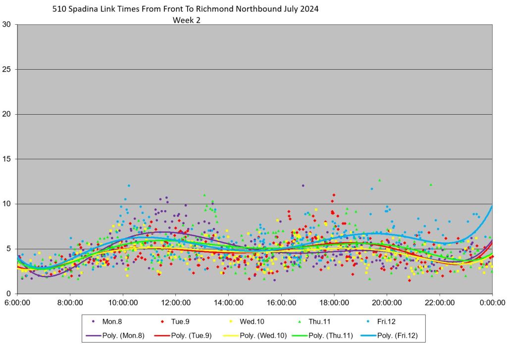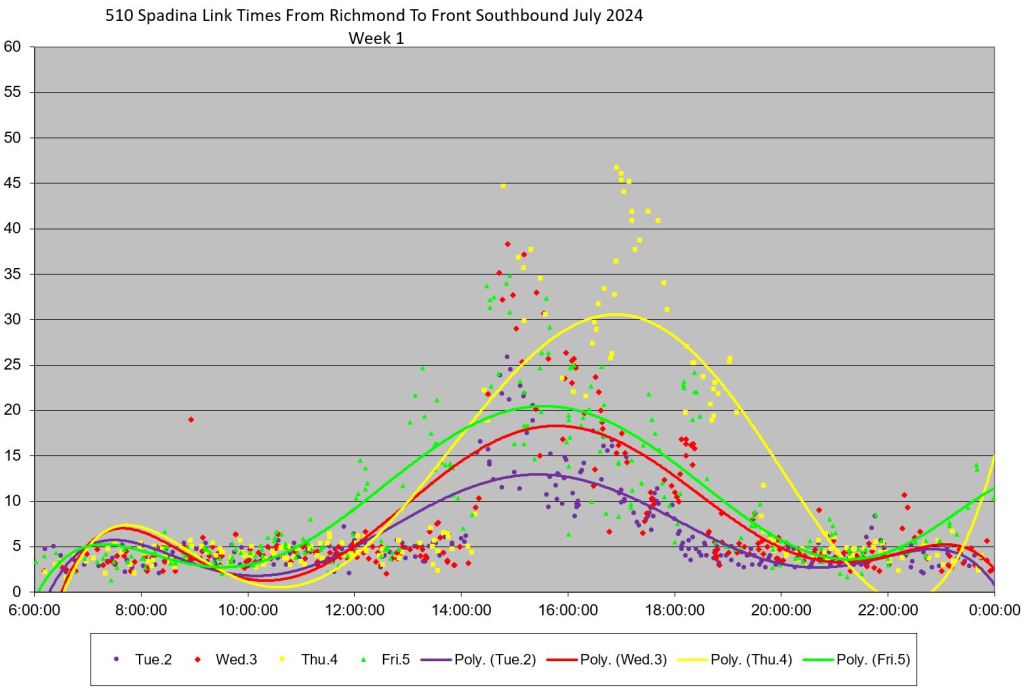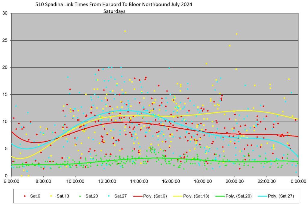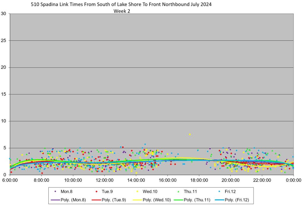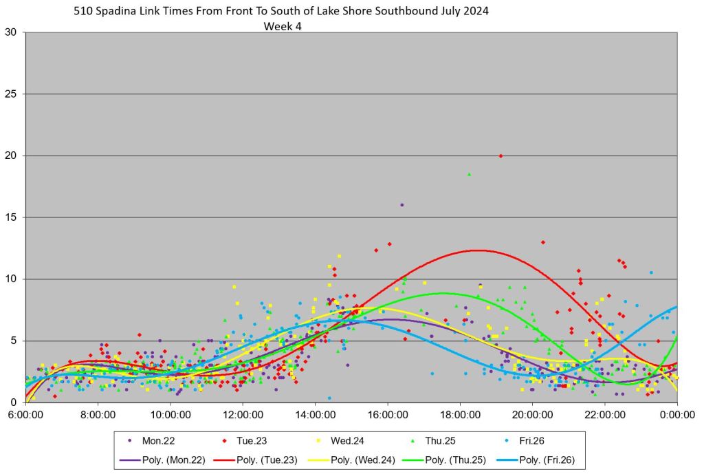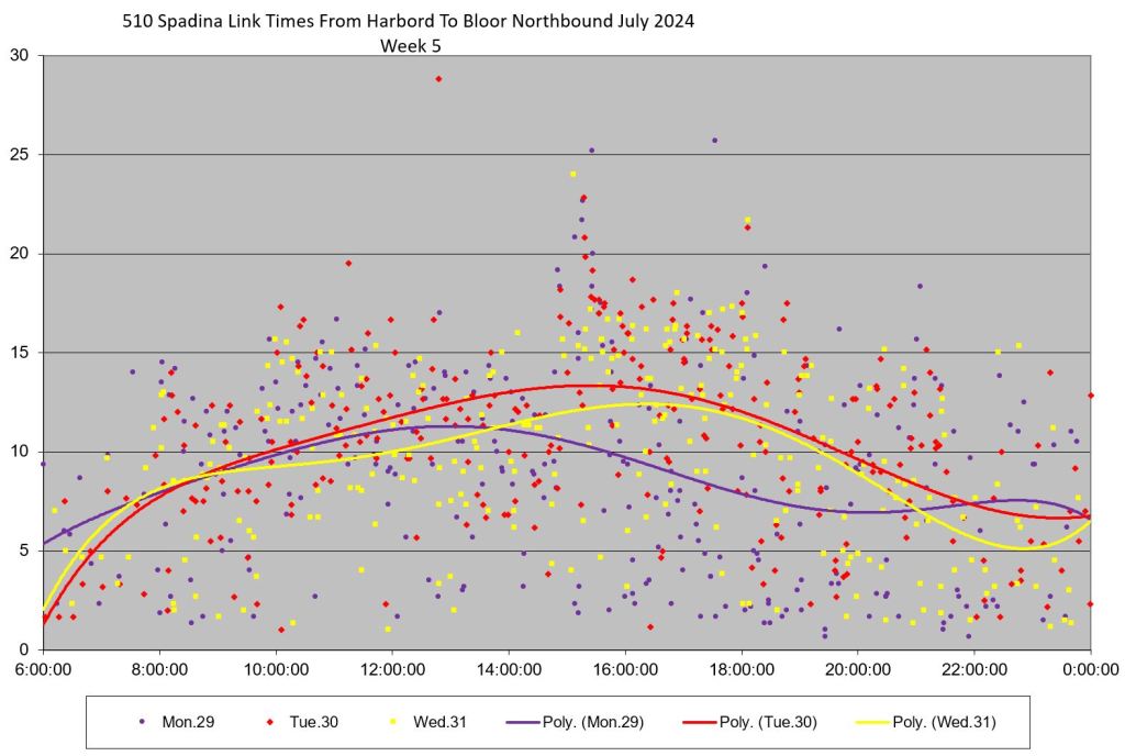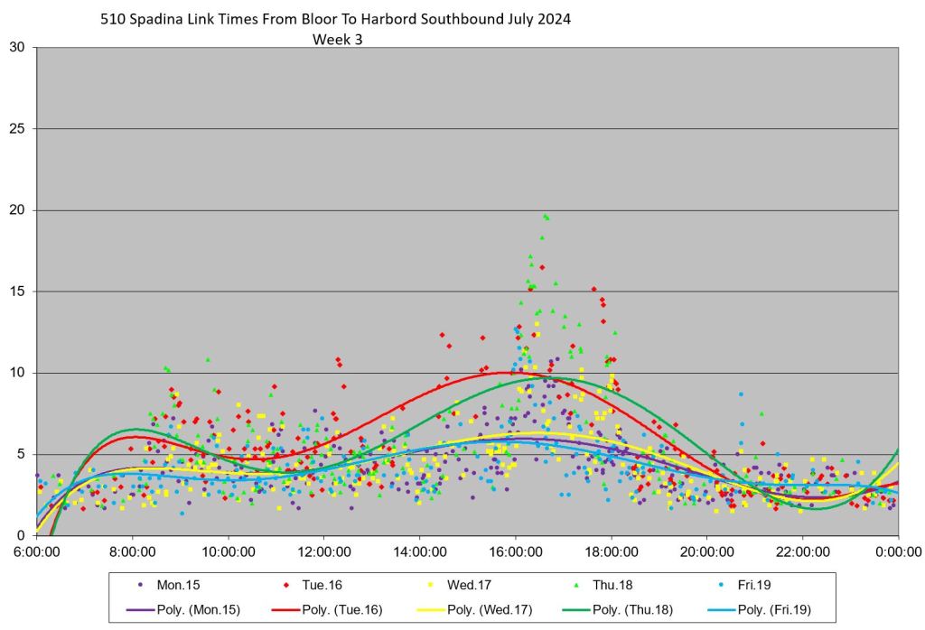 The charts for Thursday July 18 is astounding and indicate management simply gave up on service that day, even though as you said note they could have abandoned much of the line south of Queen and at least focus on providing proper service from there north to Bloor, or even created a long but still faster detour, like west on Queen to Bathurst, south on Bathurst to Front, and north at Front on Spadina, which would still be faster than letting buses sit on the bridge over the railway corridor moving only a few inches per minute. This was a situation where there was a crisis of service which should go right up the chain to get executive approval to “just do it” but they are paralyzed to respond to immediate problems. Even with union rules or whatever, they still have flexibility, but they won’t even use that without hours or even days of indecision.