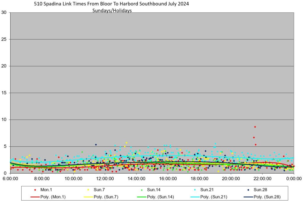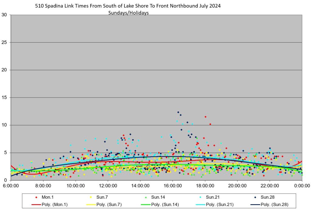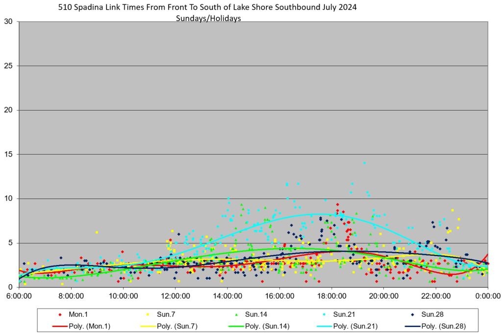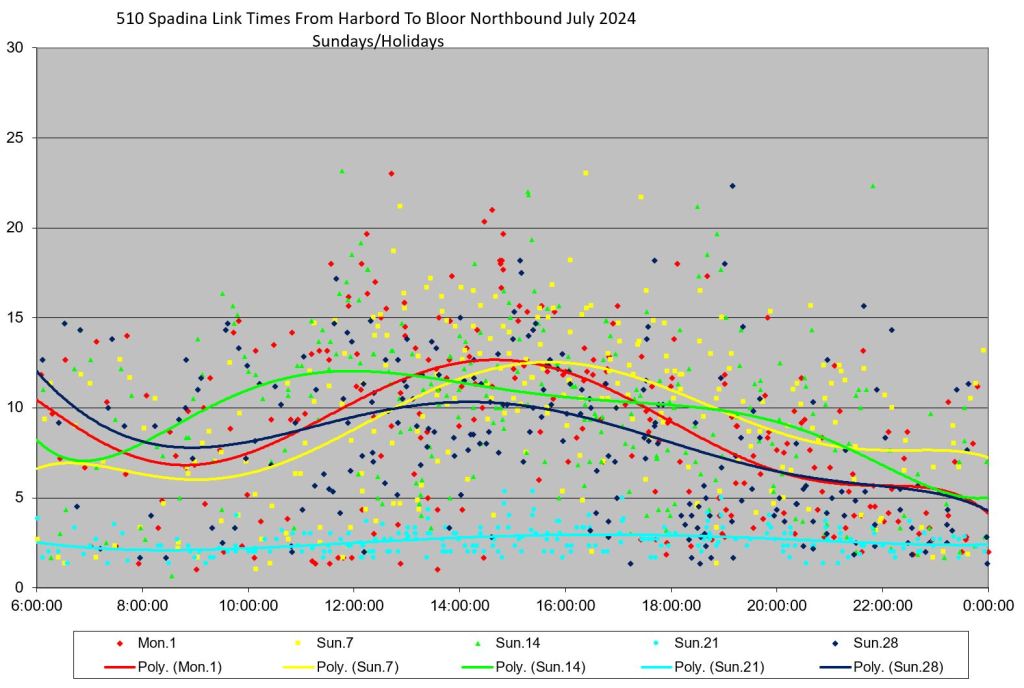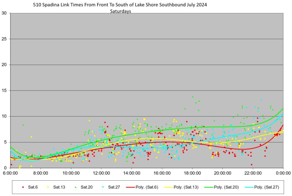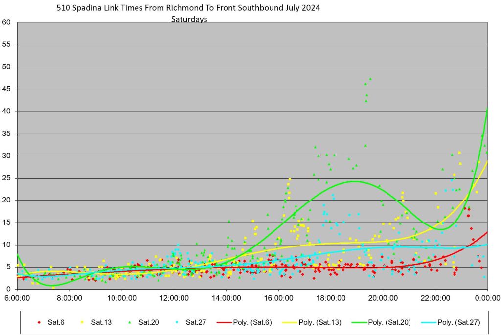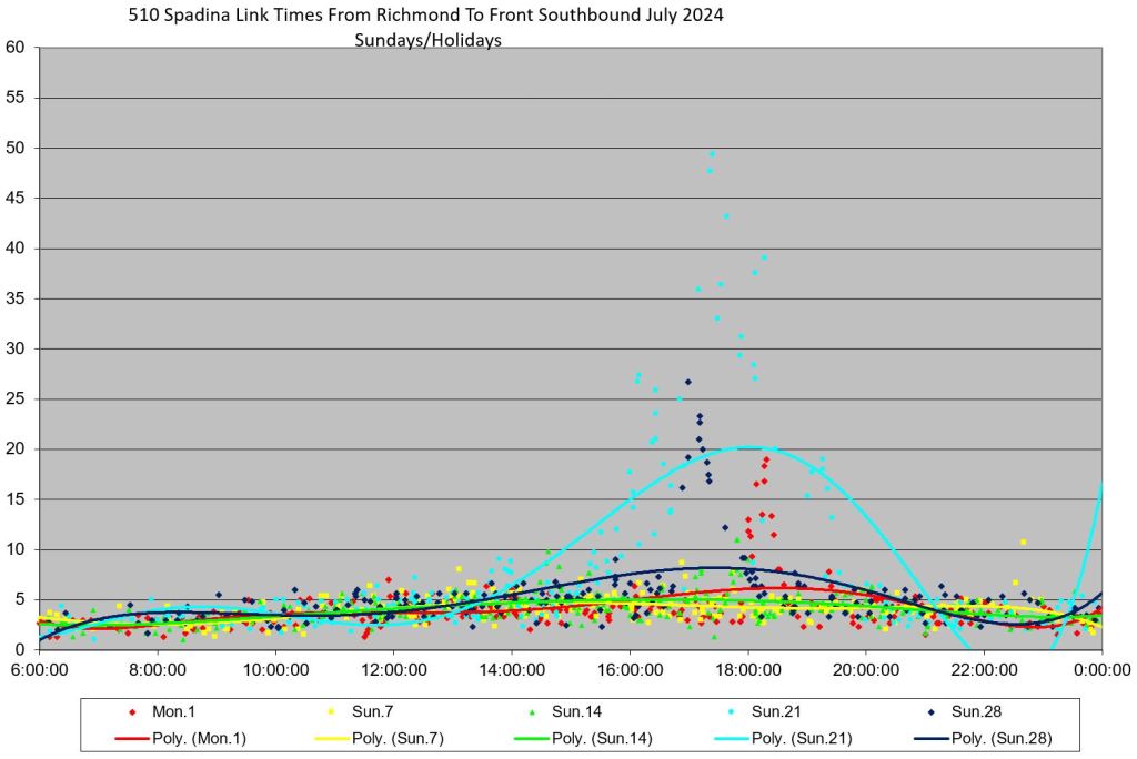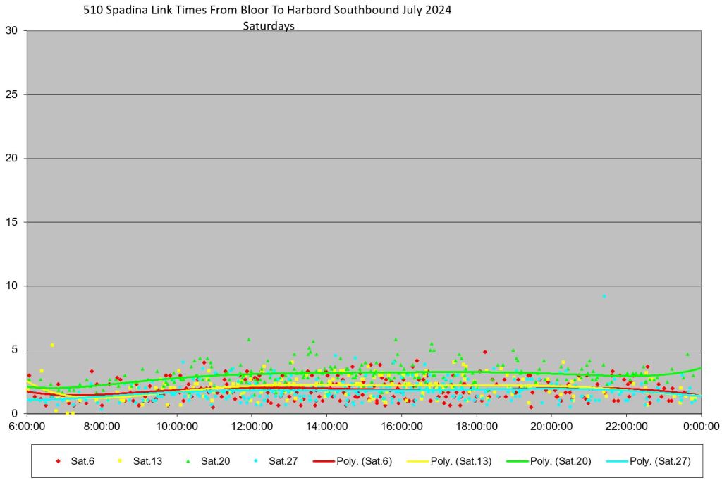 Southbound trips were much quicker, with longer times only in Week 3 when the route was lengthened to St. George Station. Note also the single line for July 20 and 21 in the weekend charts that lies well below the averages for other Saturdays and Sundays.