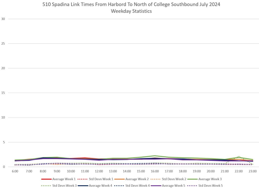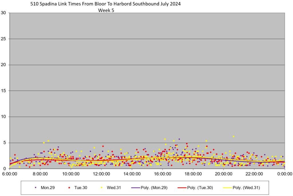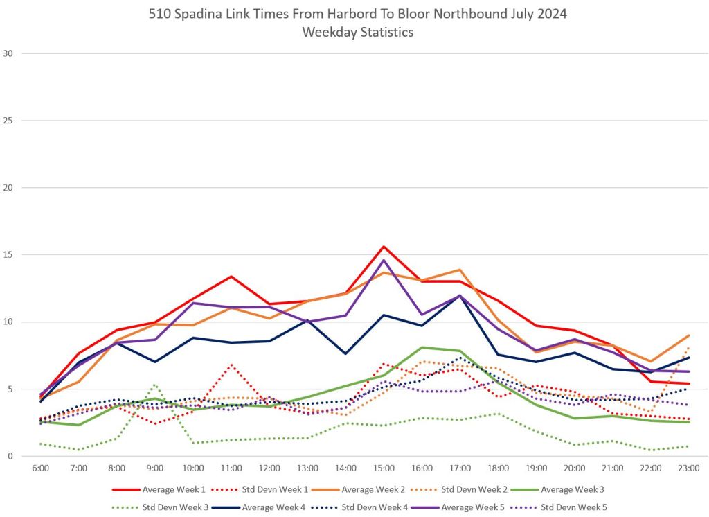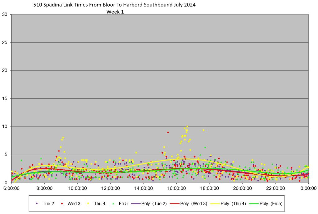 This article presents travel times over various segments of Spadina from Bloor Street to Queens Quay during July 2024 to show the effect of the changing route configuration.