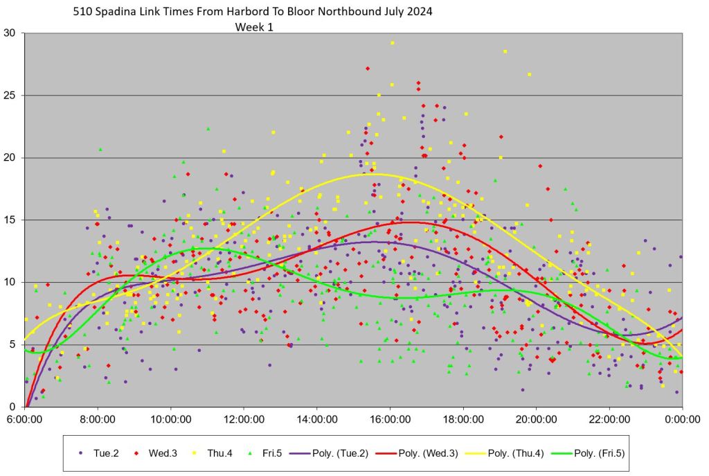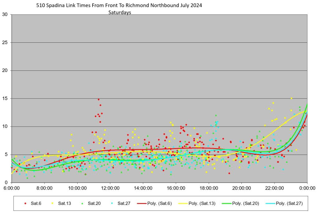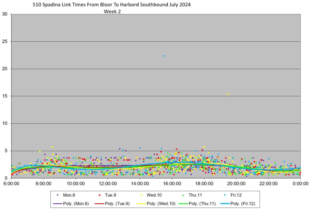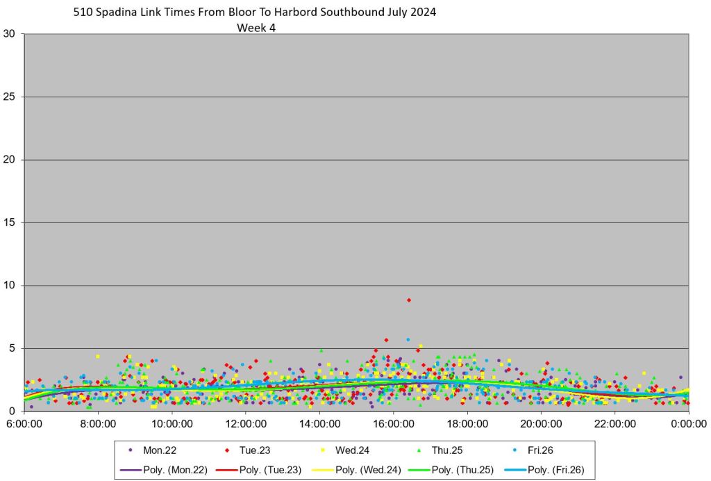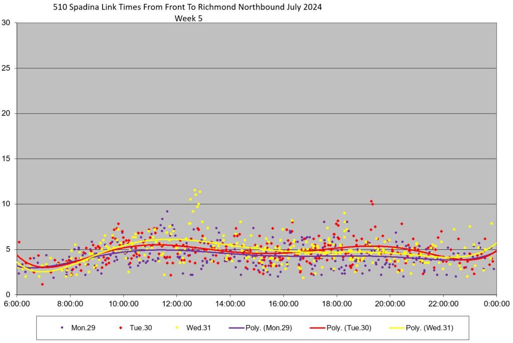 This article presents travel times over various segments of Spadina from Bloor Street to Queens Quay during July 2024 to show the effect of the changing route configuration.