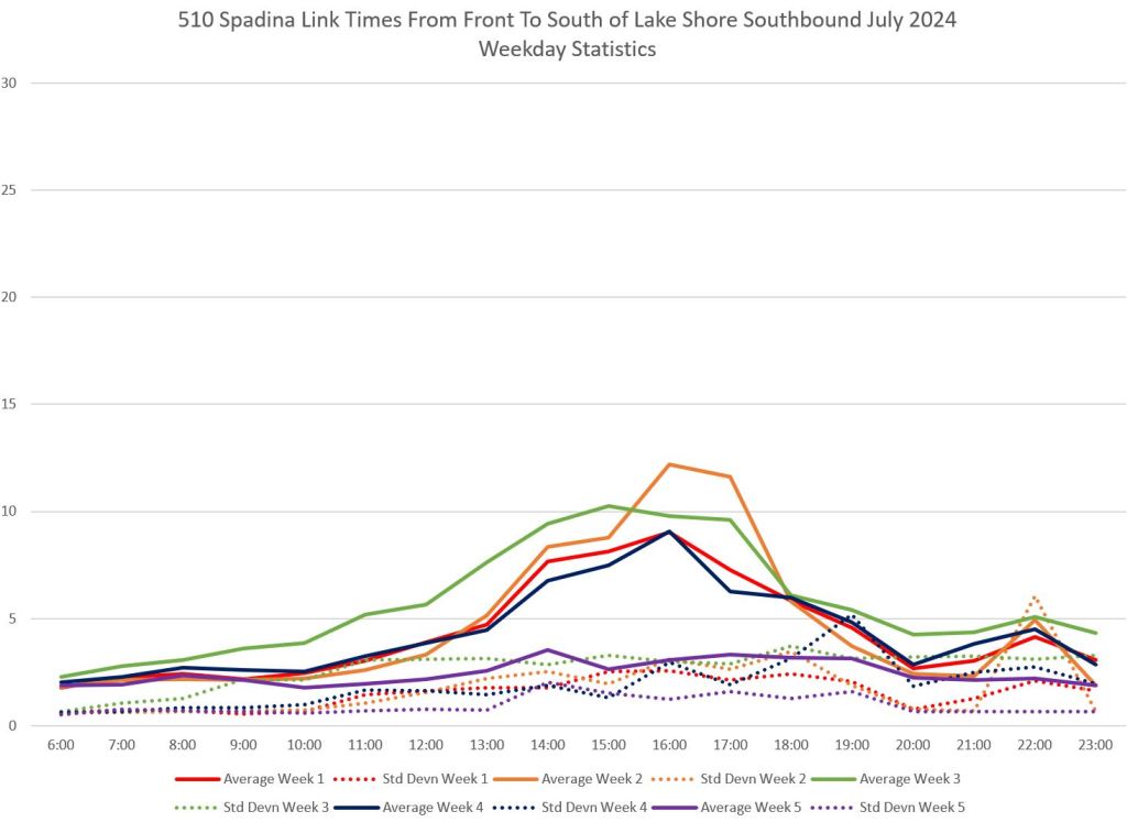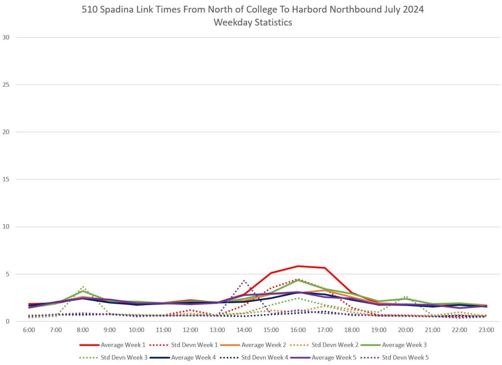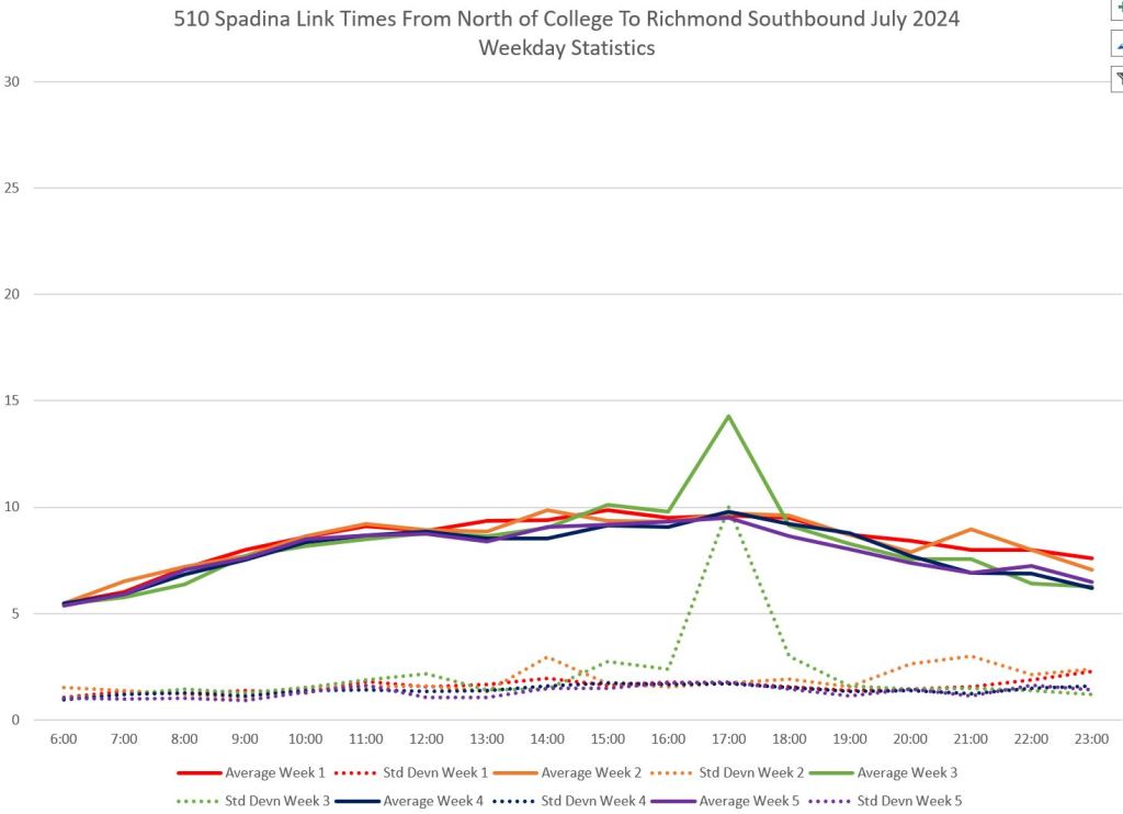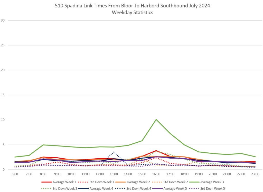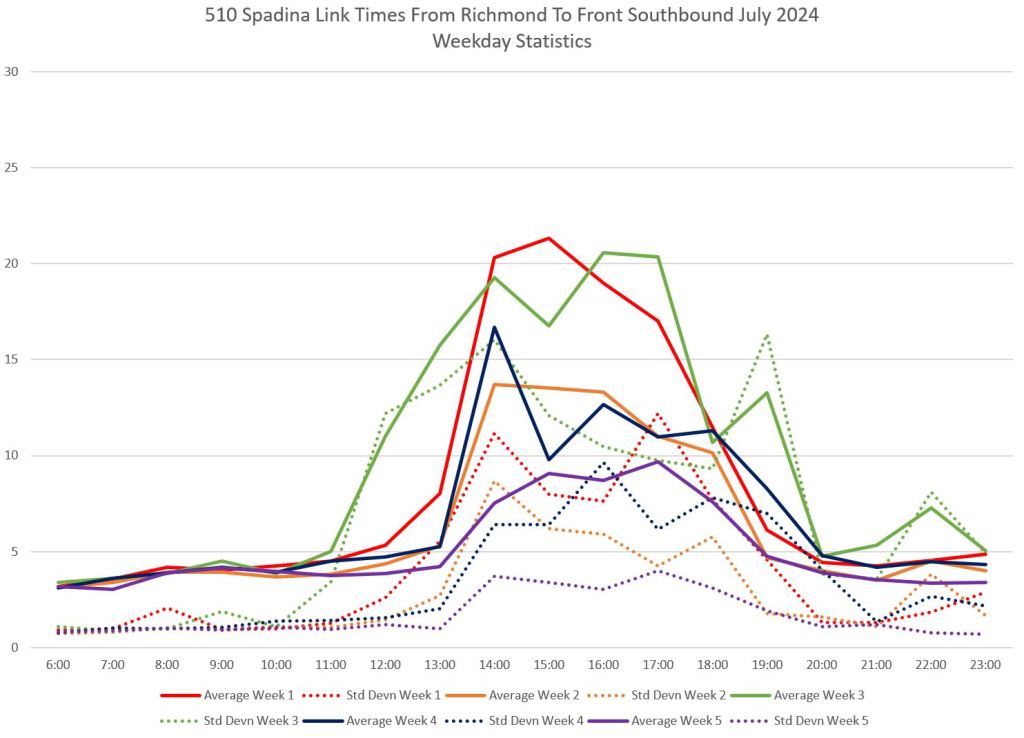 Southbound travel times from Richmond to Front were high through the early afternoon and evening until Week 5 when the reserved transit lane was implemented. The short turn via Front and Blue Jays Way had some benefit, but congestion routinely spread north of Front delaying the buses.