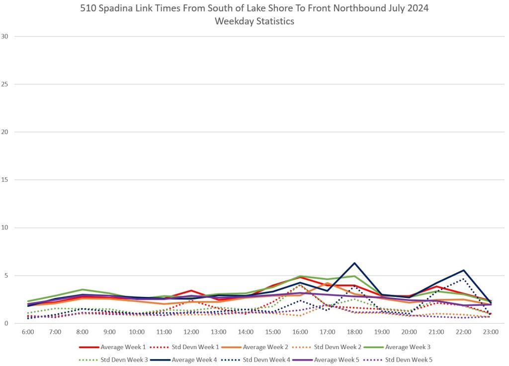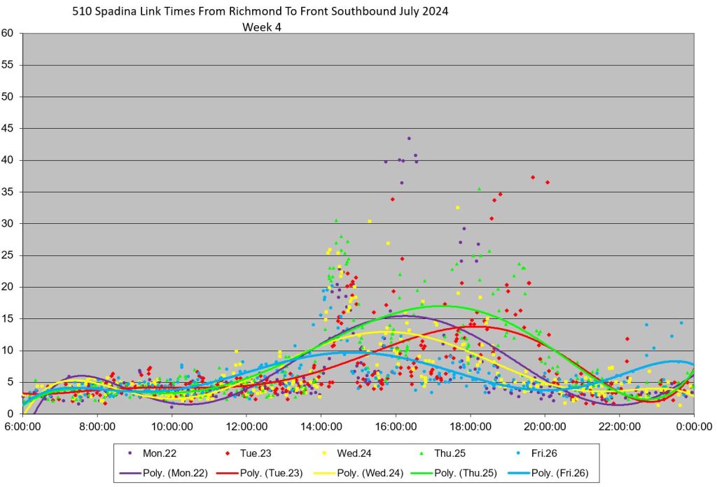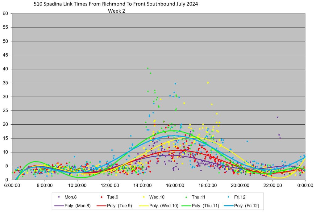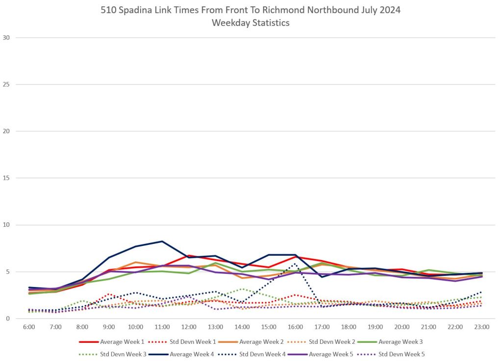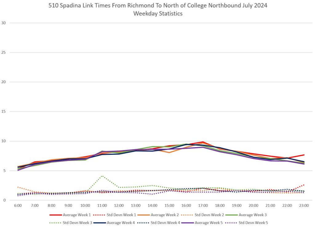 Southbound travel times from Richmond to Front were high through the early afternoon and evening until Week 5 when the reserved transit lane was implemented. The short turn via Front and Blue Jays Way had some benefit, but congestion routinely spread north of Front delaying the buses.