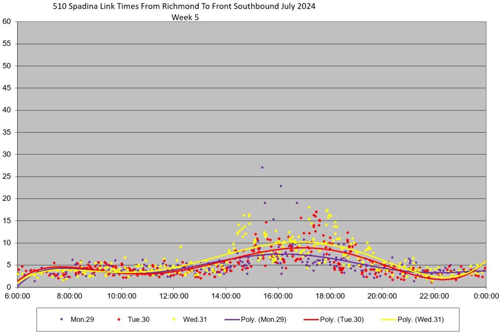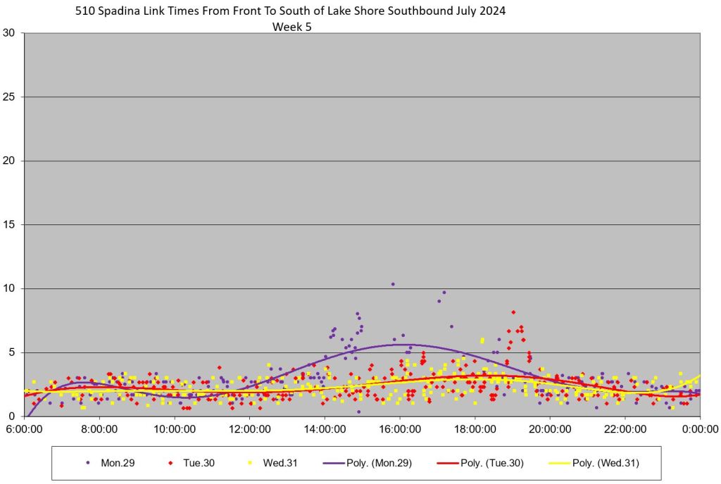 An important point in these charts is that the period of extensive southbound delay was longer than the 3-7pm window for the Front Street short turn, and the congestion extended well north of Front making a more extensive transit priority lane essential to well north of King Street.