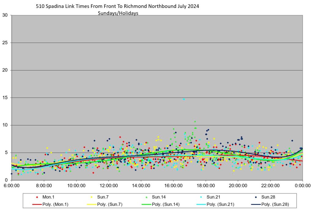 Each set of charts below tracks the movement of buses on 510 Spadina from 7am until 1am on the following day.