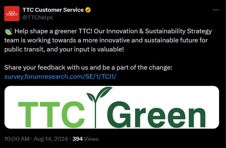 The TTC seeks feedback on its Innovation and Sustainability Strategy. As I write this, the announcement has been posted on X/Twitter, but not on the main TTC page. Instead, it is well hidden, like so much on the TTC site, among many items on the “Riding the TTC” page under “Green Initiatives”. There is a link from the survey’s introductory page, but this is only available when launching the survey, not afterward. Within the Green Initiatives page is a link to the TTC’s 2024-2028 Draft Innovation and Sustainability Strategy, a 50-page document that puts the survey in a wider context, but which most readers are unlikely to access, let alone read.