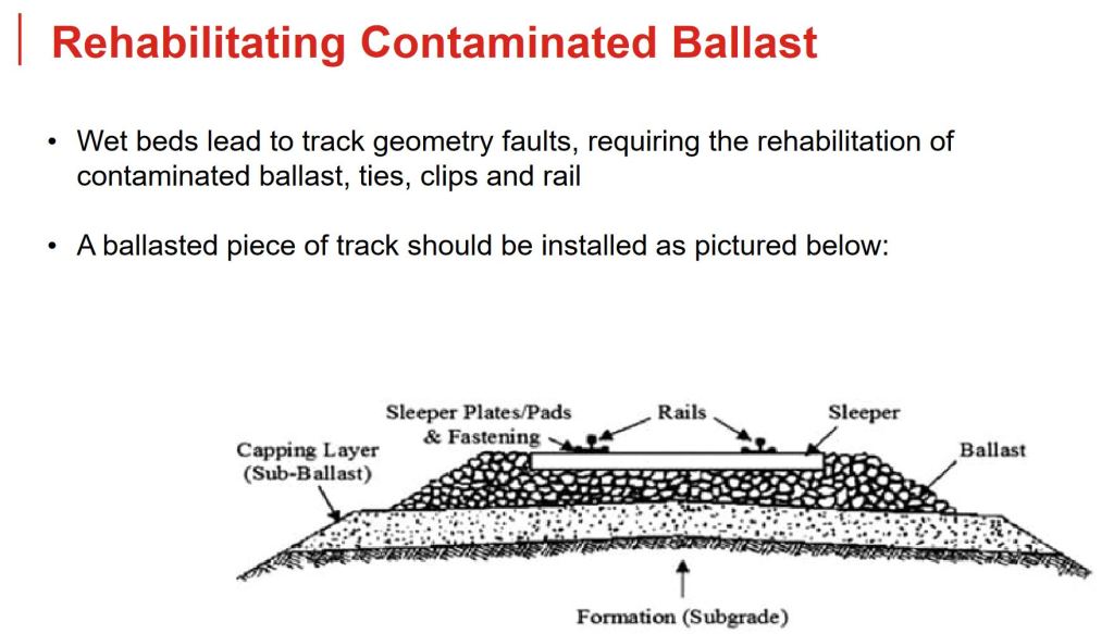 An example of the type of problem that can occur on open track is degradation of ballast due to poor drainage.