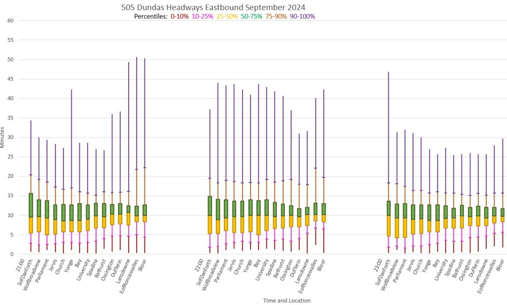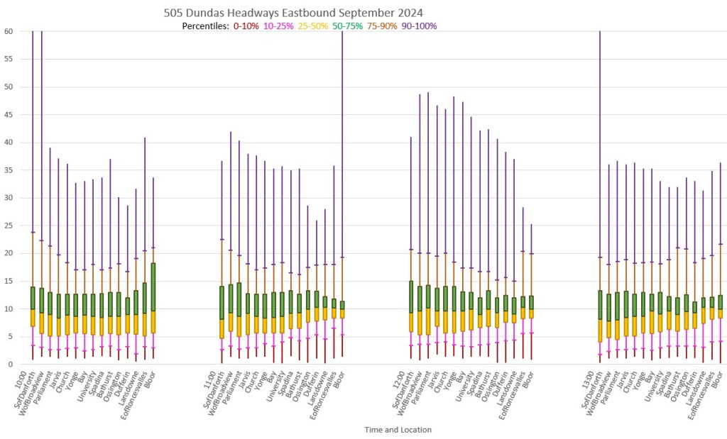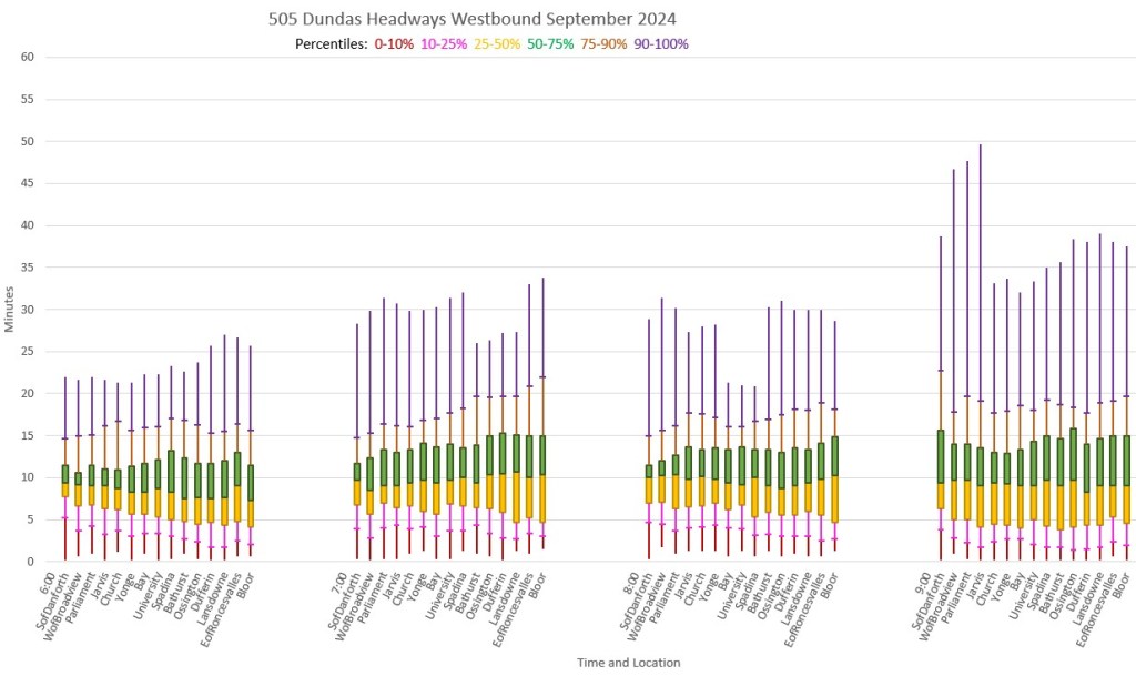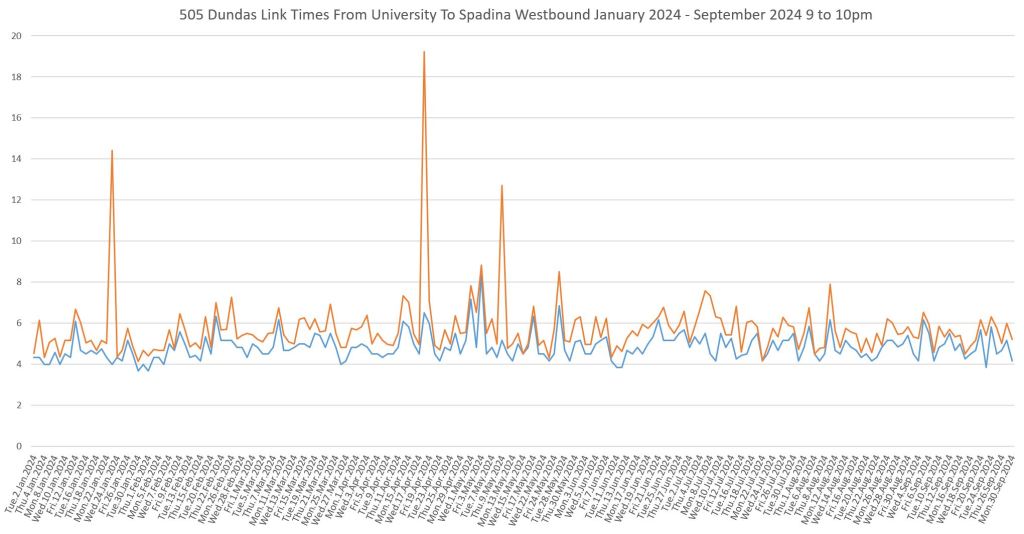 An added topic at the end is a review of travel times on Dundas between University Avenue and Bathurst Street and the effect of parking restrictions that were implemented there earlier in 2024.