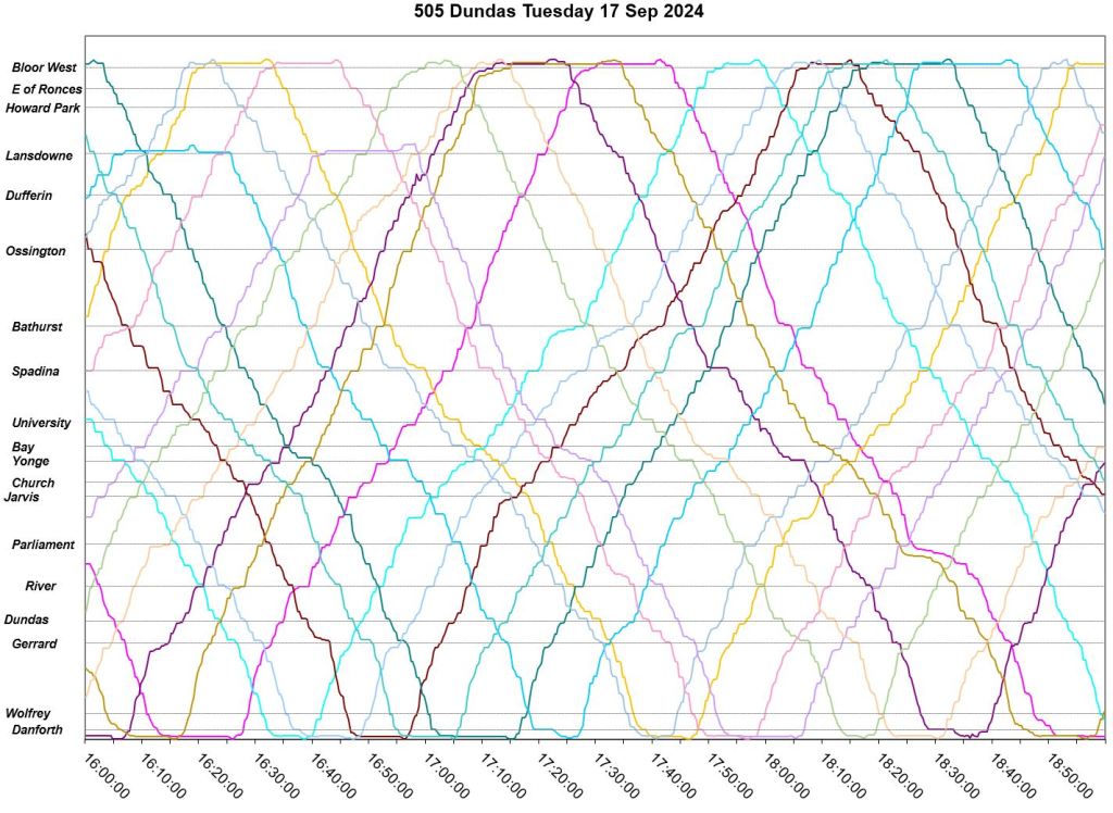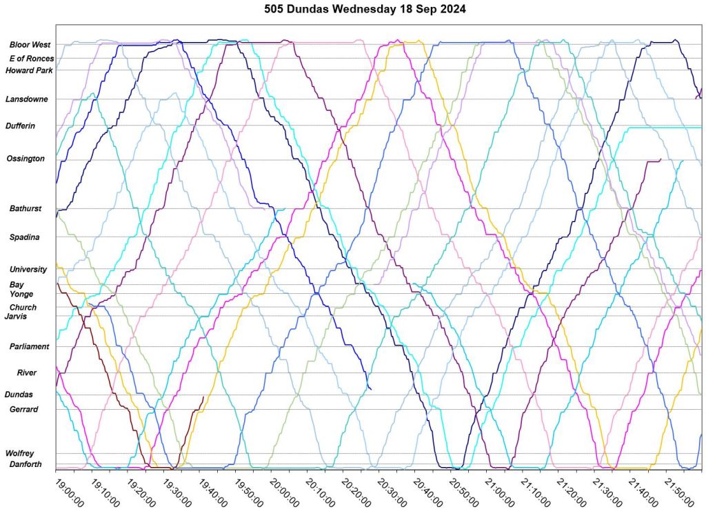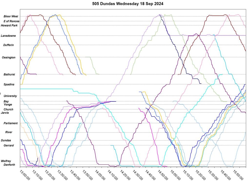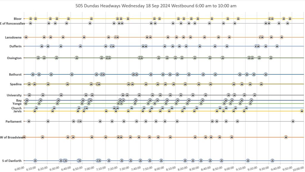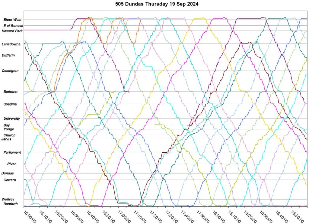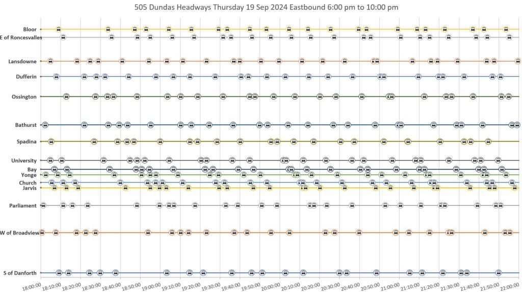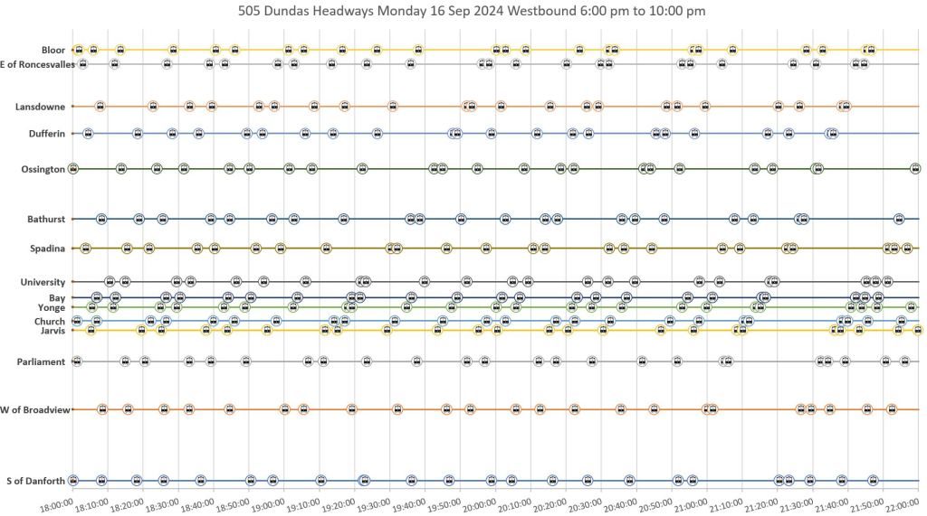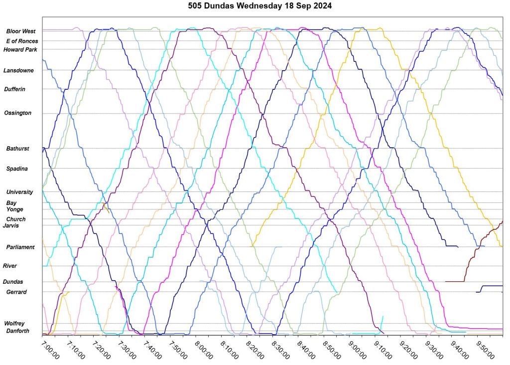 For 505 Dundas, I will look at seven days’ operation from Monday, September 16 to Sunday, September 22. The intent is to show that conditions on the route are not “one of” instances, but a continuing pattern. The article includes: