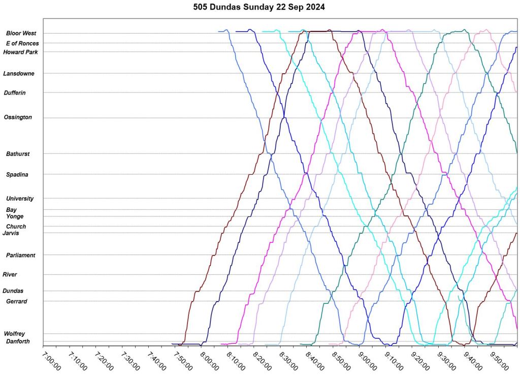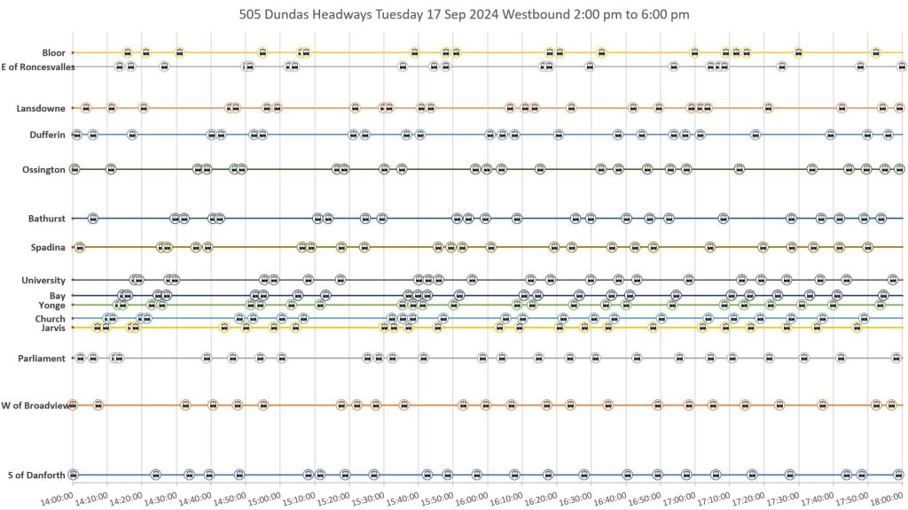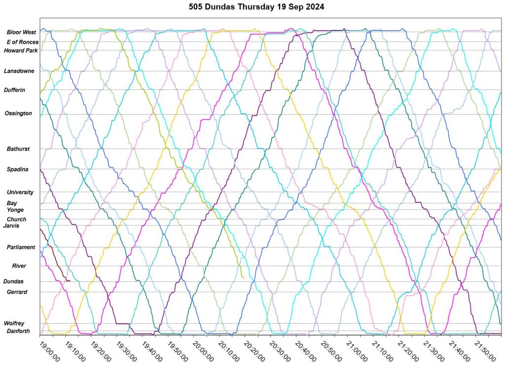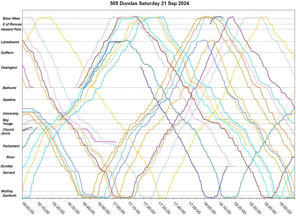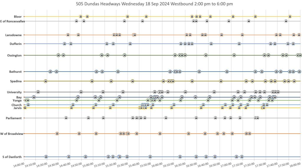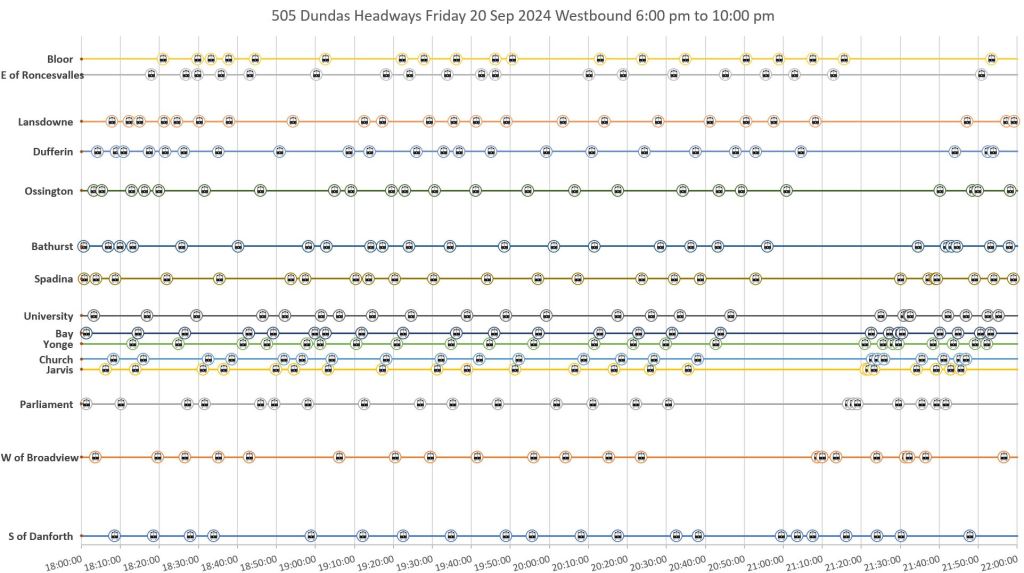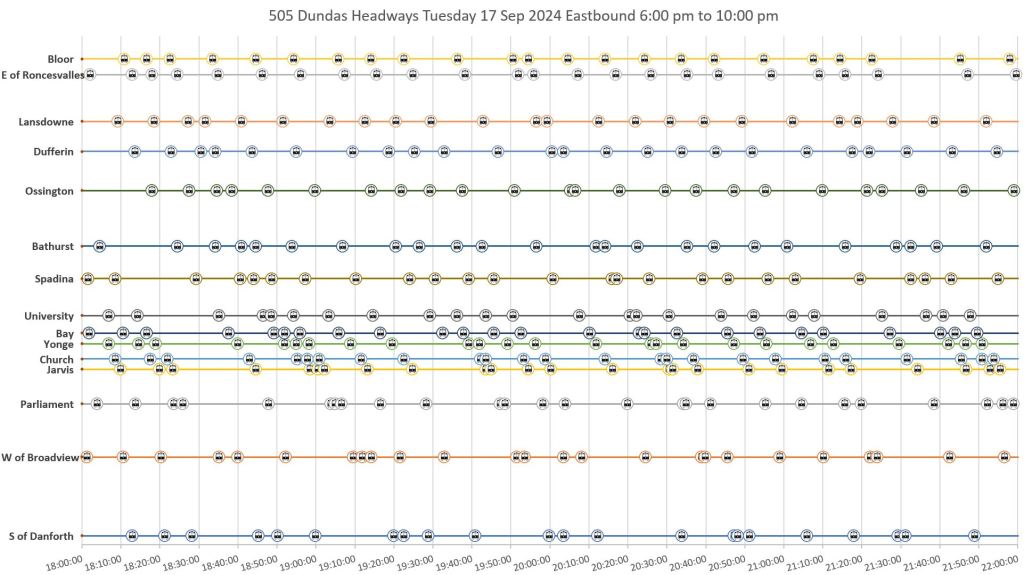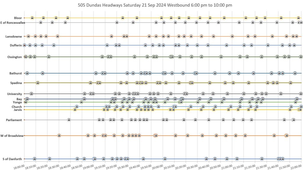 For 505 Dundas, I will look at seven days’ operation from Monday, September 16 to Sunday, September 22. The intent is to show that conditions on the route are not “one of” instances, but a continuing pattern. The article includes:
