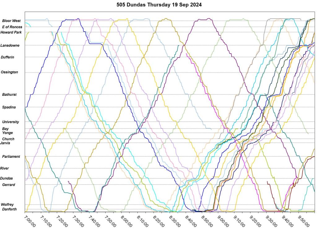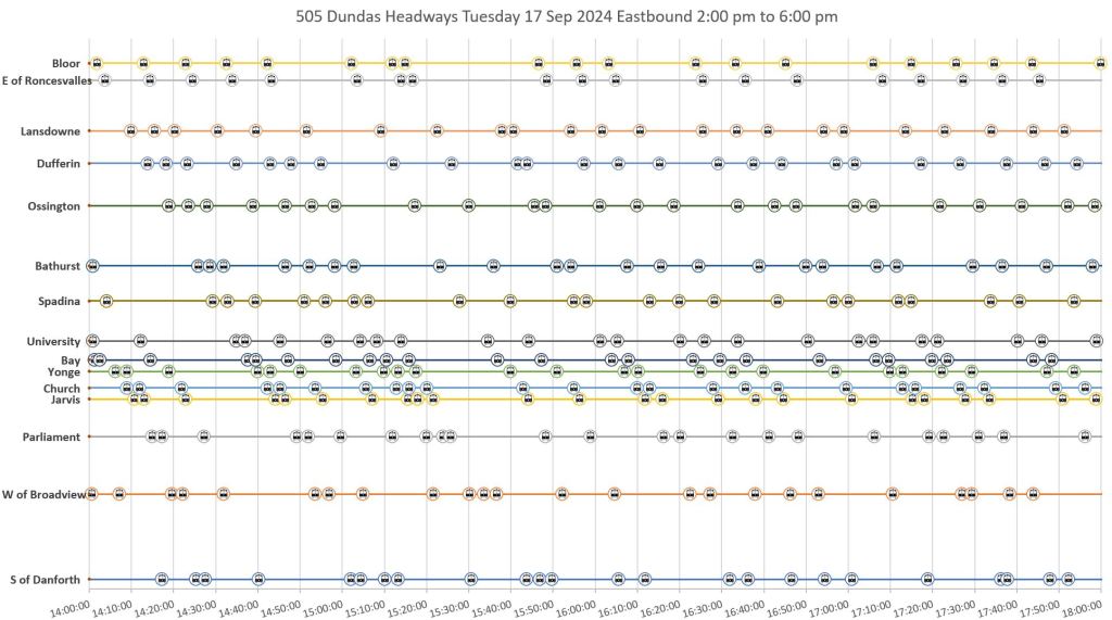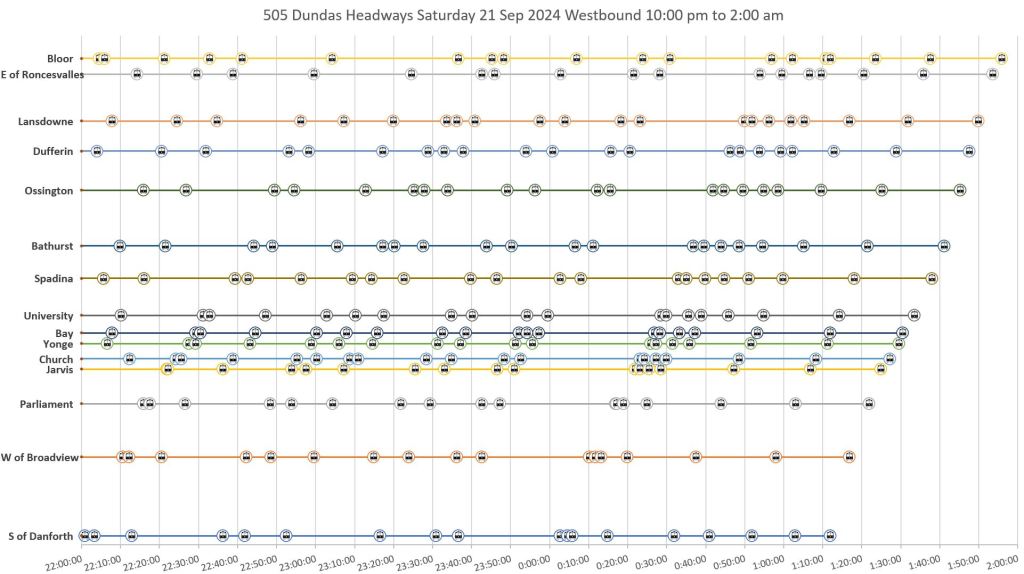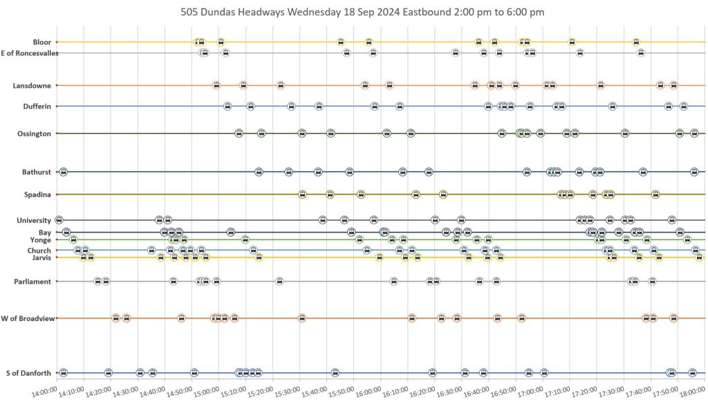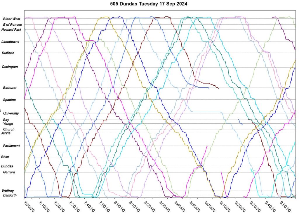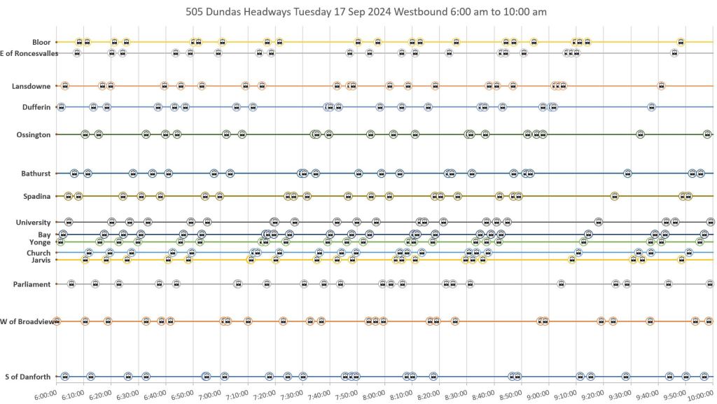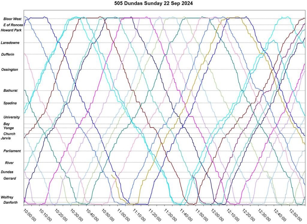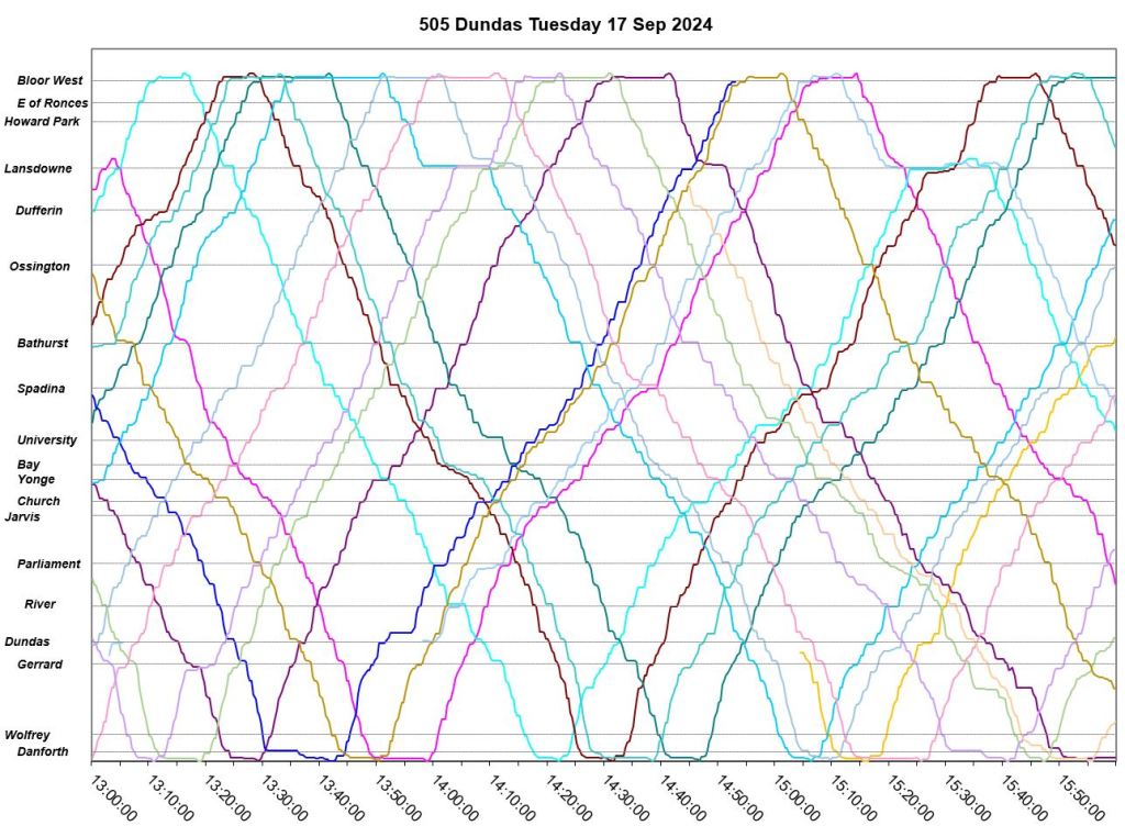 For 505 Dundas, I will look at seven days’ operation from Monday, September 16 to Sunday, September 22. The intent is to show that conditions on the route are not “one of” instances, but a continuing pattern. The article includes: