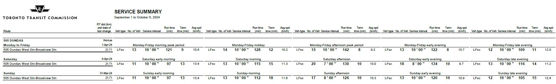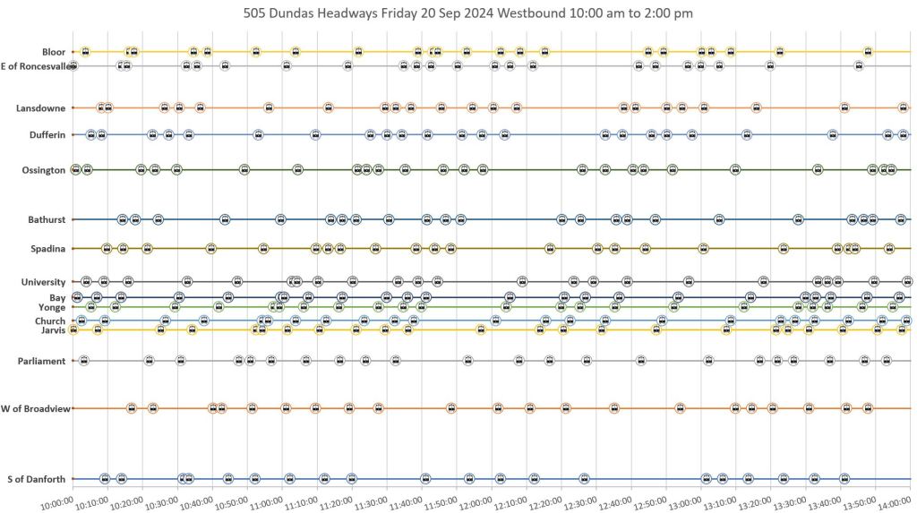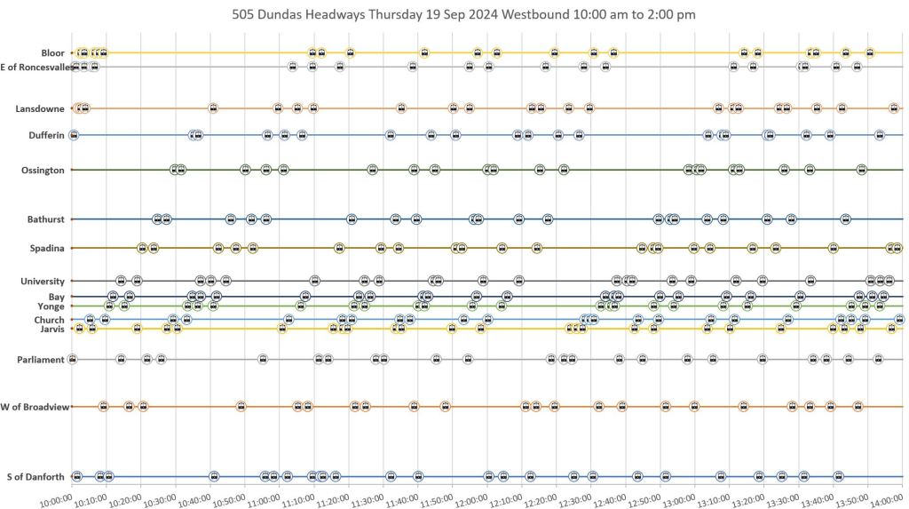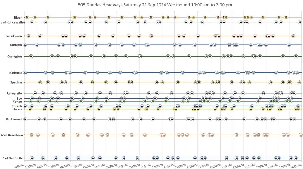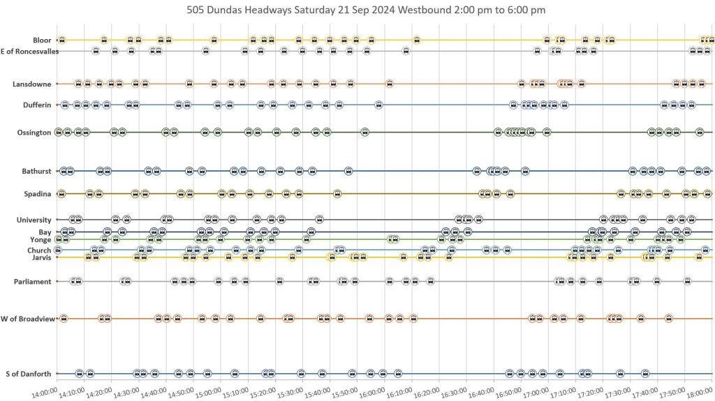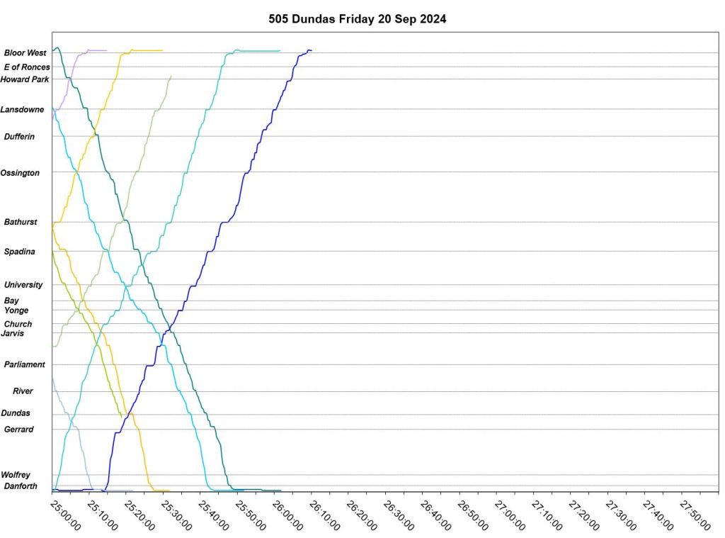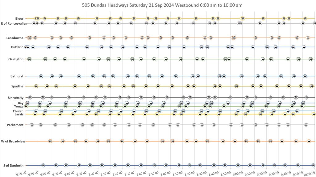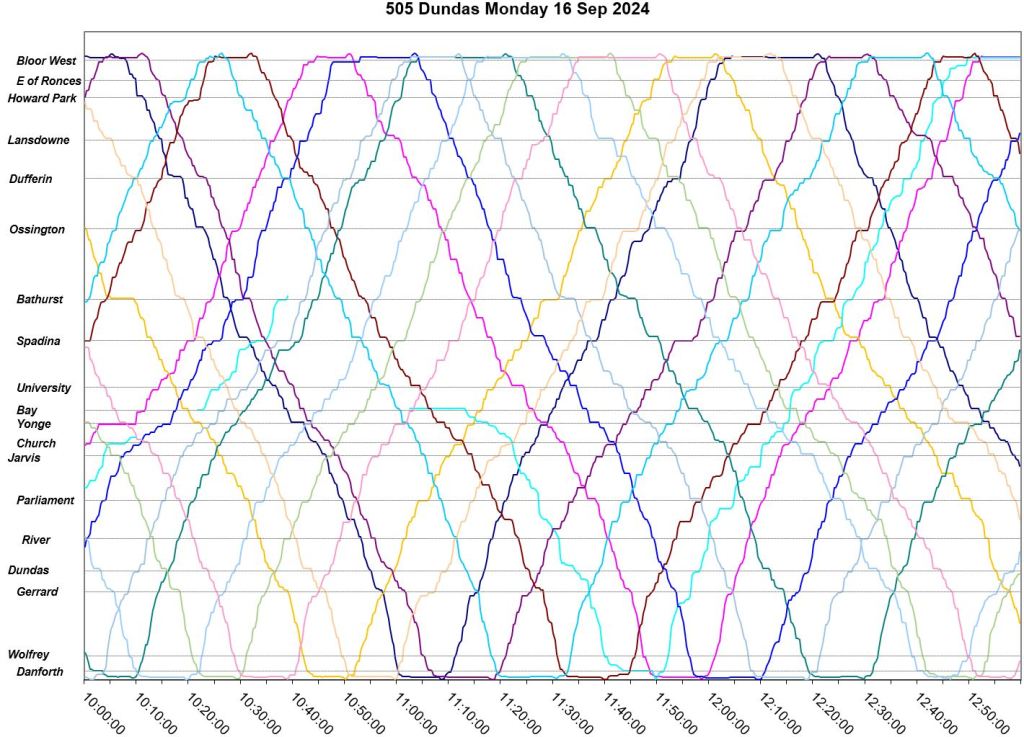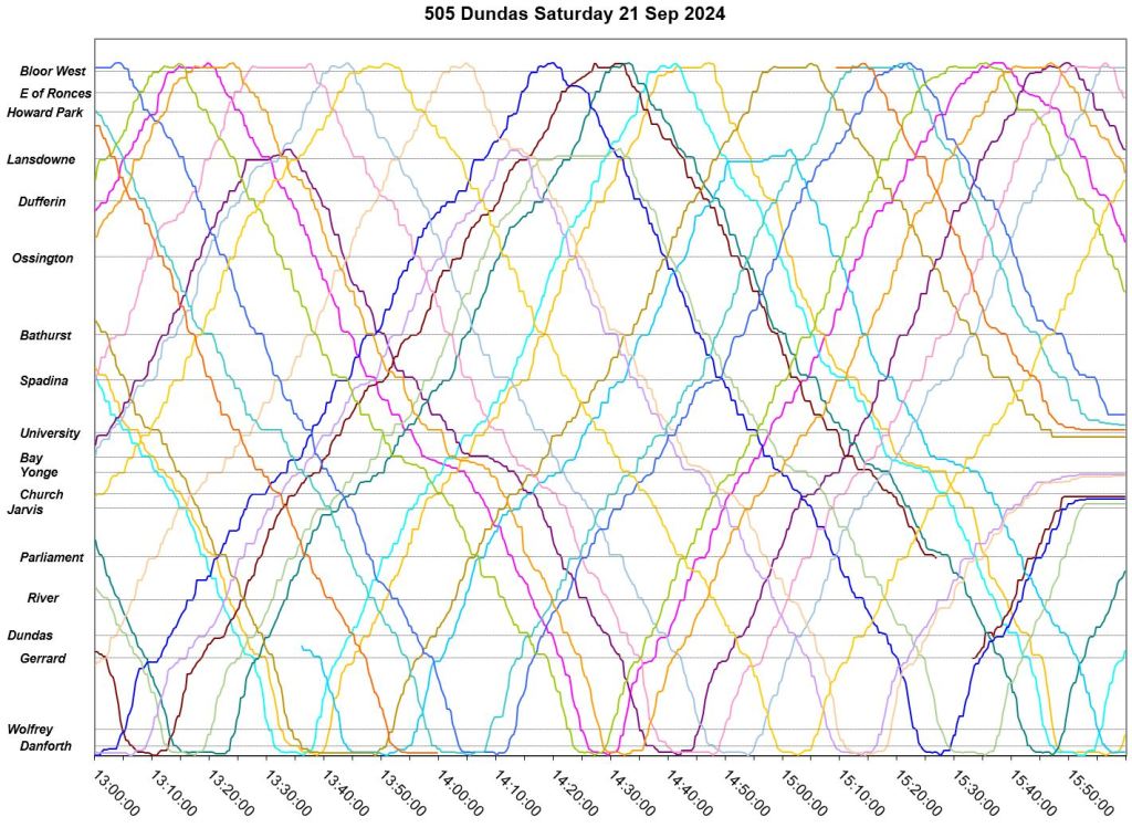 For 505 Dundas, I will look at seven days’ operation from Monday, September 16 to Sunday, September 22. The intent is to show that conditions on the route are not “one of” instances, but a continuing pattern. The article includes: