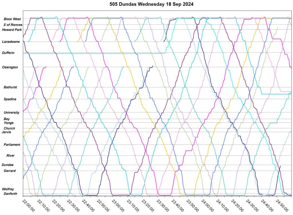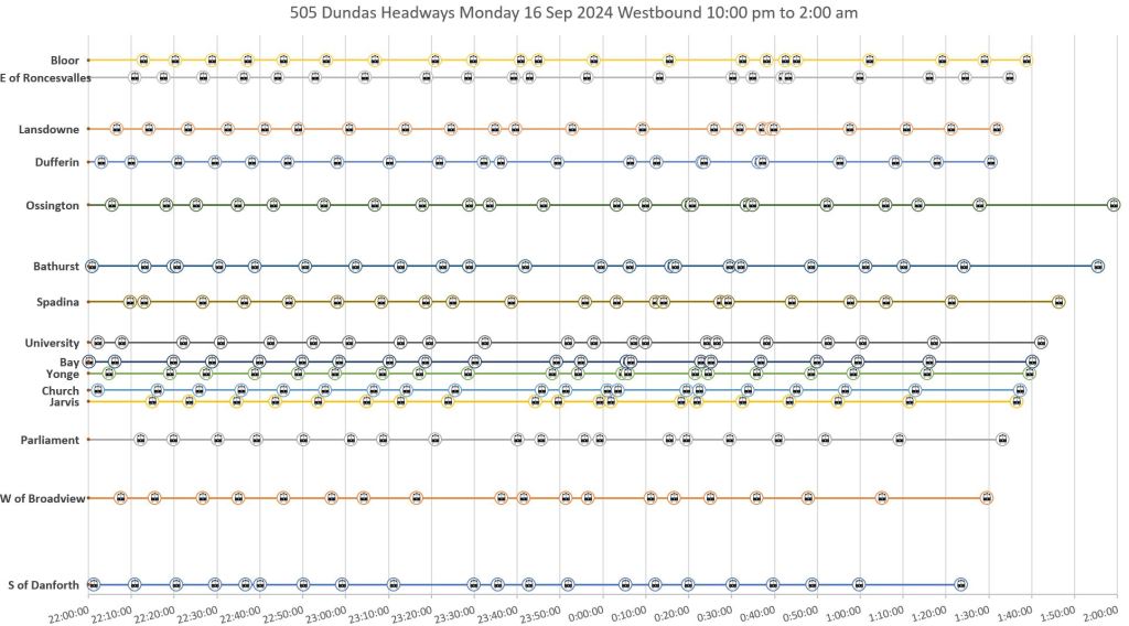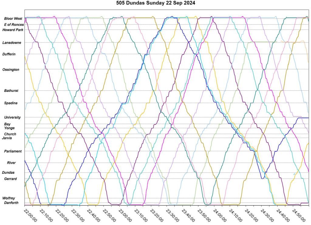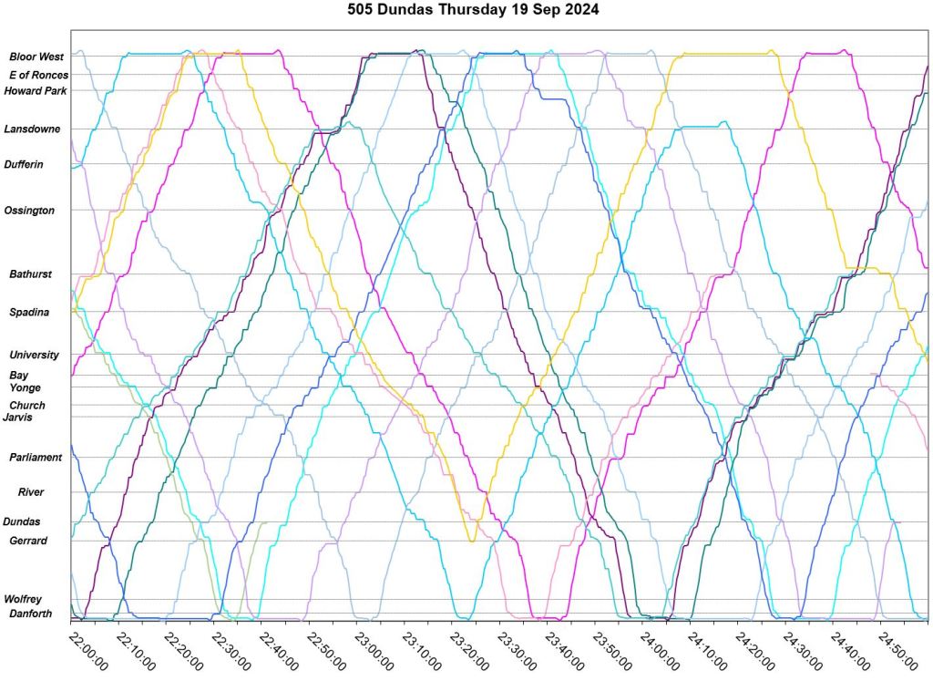 After midnight there was a delay eastbound between Bathurst and Spadina that caused all cars to be diverted via Bathurst, College and Bay until the end of service. (The chart for the period after 1am is included in the PDF chart sets at the end of the article.)