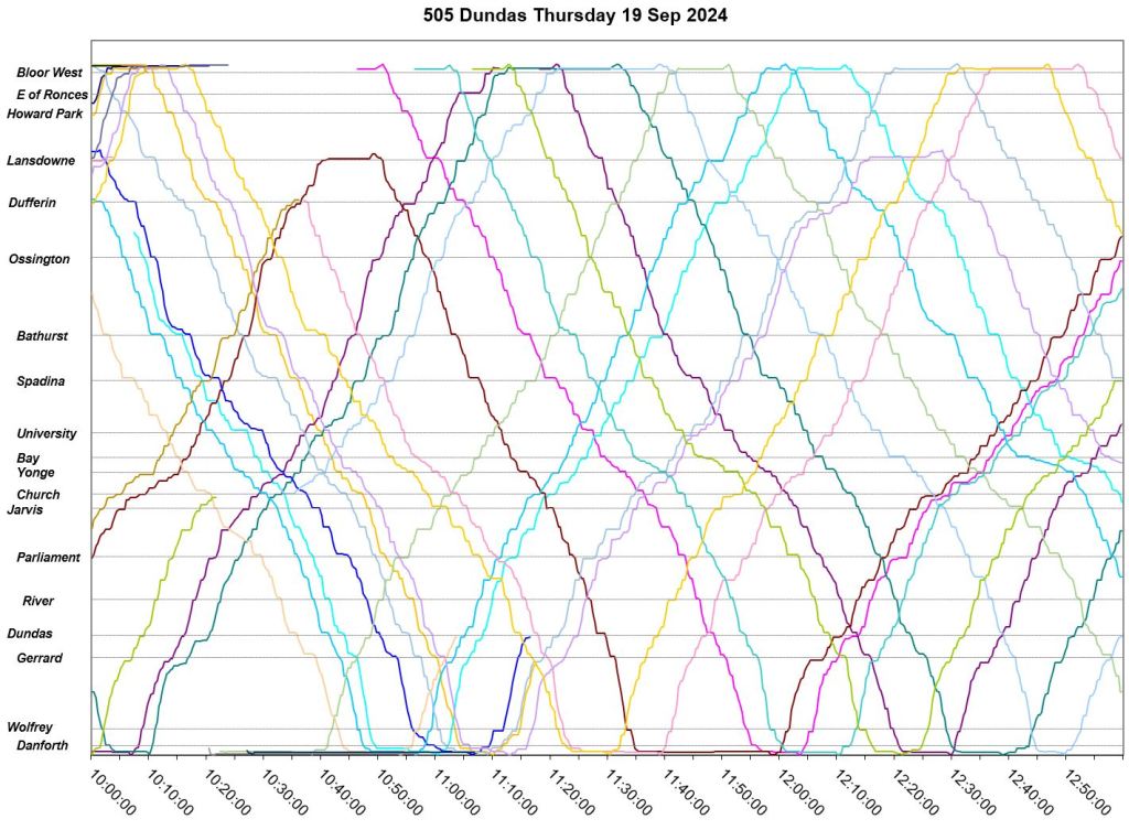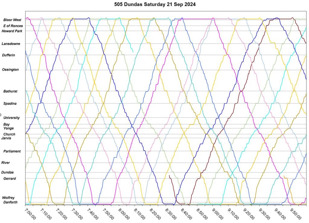 - Service is broken in the central area just after 9am as cars go off route. The resulting westbound gap is not sorted out until the return trip from Dundas West after 10am.