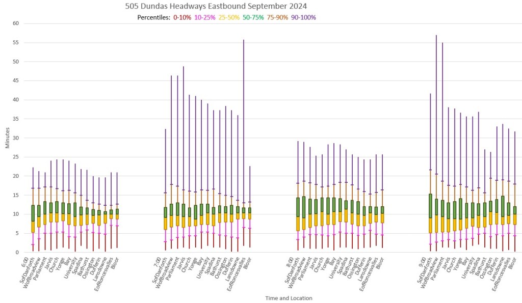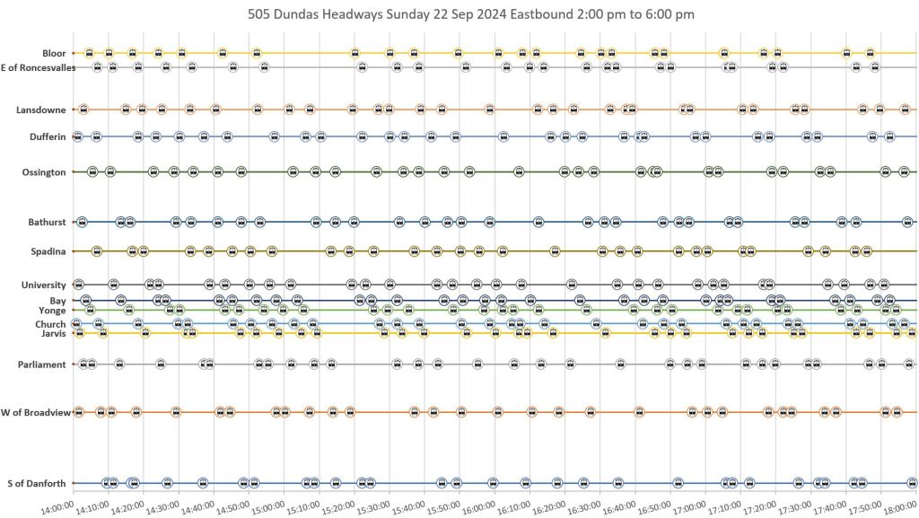 Eastbound service shows a similar pattern with even service at Dundas West becoming bunched as cars move eastward across the line.