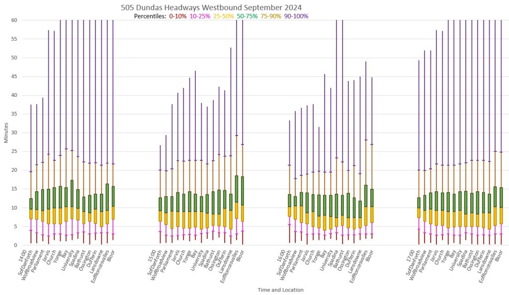 Note that the span of the middle group gets wider as one goes along the route (left to right for westbound charts, right to left for eastbound). This illustrates the inherent limitation of reporting “on time” stats only for terminals because that is not where most riders actually encounter the service. Also, the height of the upper quartile usually rises along the route as wide gaps get wider. (This can also be affected by short turns where outer ends of a route get less service.)