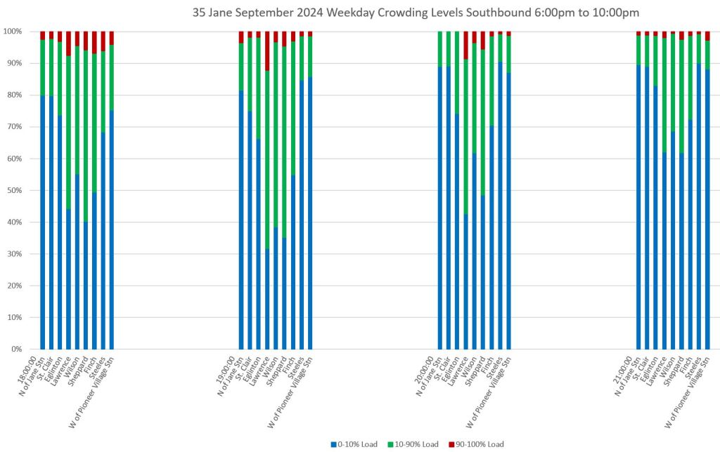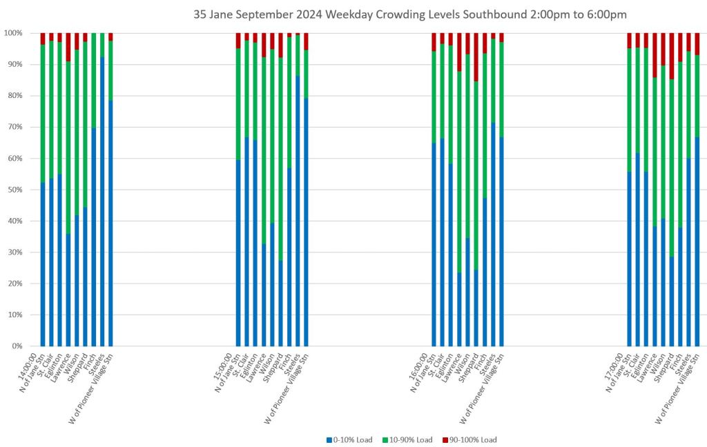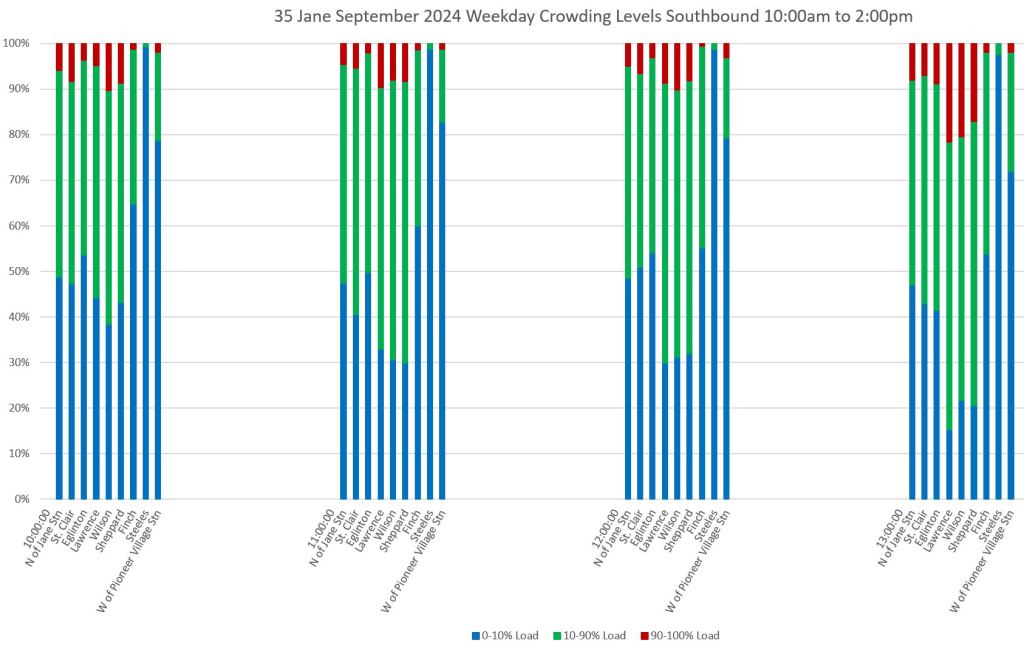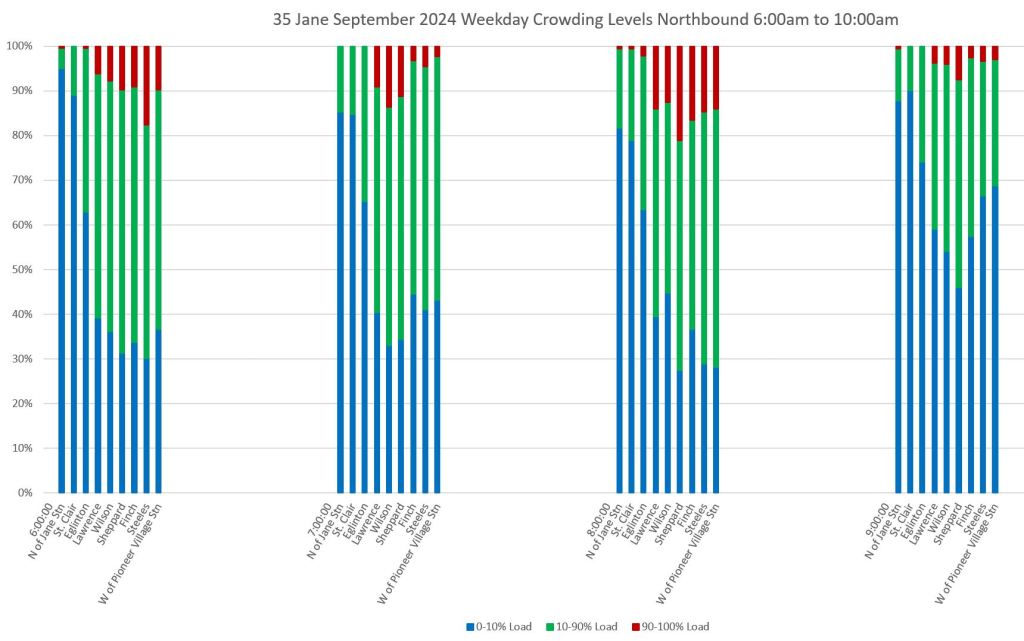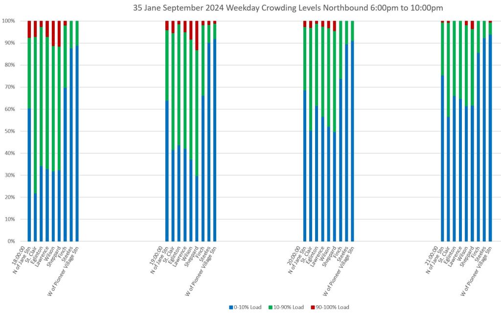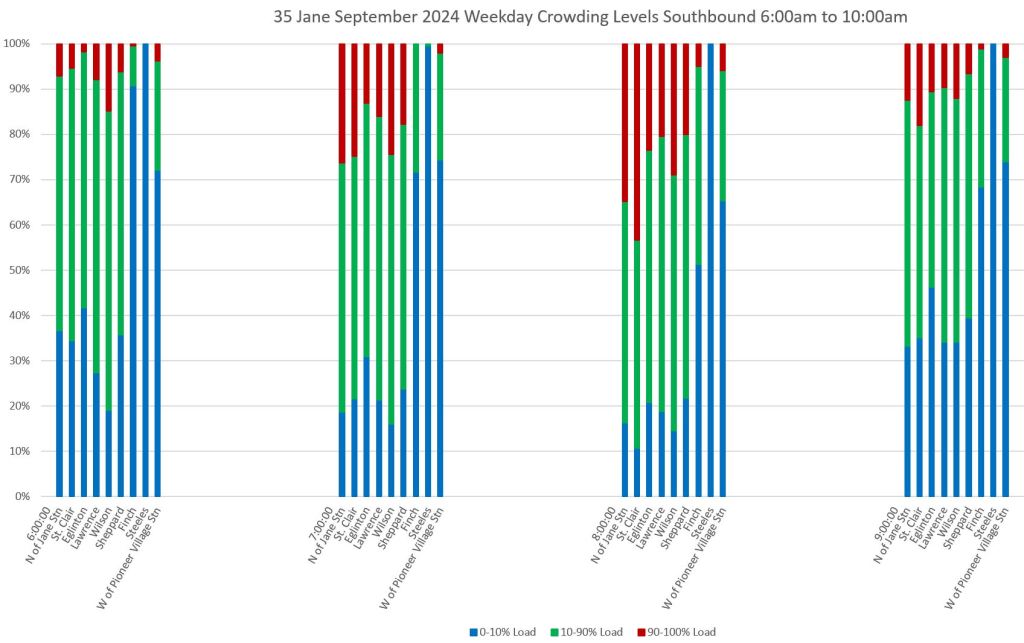 These charts show the proportion of trips on weekdays in September 2024 by location, direction and time reporting the TTC’s three crowding levels: