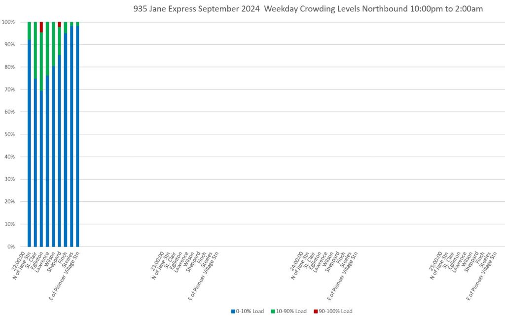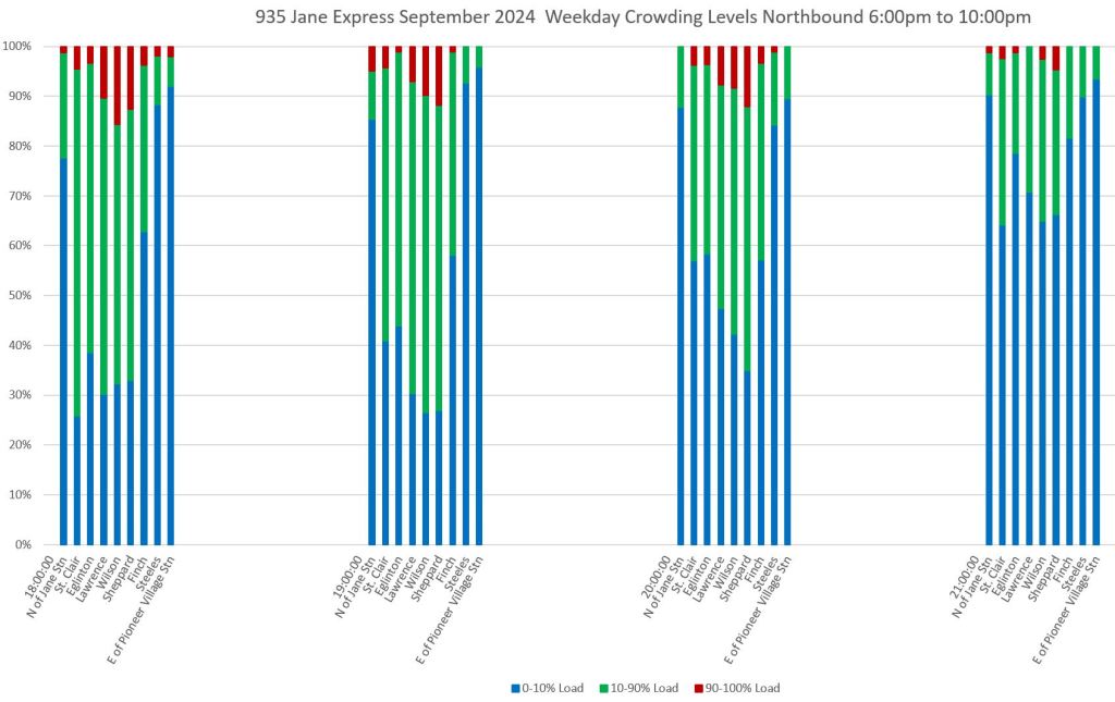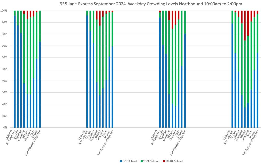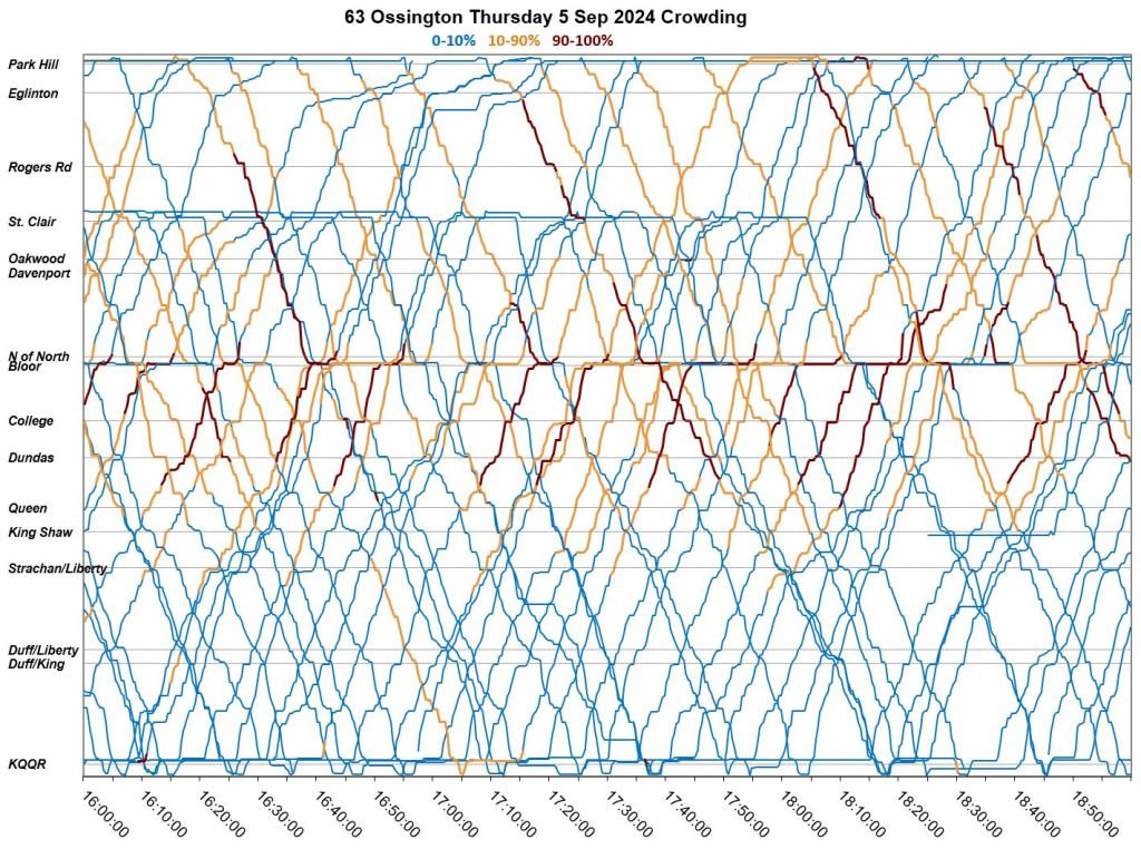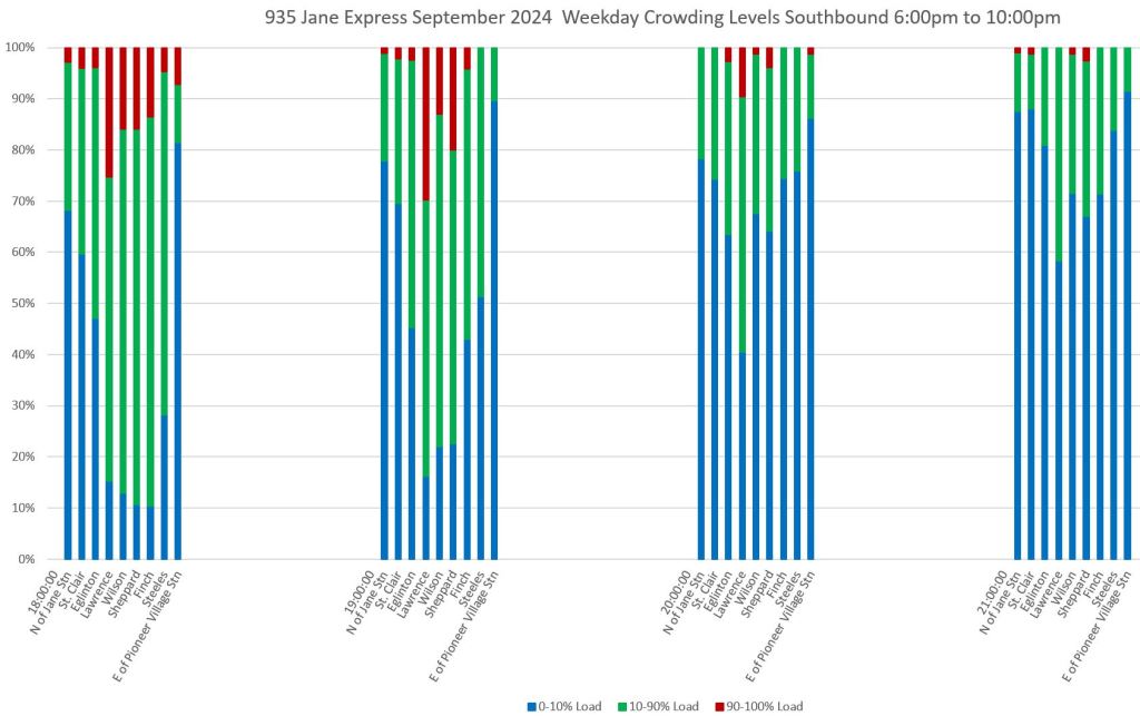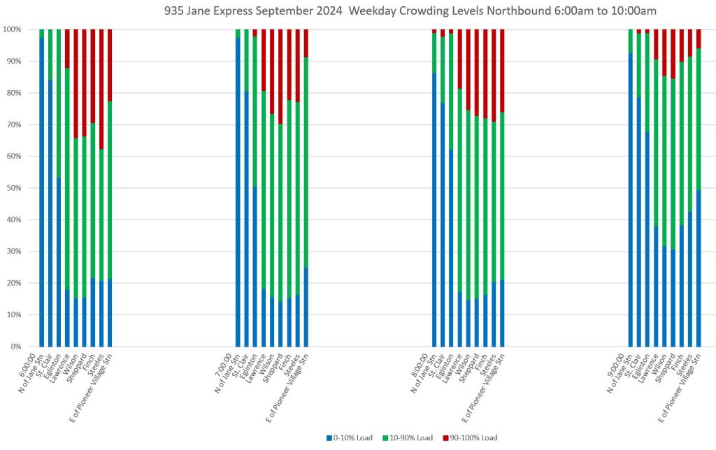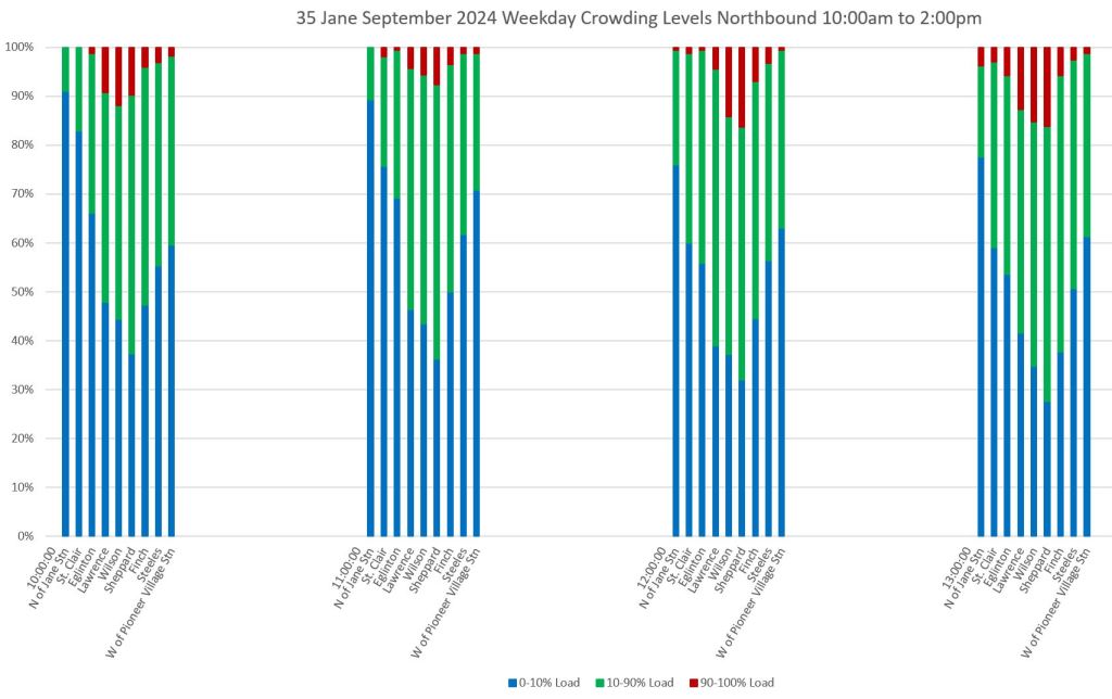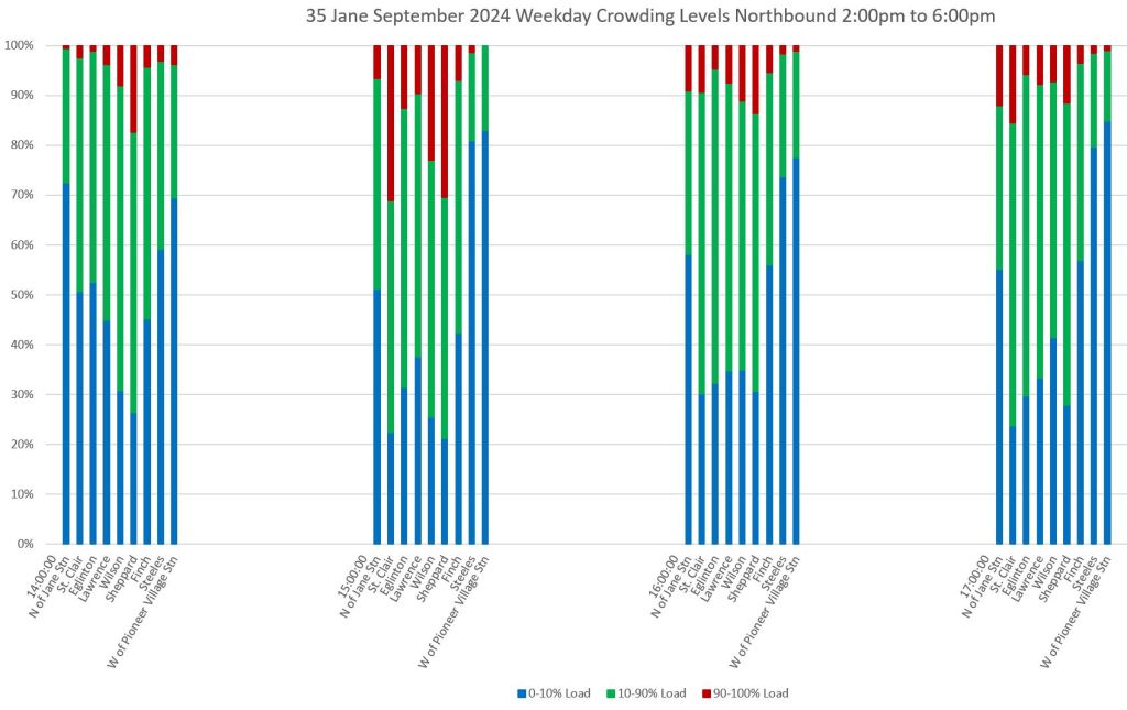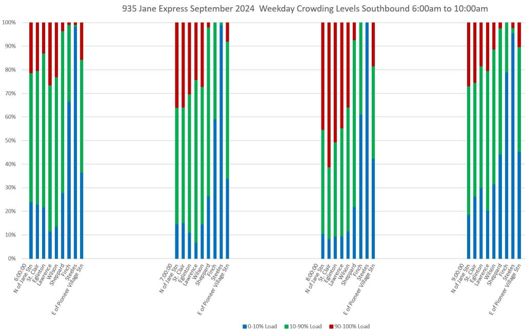 In an attempt to “zoom out”, I developed a new chart format that shows the proportion of service at each crowding level seen at screenlines along a route by time of day. This article presents the results for the routes already published, but I wanted to nail down the format before publishing more. (I have many more in the wings including 25/925 Don Mills, 29/929 Dufferin, 36 Finch West, 39/939 Finch East, 41/941 Keele, 52/952 Lawrence, 53/953 Steeles East, 60/960 Steeles West, 85/985 Sheppard East, 86/986 Scarborough, 89/989 Weston, 116 Morningside, 129 McCowan North, 903 STC Express, and 905 Eglinton East Express).