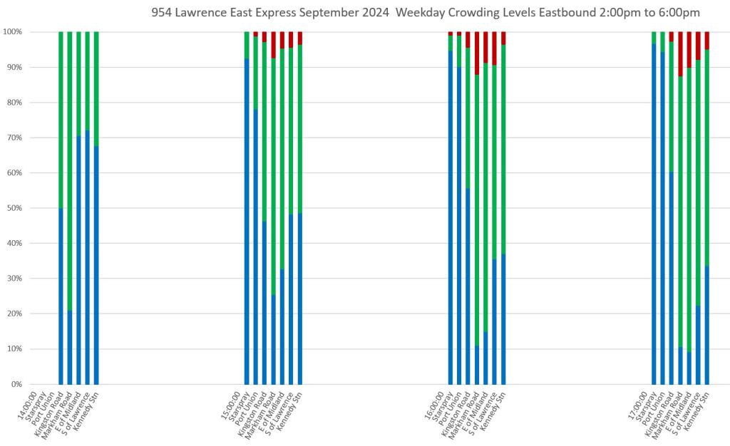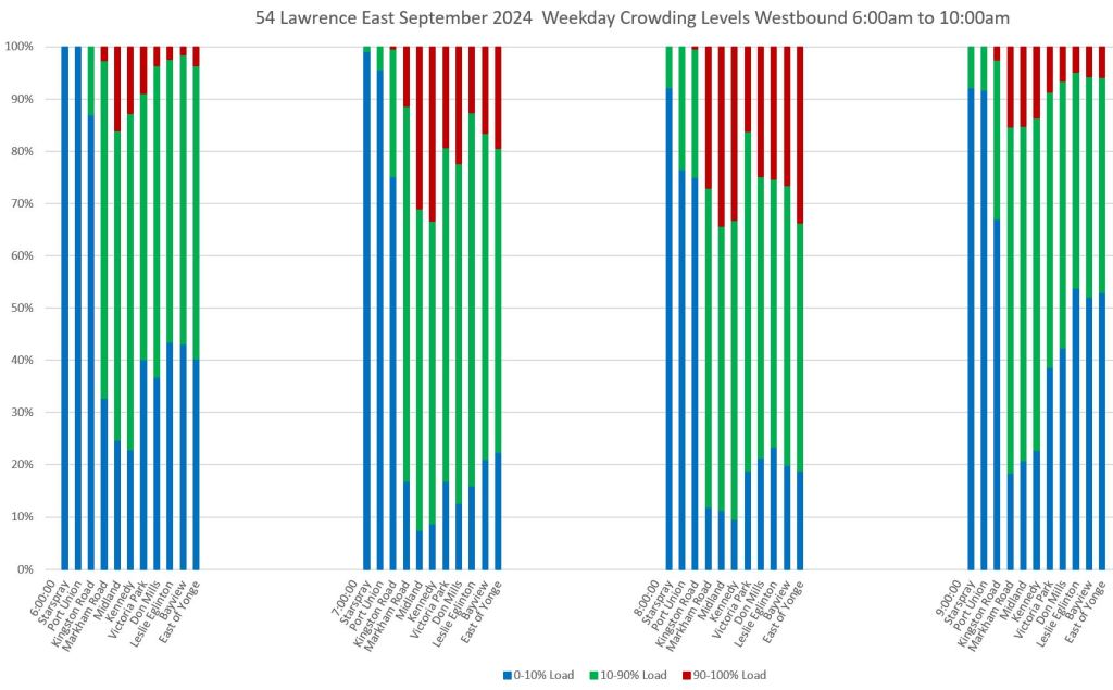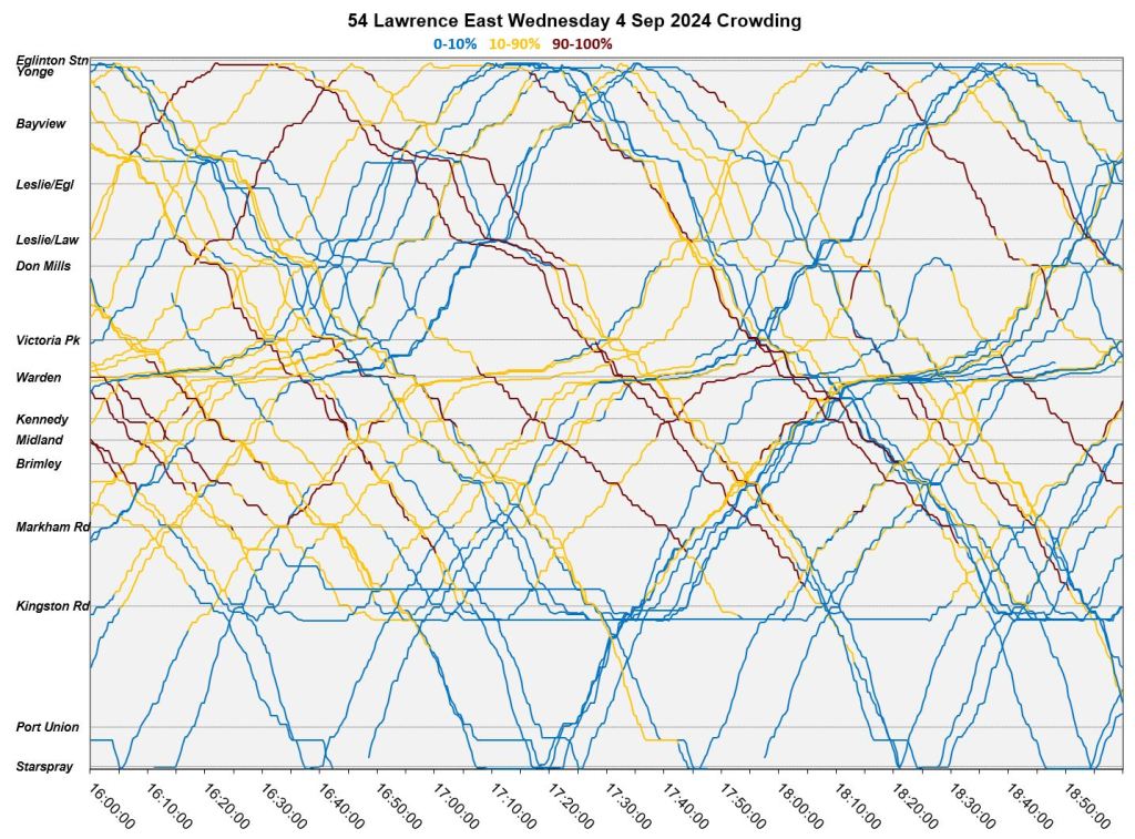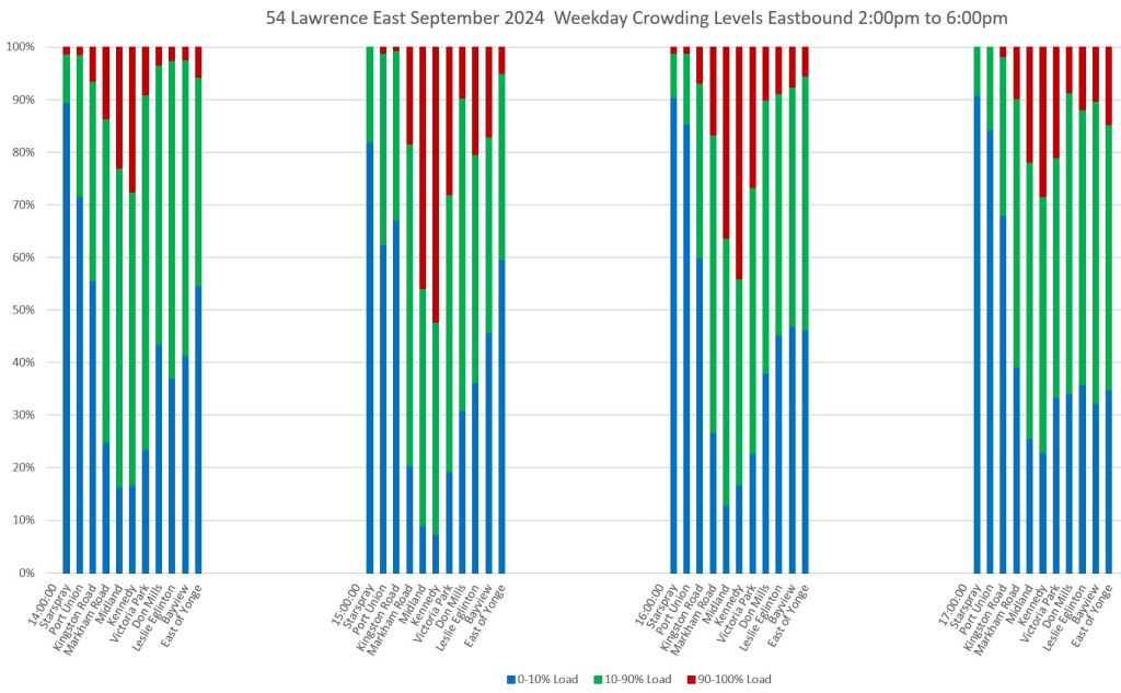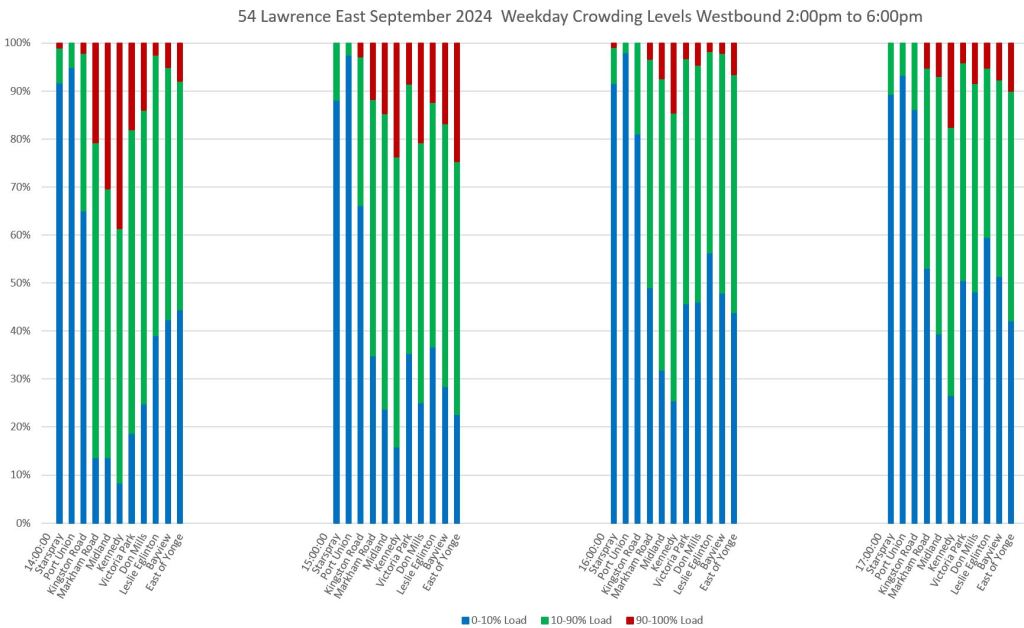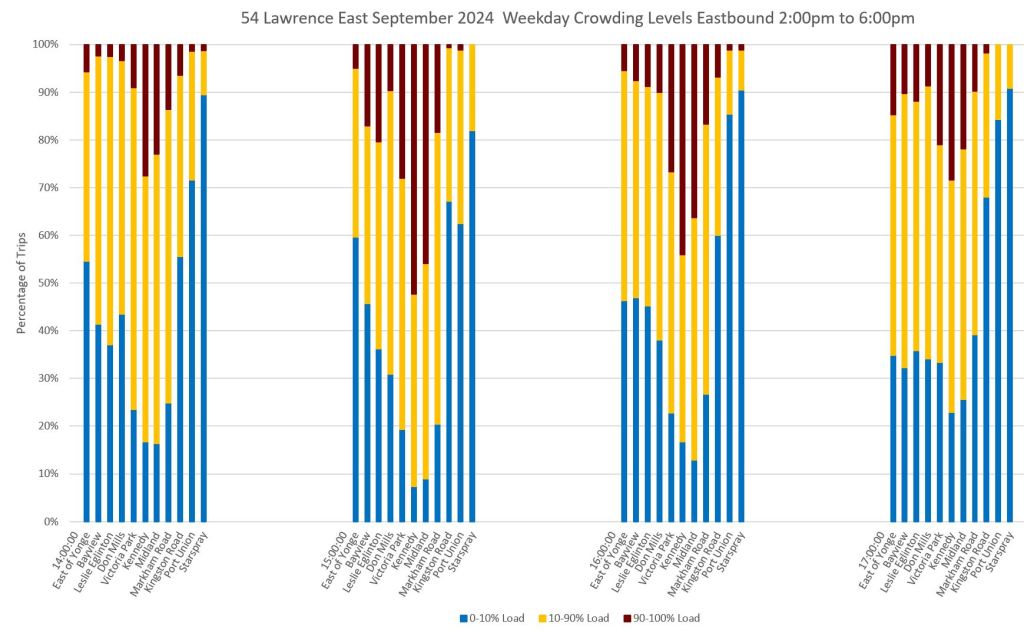 Screenlines for Lawrence East are arrange from east-to-west with Starspray Loop on the left and Eglinton Station on the right. Note that the greatest crowding occurs in the middle of the route.
