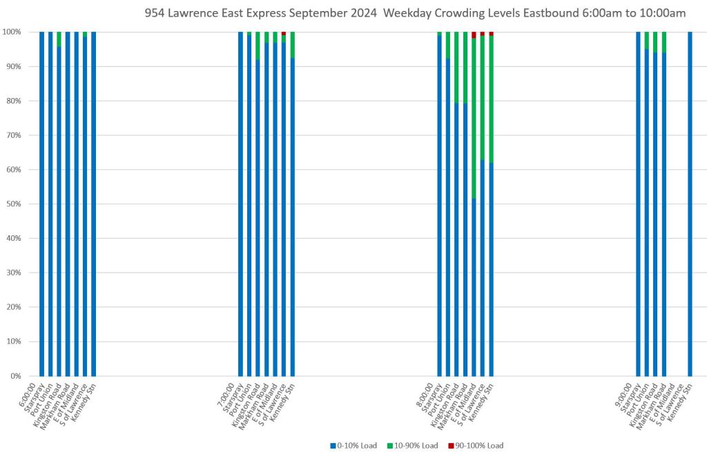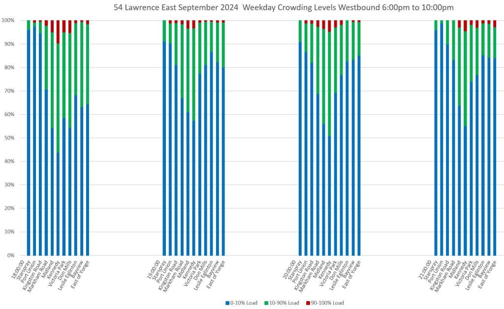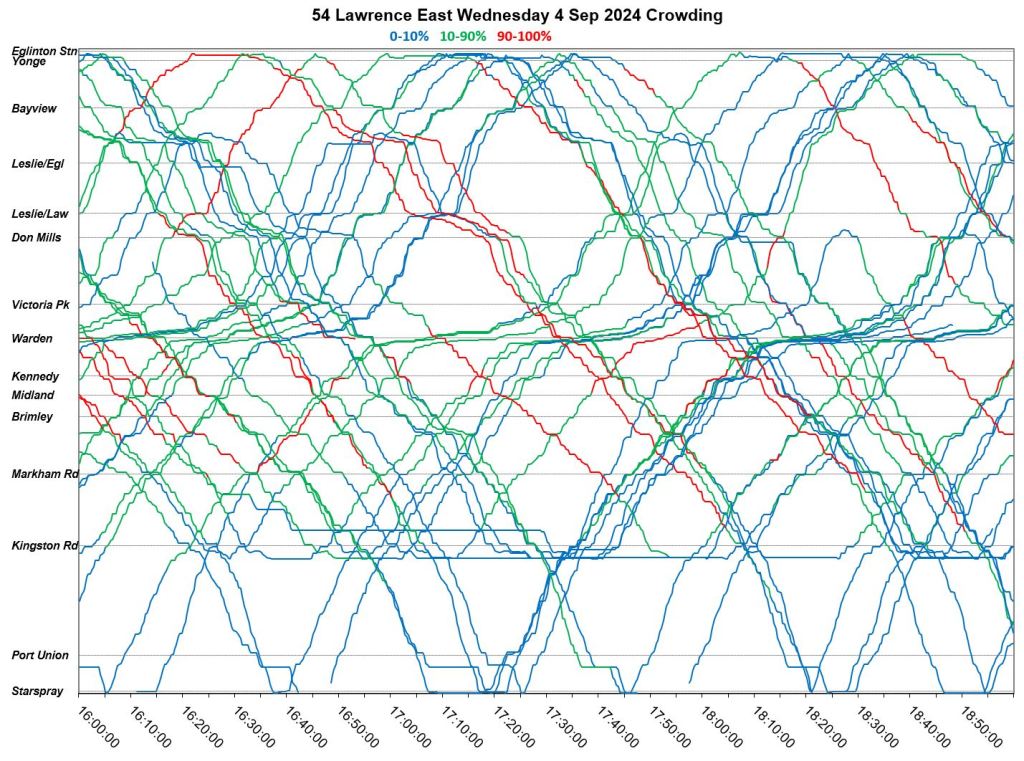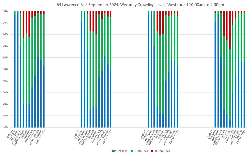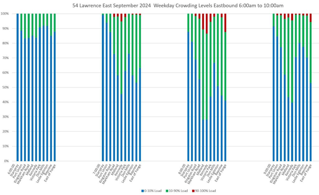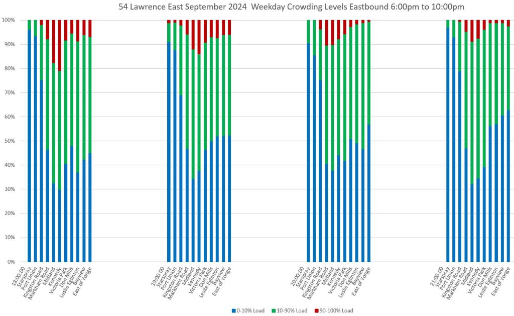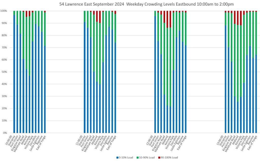 Screenlines for Lawrence East are arrange from east-to-west with Starspray Loop on the left and Eglinton Station on the right. Note that the greatest crowding occurs in the middle of the route.