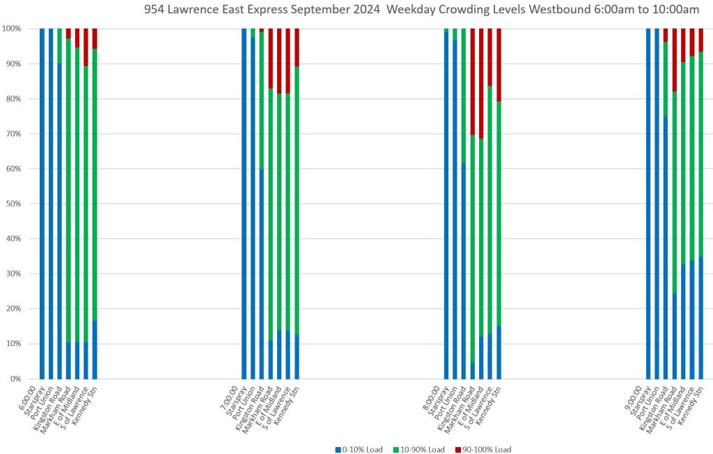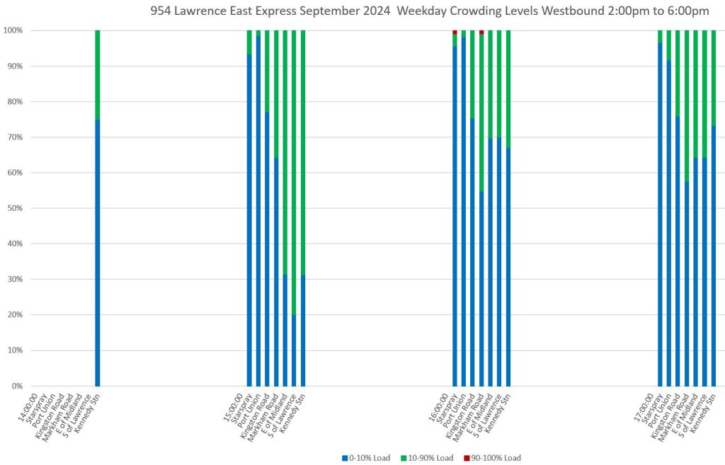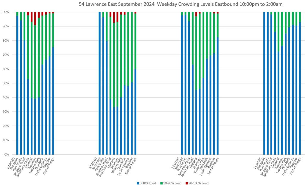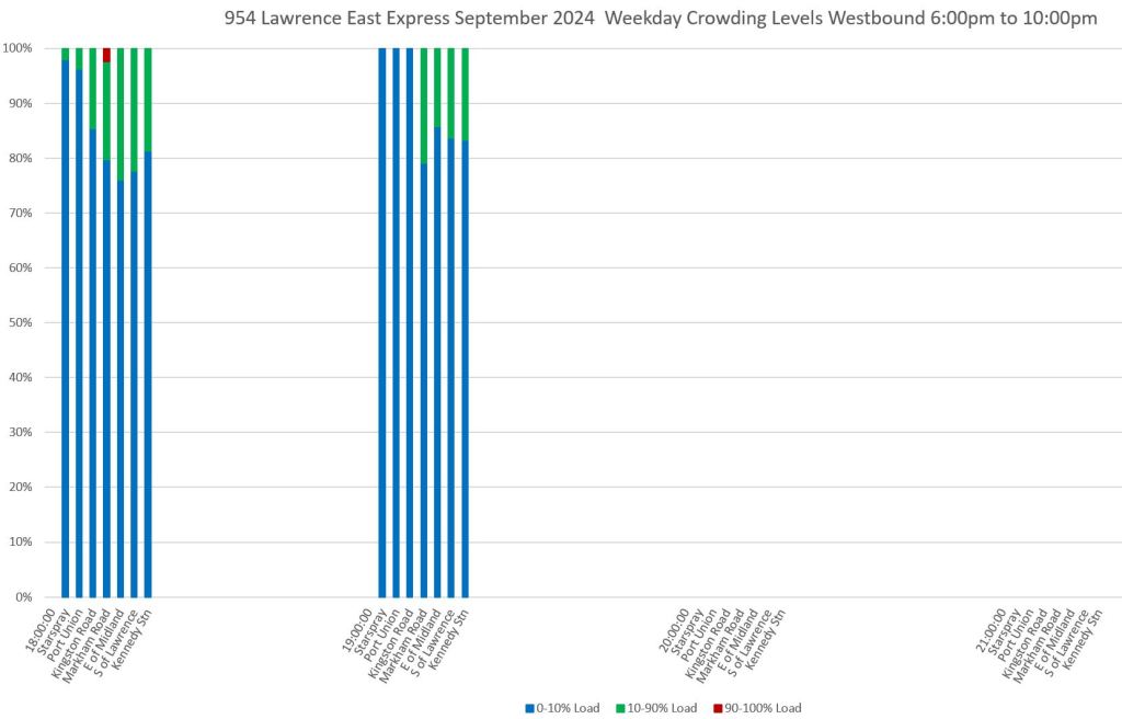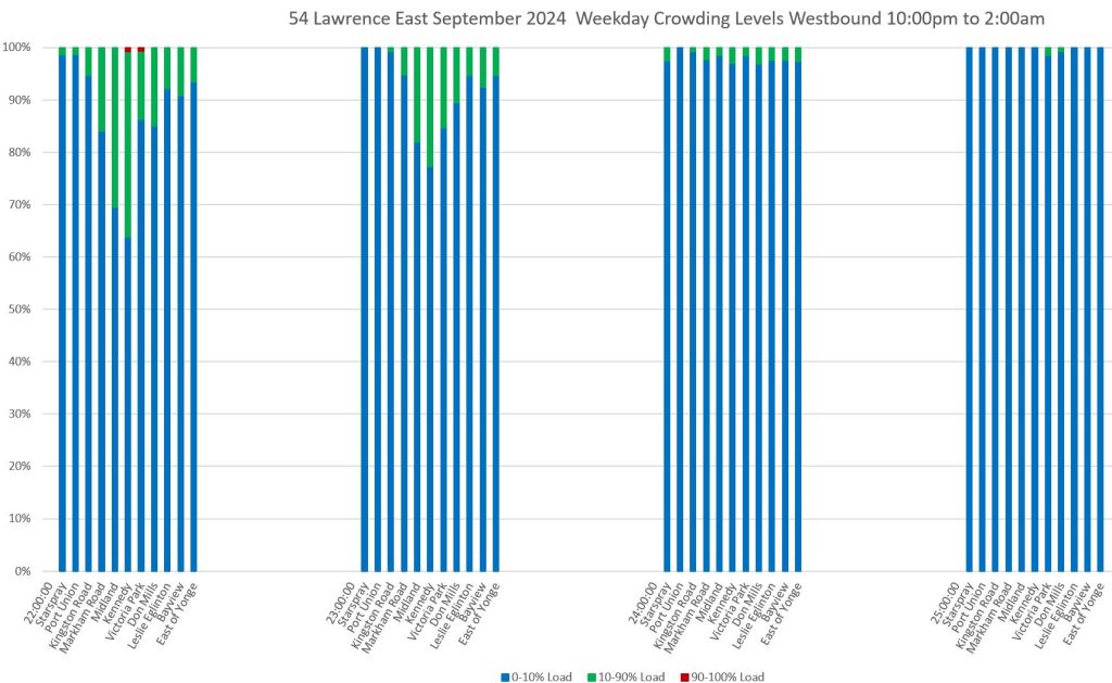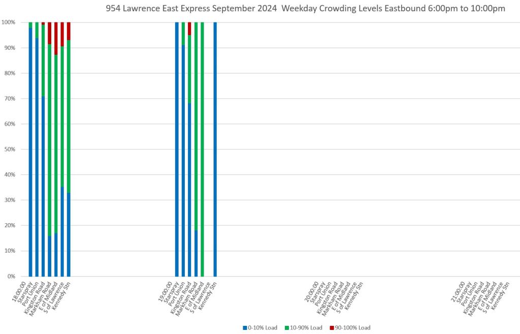 Screenlines for Lawrence East are arrange from east-to-west with Starspray Loop on the left and Eglinton Station on the right. Note that the greatest crowding occurs in the middle of the route.