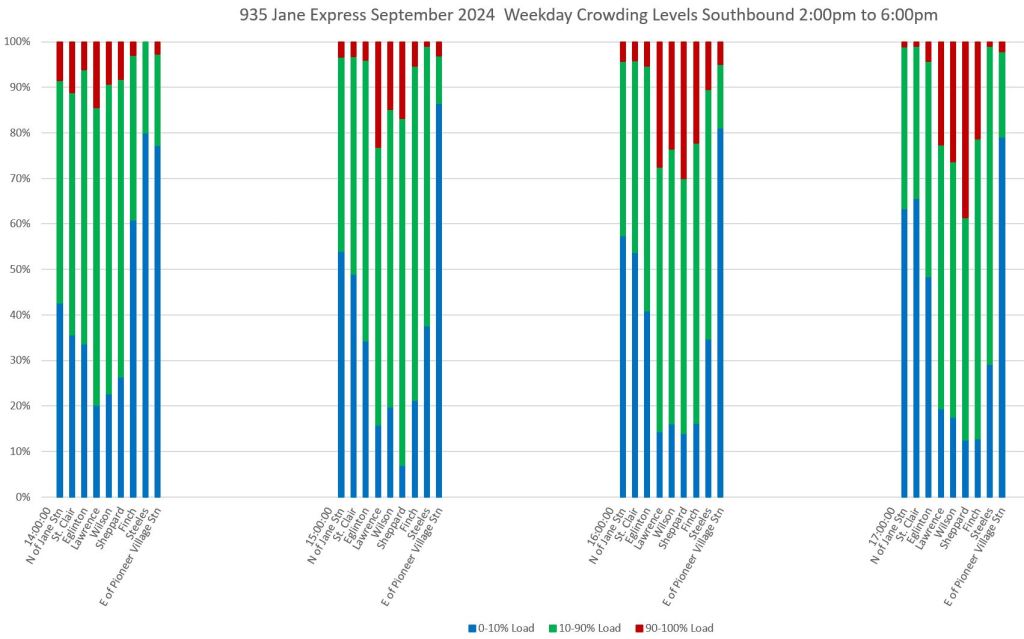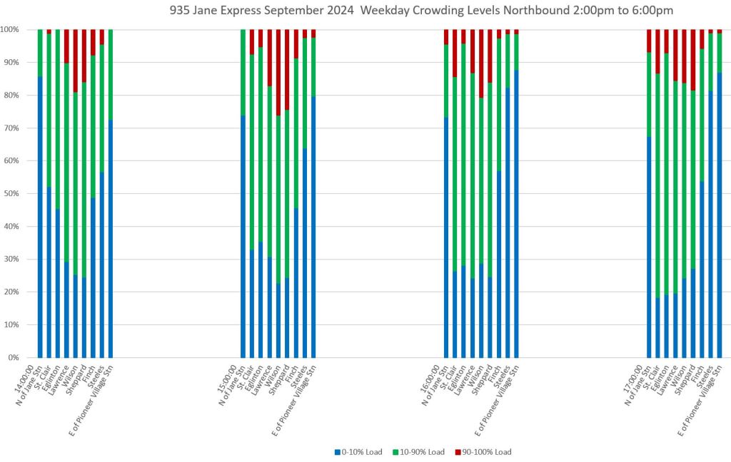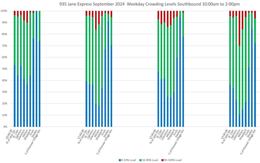 The express service on Jane shows similar patterns to the local service, but with a slightly higher proportion of crowded buses and fewer lightly-loaded vehicles.