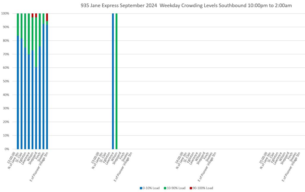 Would it be worth labelling or at least describing the y axis? Do I understand it to be reporting the proportion of services with the coloured load? So do I understand the first bar of the first chart showing for 35 Jane September 2024 weekday that the from the hour starting at 6:00 north of Jane about 95% of services were 0-10% of load, about 4% were 10-90% of load, and about 1% were 90-100% of load?