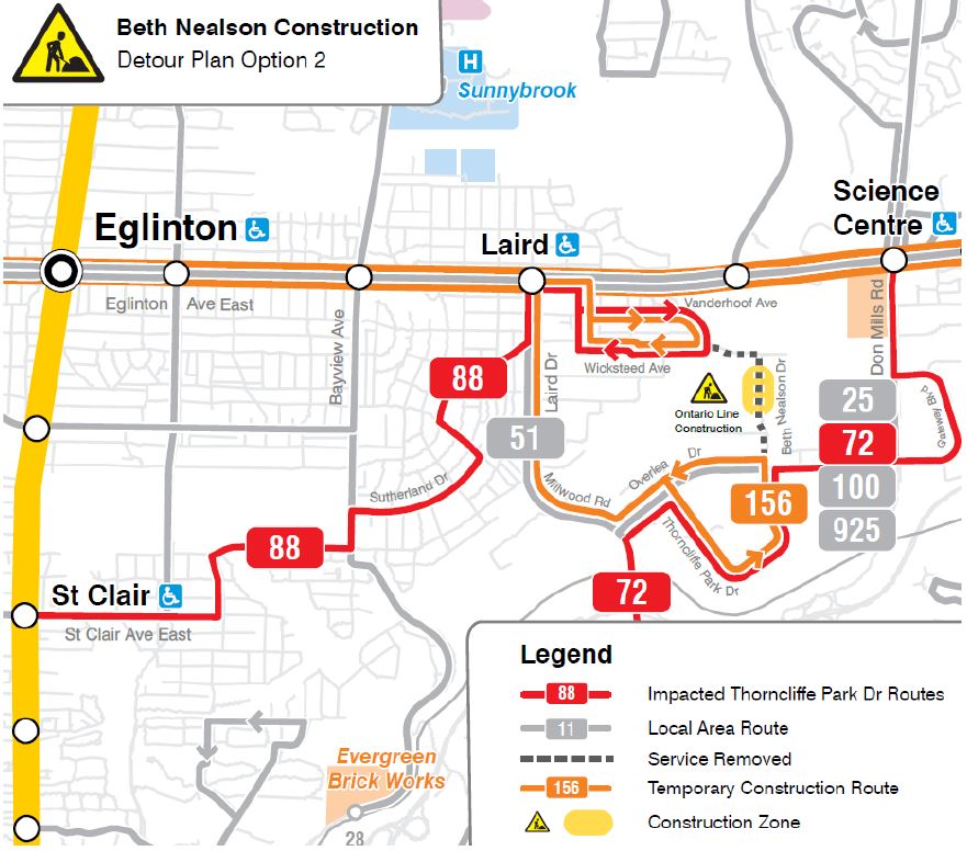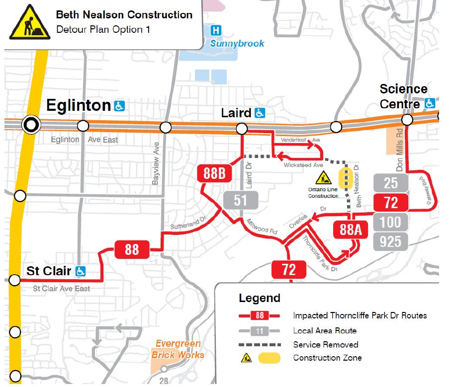 In 2025, Beth Nealson Drive which links Thorncliffe Park to the Leaside industrial area will close for Ontario Line construction. This will require a split in the existing loop of the 88 South Leaside service. There are two proposals for this change.