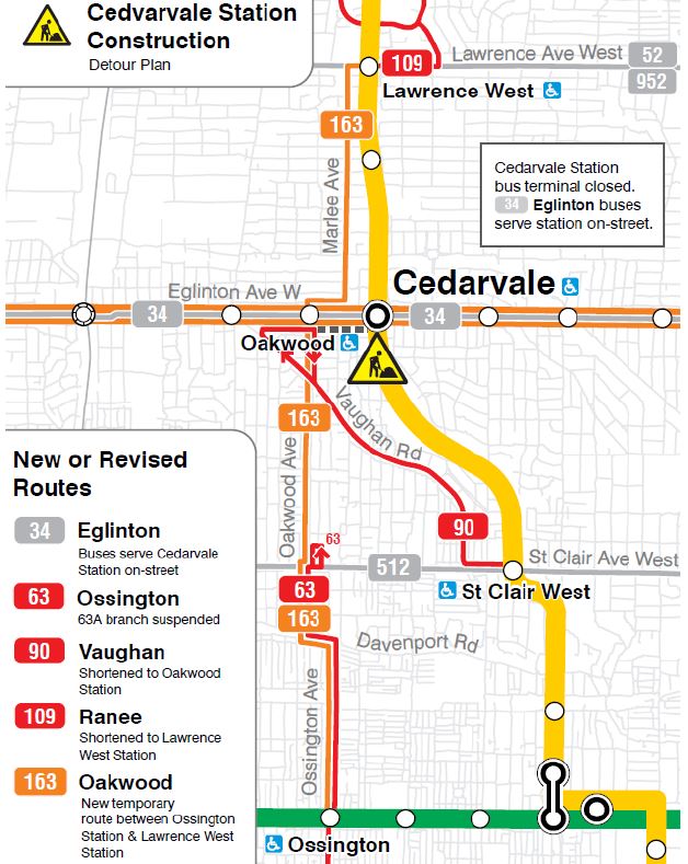 • Route 163 Oakwood will operate from Ossington Station to Lawrence West Station replacing the 63A and the south end of 109 Ranee.