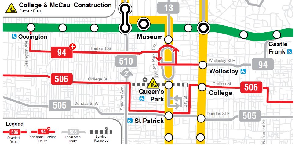 Streetcar track will be replaced at the College & McCaul intersection. During this work, 506 Carlton cars will divert both ways via Bay, Dundas and Spadina, and there will be no service on College between Bay and Spadina. Service on 94 Wellesley will be improved to provide additional capacity in the area.