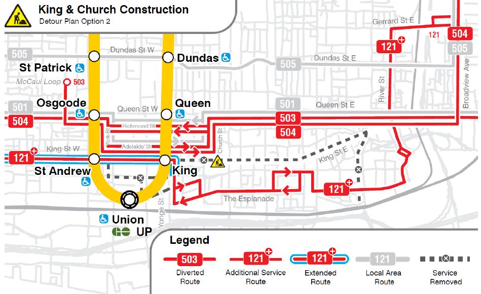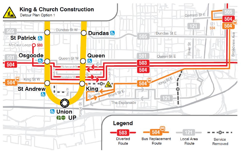 • Service on King would be provided by a 504 bus running east to Broadview and north to Gerrard (using the same route as the existing 501B Queen shuttle bus). 504 buses would divert around the construction zone via Jarvis, Wellington/Front and Yonge.