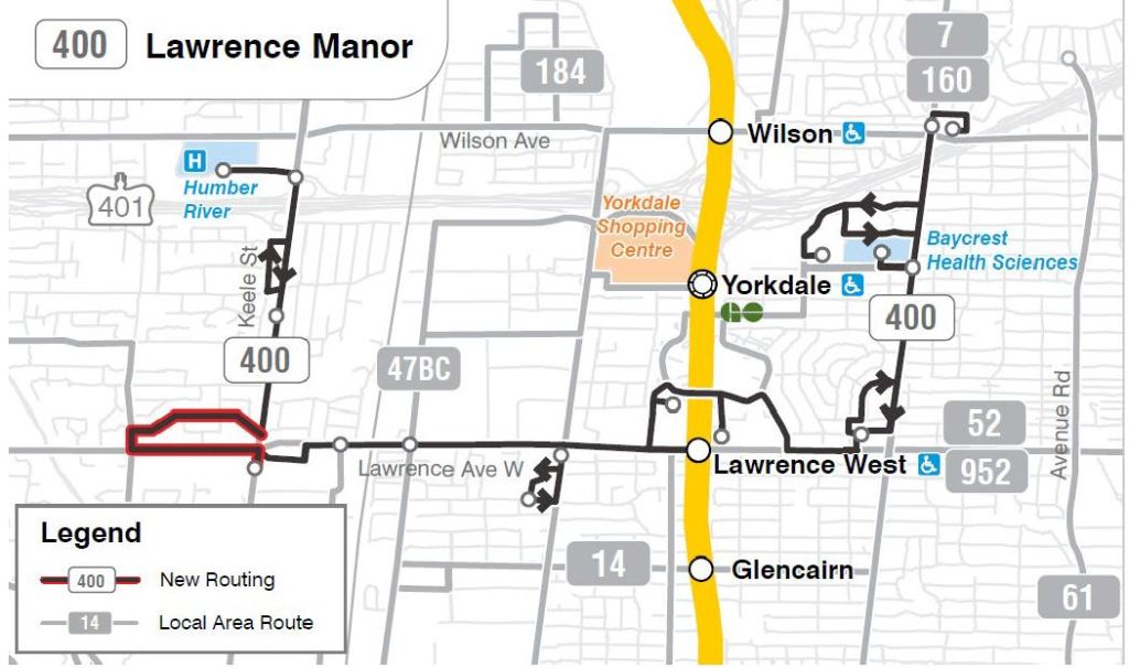 The proposed extension would create a loop via Lawrence, Culford and Wyndale to serve Amesbury Sports Complex, Amesbury Park, and the Amesbury Park Toronto Public Library.