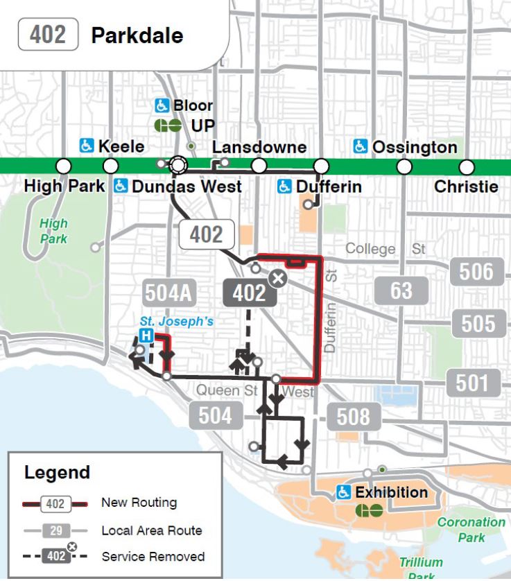 The route would be changed between College and Queen Streets to operate via Dufferin rather than via Lansdowne. Service around the loop via Macdonell would be removed. At Sunnyside, the loop would be expanded to the west side of St. Joseph’s Hospital returning east via Pearson to Roncesvalles rather than Sunnyside.