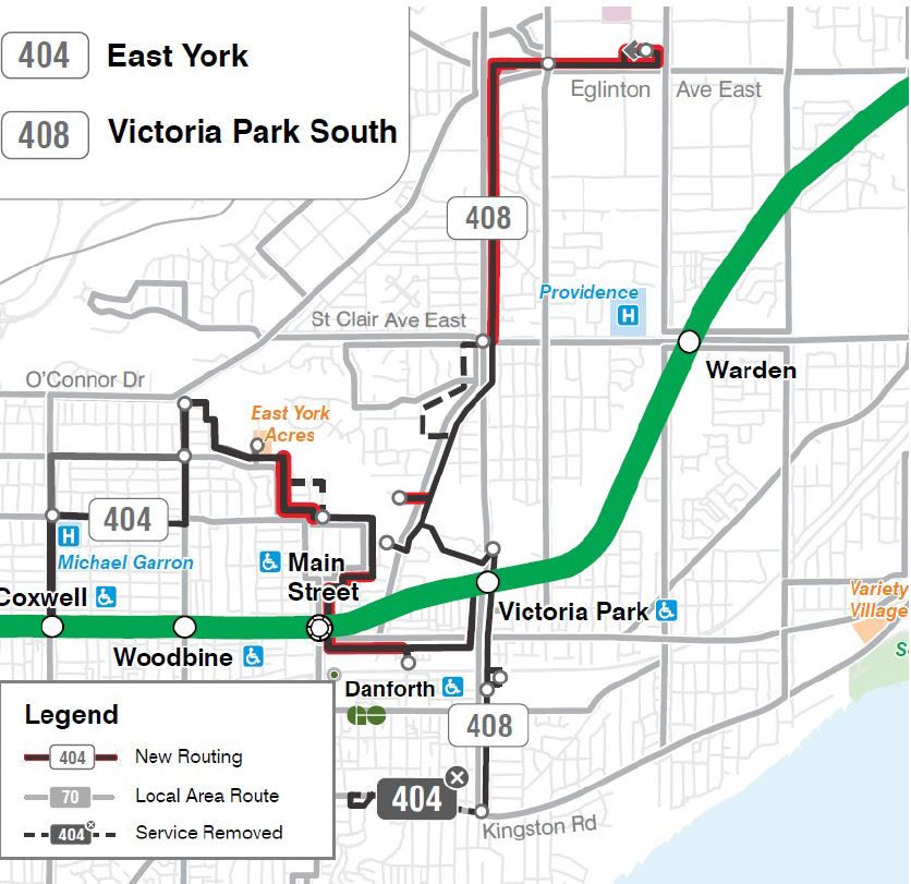 404 East York would operate via a revised route between Coxwell and Victoria Park Stations serving Main Street Station enroute. Service on Kingston Road west of Victoria Park would be removed.