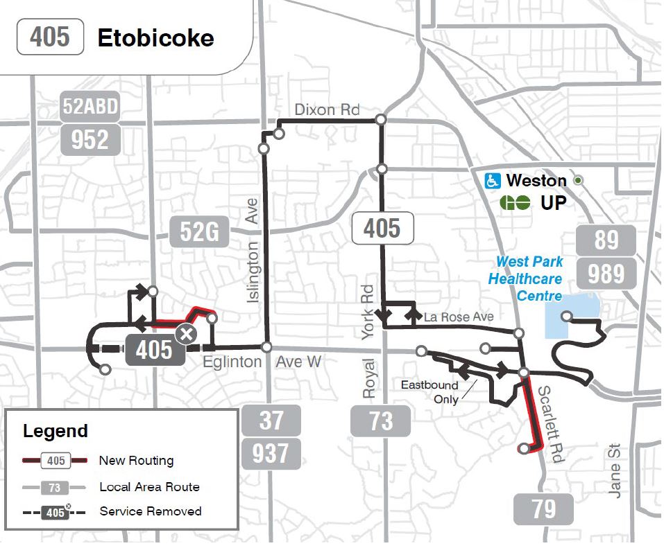 405 Etobicoke would be rerouted at its west end via Widdicombe Hill rather than Eglinton, and extended south on Scarlett Road to serve Lambton Square.