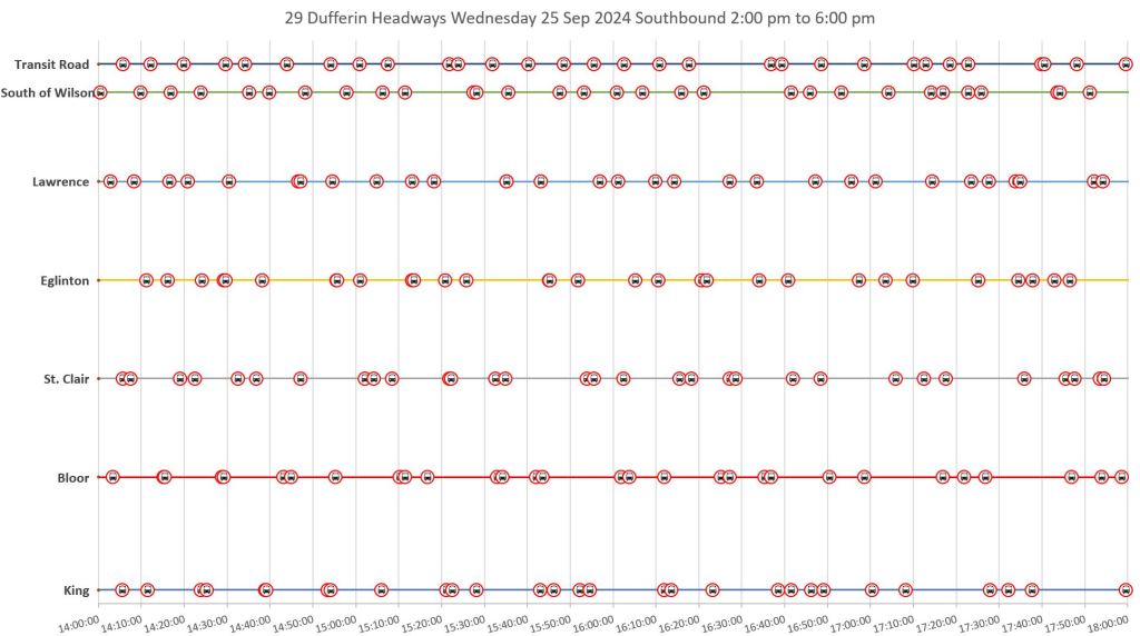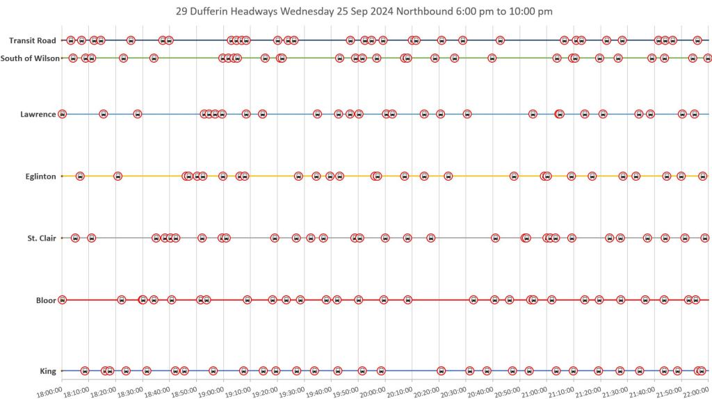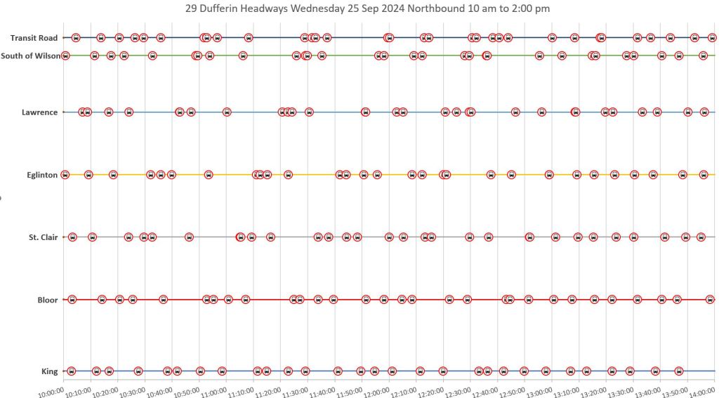 Steve: A point I didn’t mention is that the buses on the 25th seemed to be getting reasonable layover times at Dufferin Loop. The problem is not a too-tight schedule, but that they leave in packs.