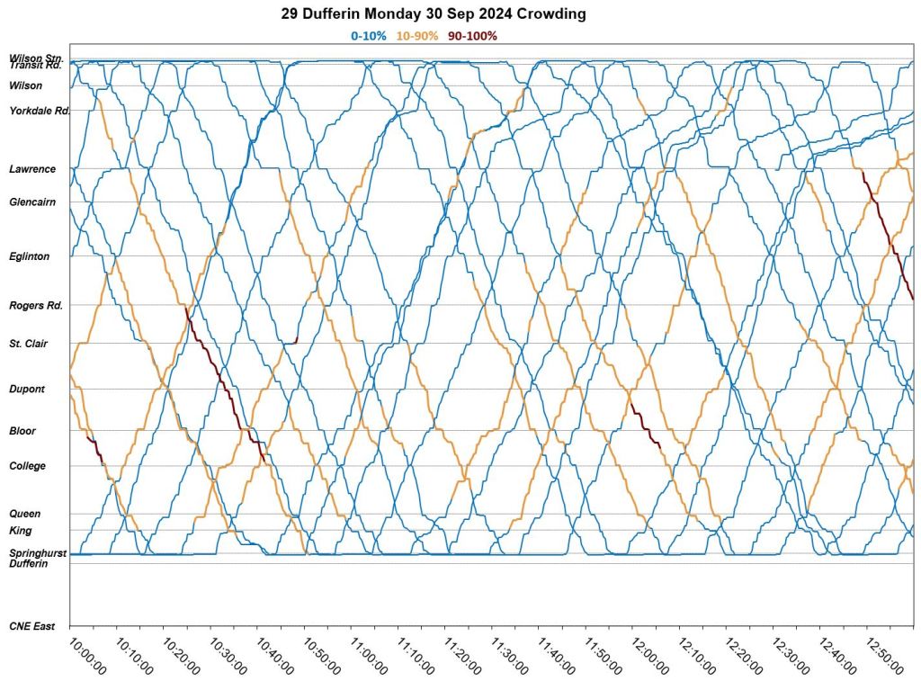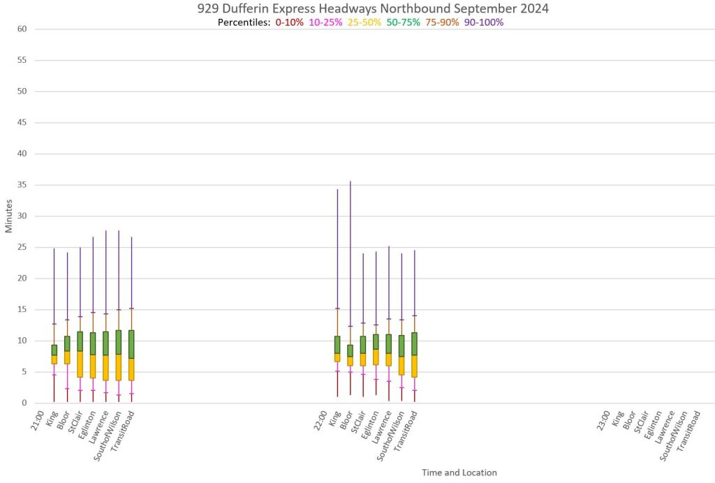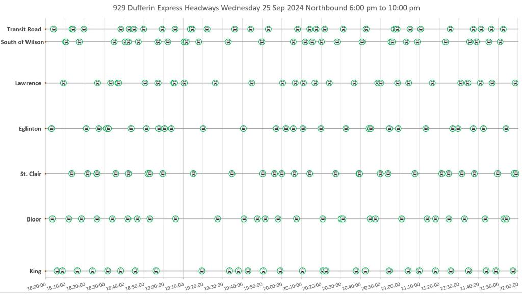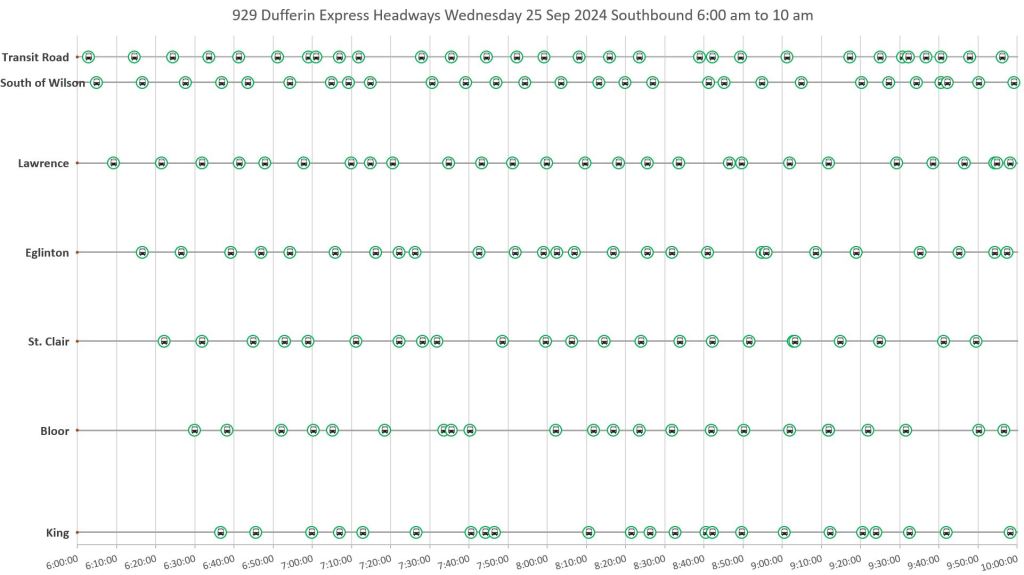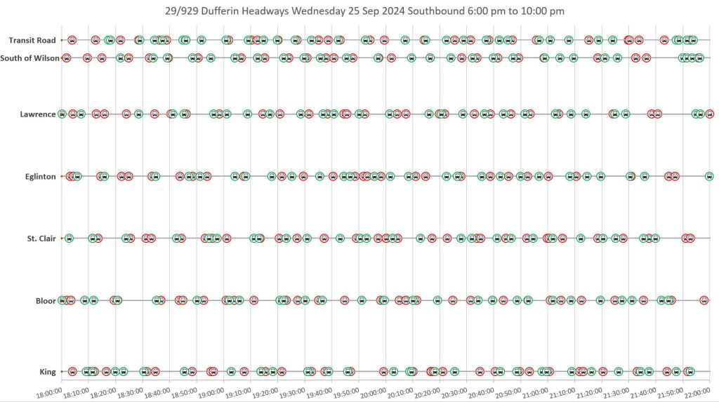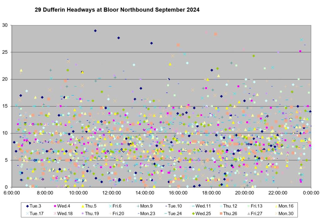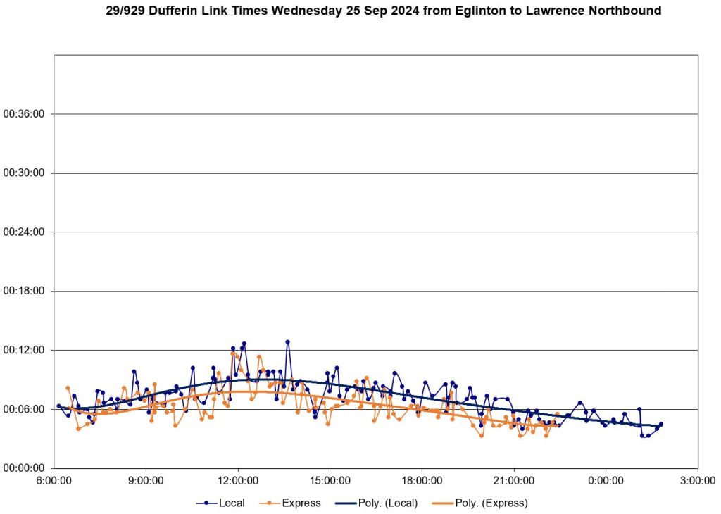 Long-time readers will recognize the chart formats below. I have included them to show yet another presentation, and the one which I used in articles over several years. Each chart has its own strengths and weaknesses. I have included only the 29 Dufferin local data to illustrate how it behaves, but the 929 Express data are similar.