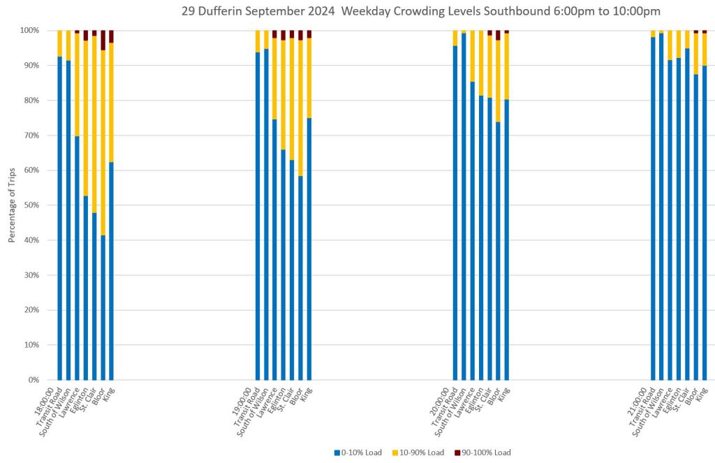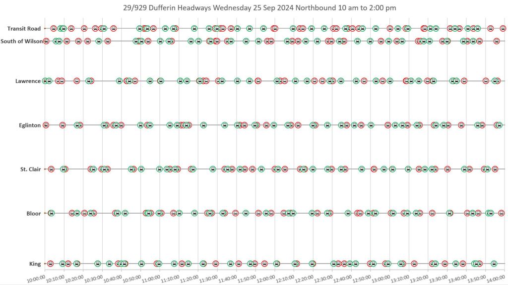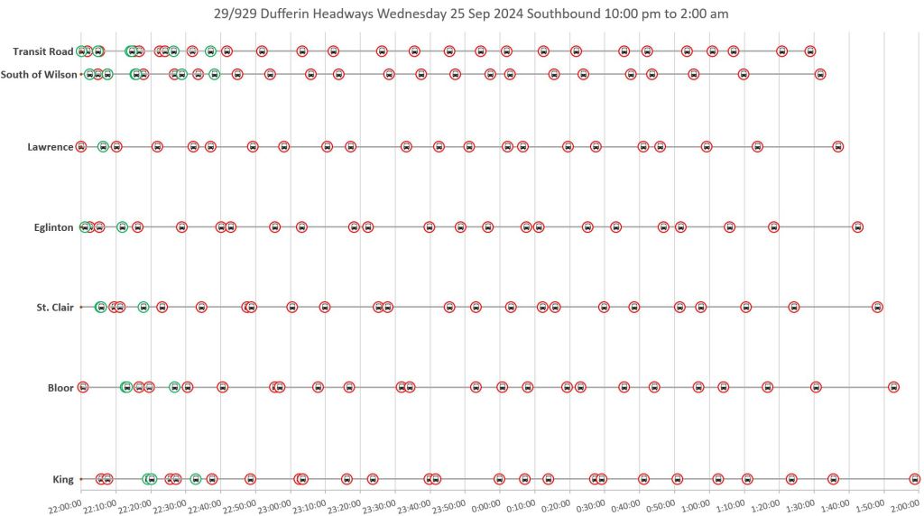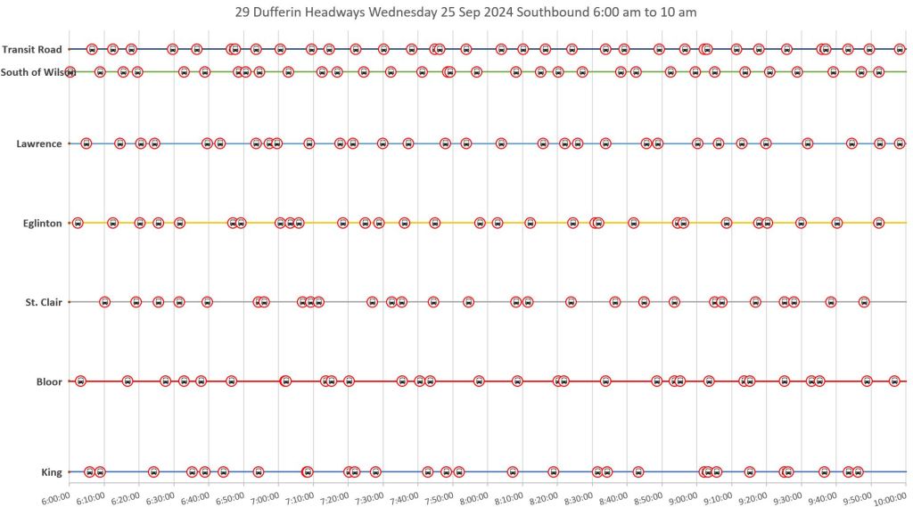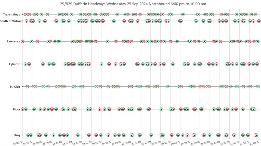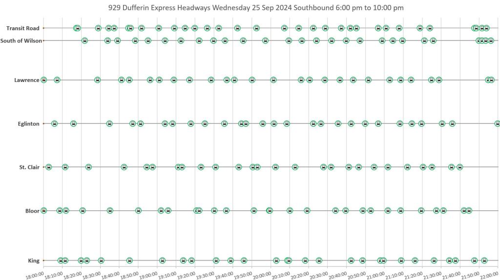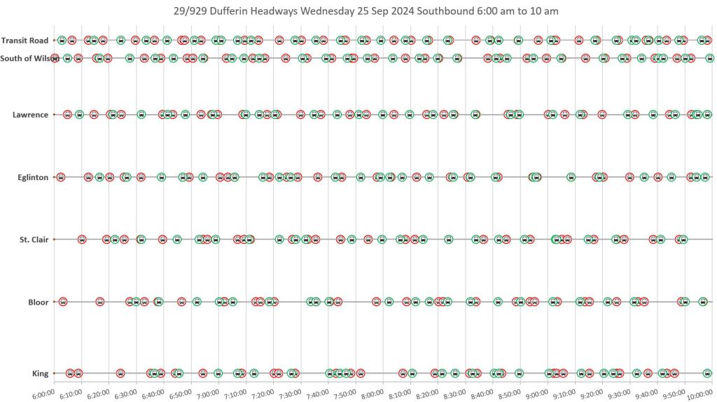 Long-time readers will recognize the chart formats below. I have included them to show yet another presentation, and the one which I used in articles over several years. Each chart has its own strengths and weaknesses. I have included only the 29 Dufferin local data to illustrate how it behaves, but the 929 Express data are similar.
