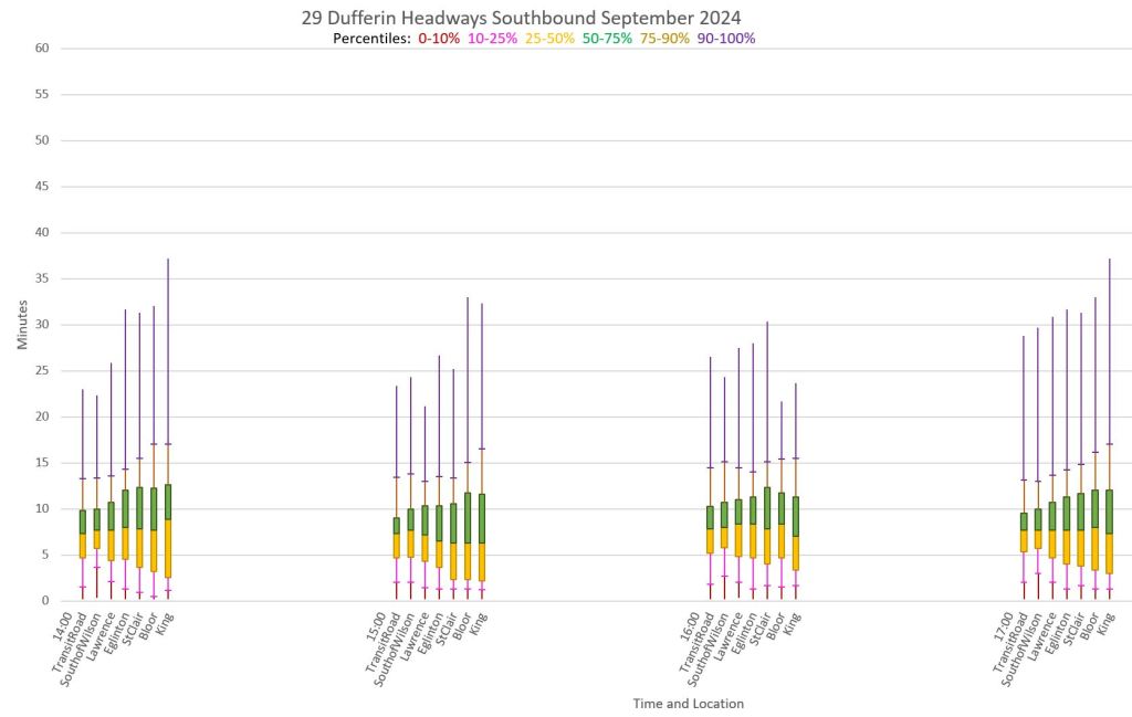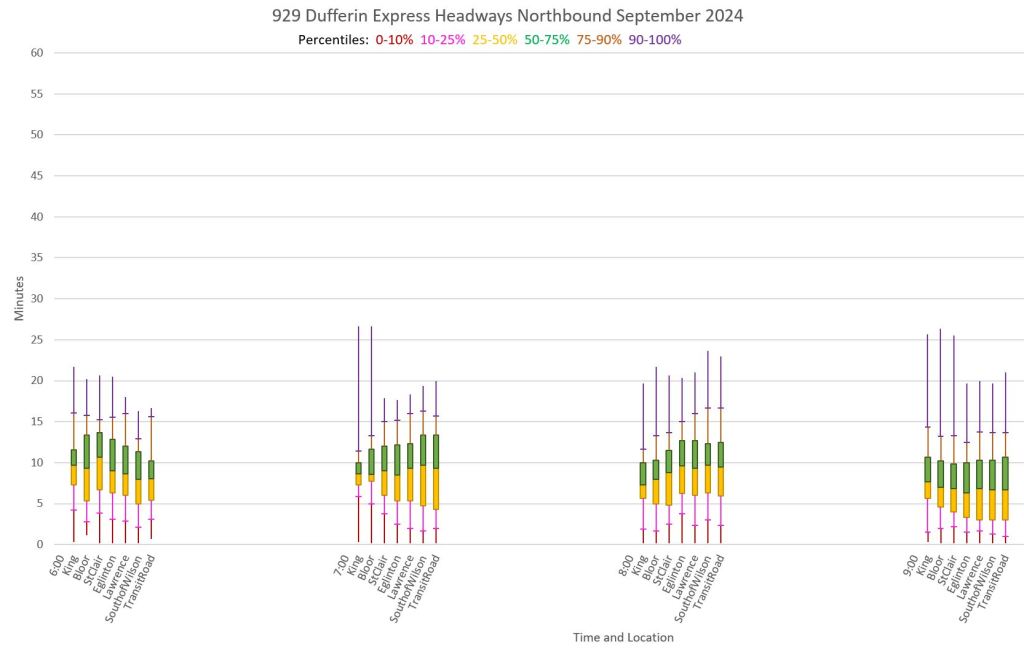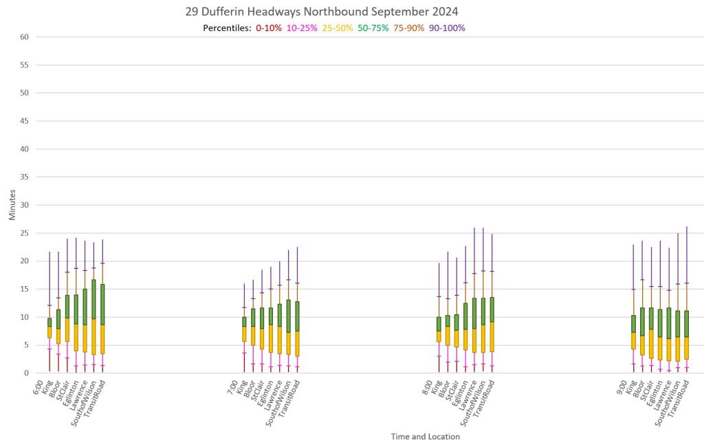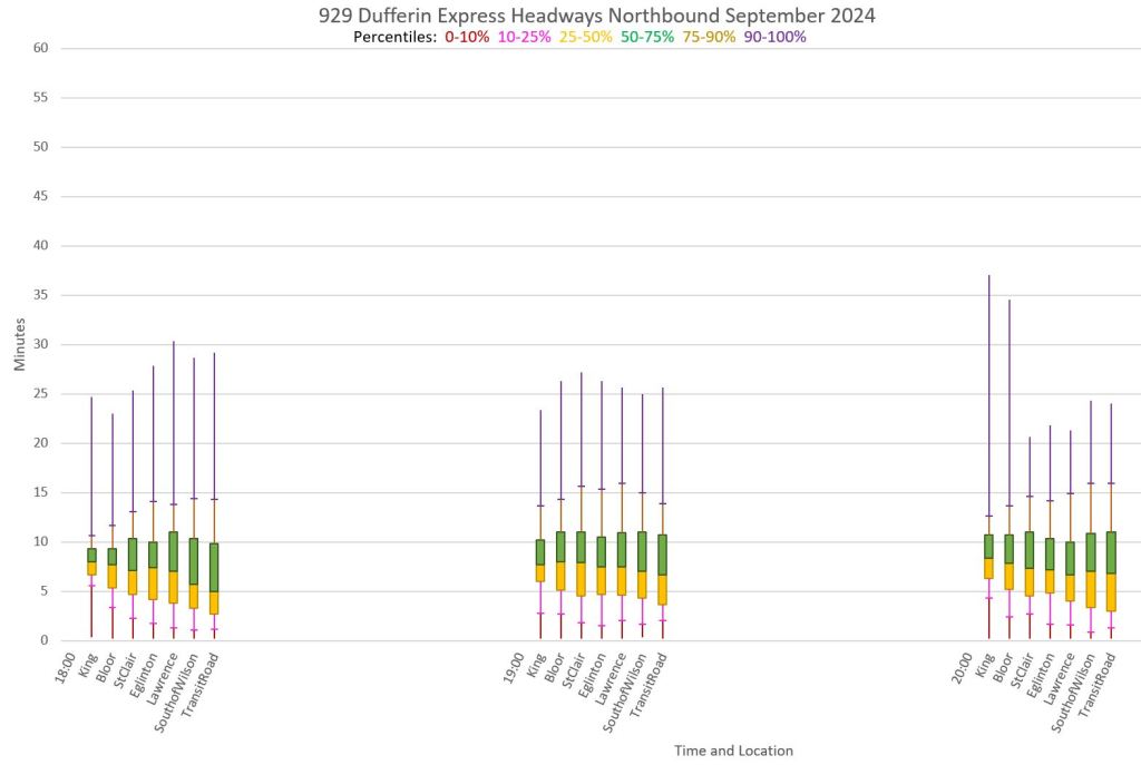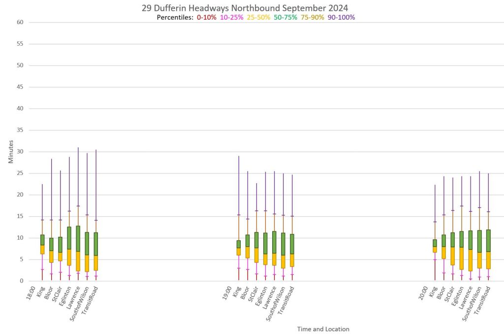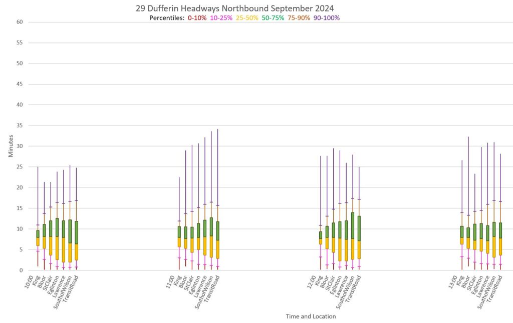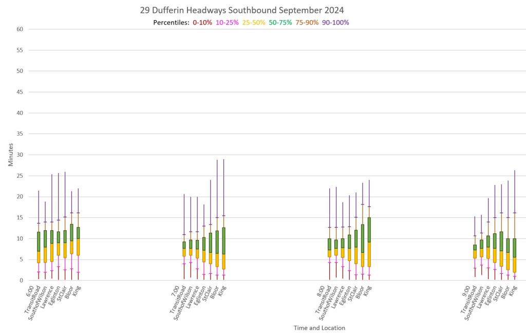 Putting it another way, the span between the lower bar at the 10th percentile and the upper bar at the 90th encompasses 80% of the service. Only rarely is this anywhere near close to the TTC’s 6-minute variation to “on time” in the standards.