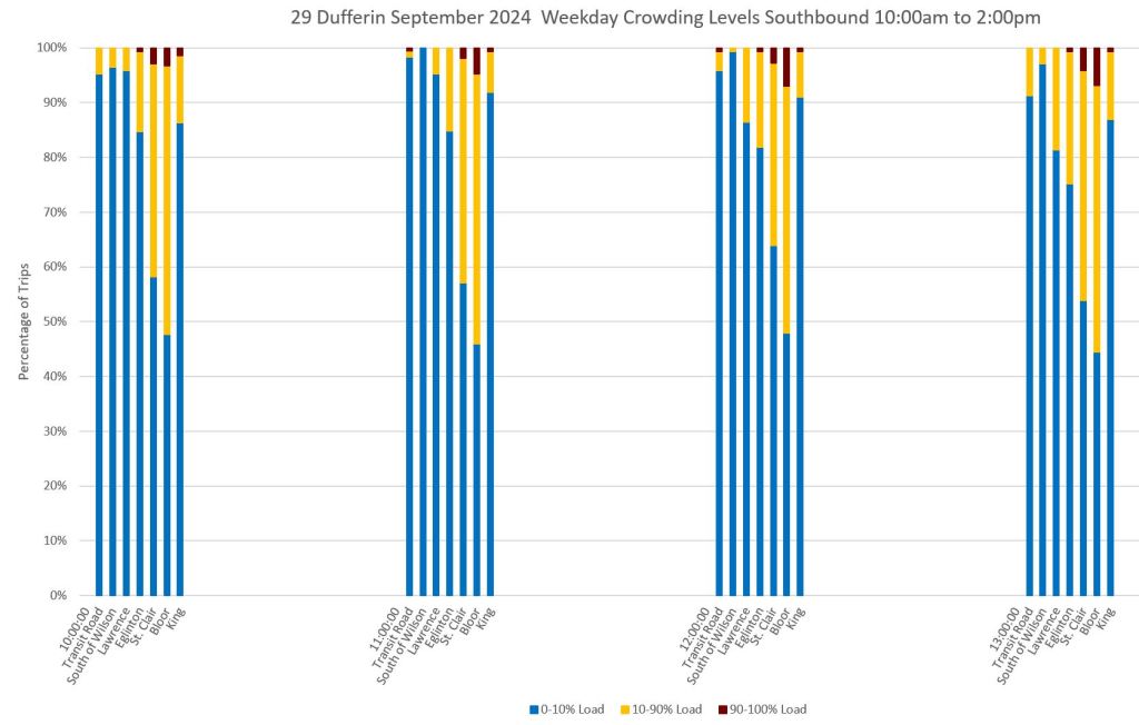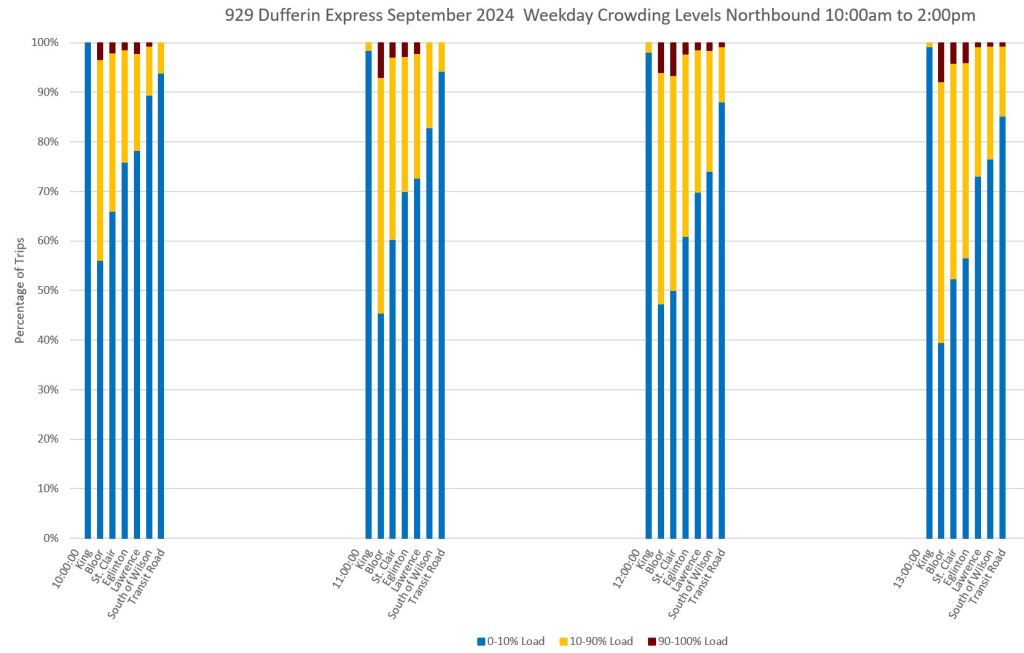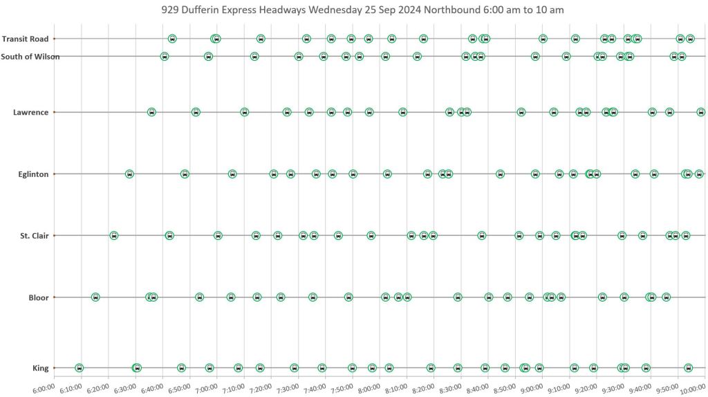 The scheduled service levels for the local and express branches on Dufferin are shown below. Note that the service design is for articulated buses in all periods.