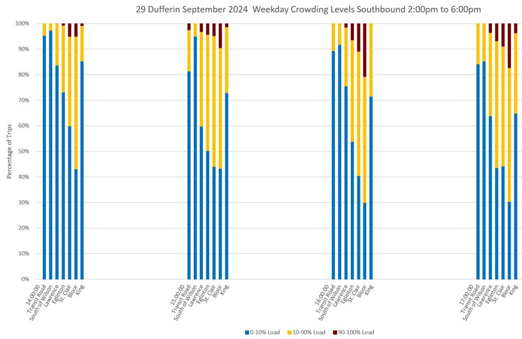 Although the number of crowded buses might be a small portion of the total, they have more passengers on them. (I hope to get a more fine-grained breakdown of crowding levels from the TTC so that the yellow 10-90% band can be subdivided at least into seated and standing load ranges.)
