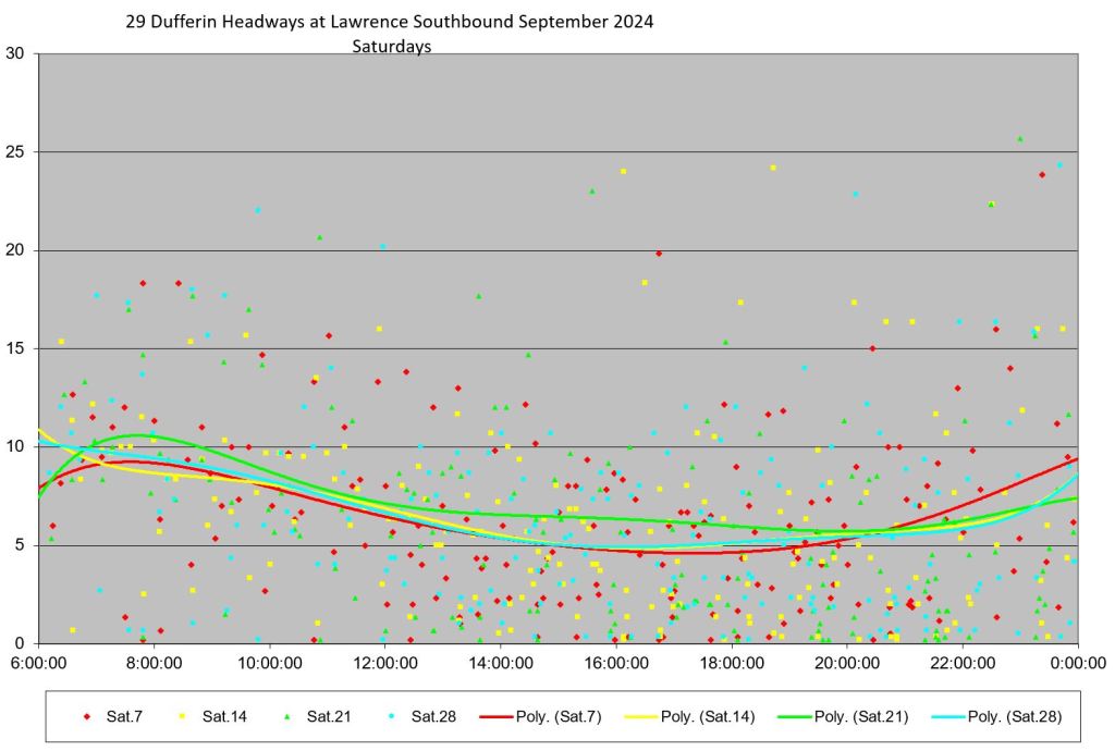 Weekends are not much better. The charts below show the raw data points for all Saturdays and Sundays (Labour Day is included as a “Sunday”) with trend lines interpolated through each day’s data. As on weekdays, the spread of values is much wider than one would hope for with reliable service.